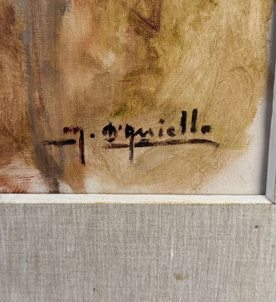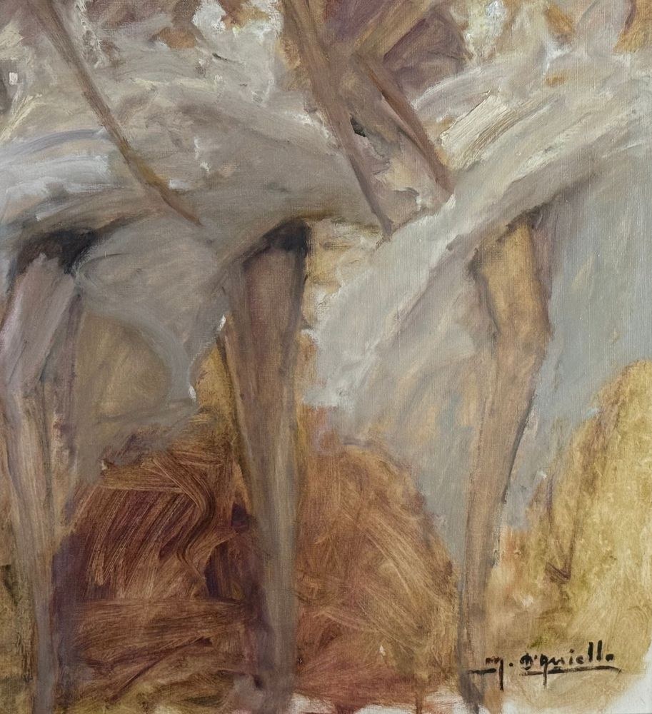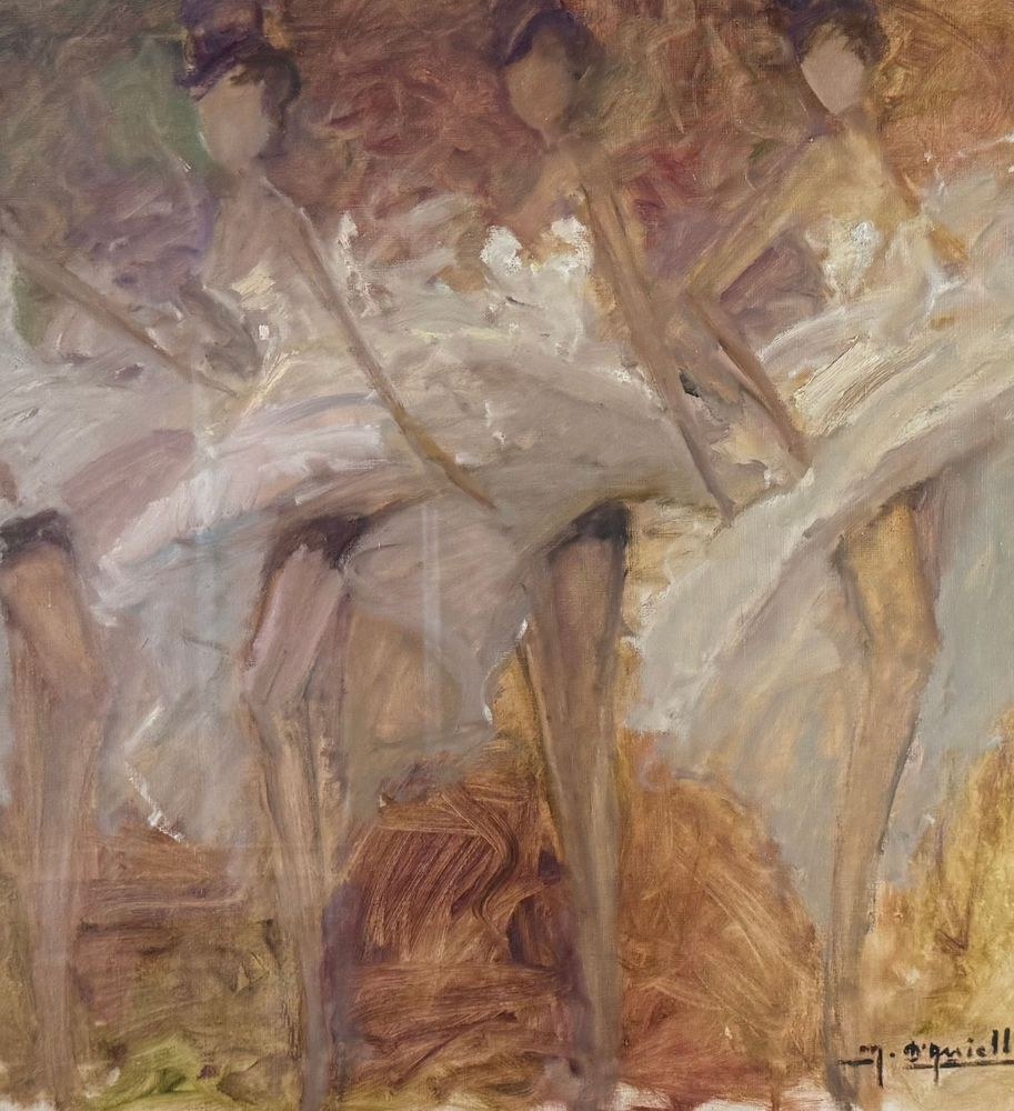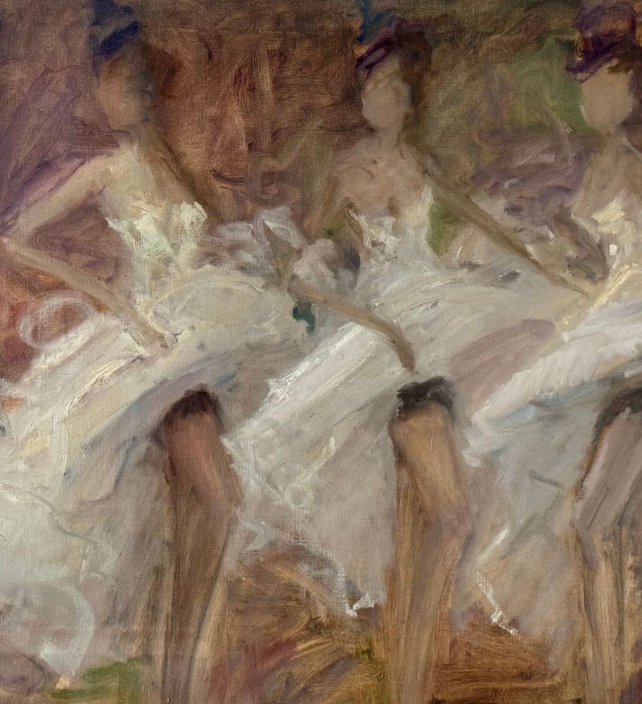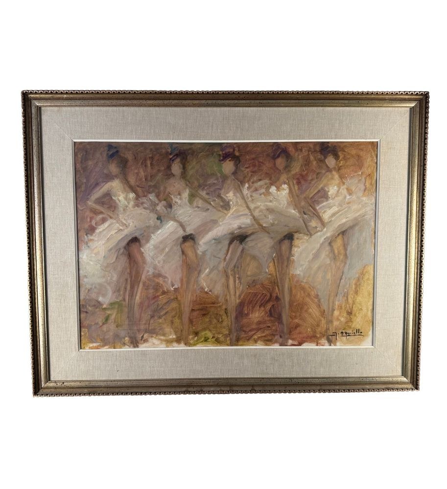 Oil painting on canvas, Italian school, 20th century, depicting five ballerinas. Dimensions including frame: 93x122 cm. Dimensions inside the frame: 67x97 cm. Signed lower right: Michele D'Aniello. The artwork is in good condition.