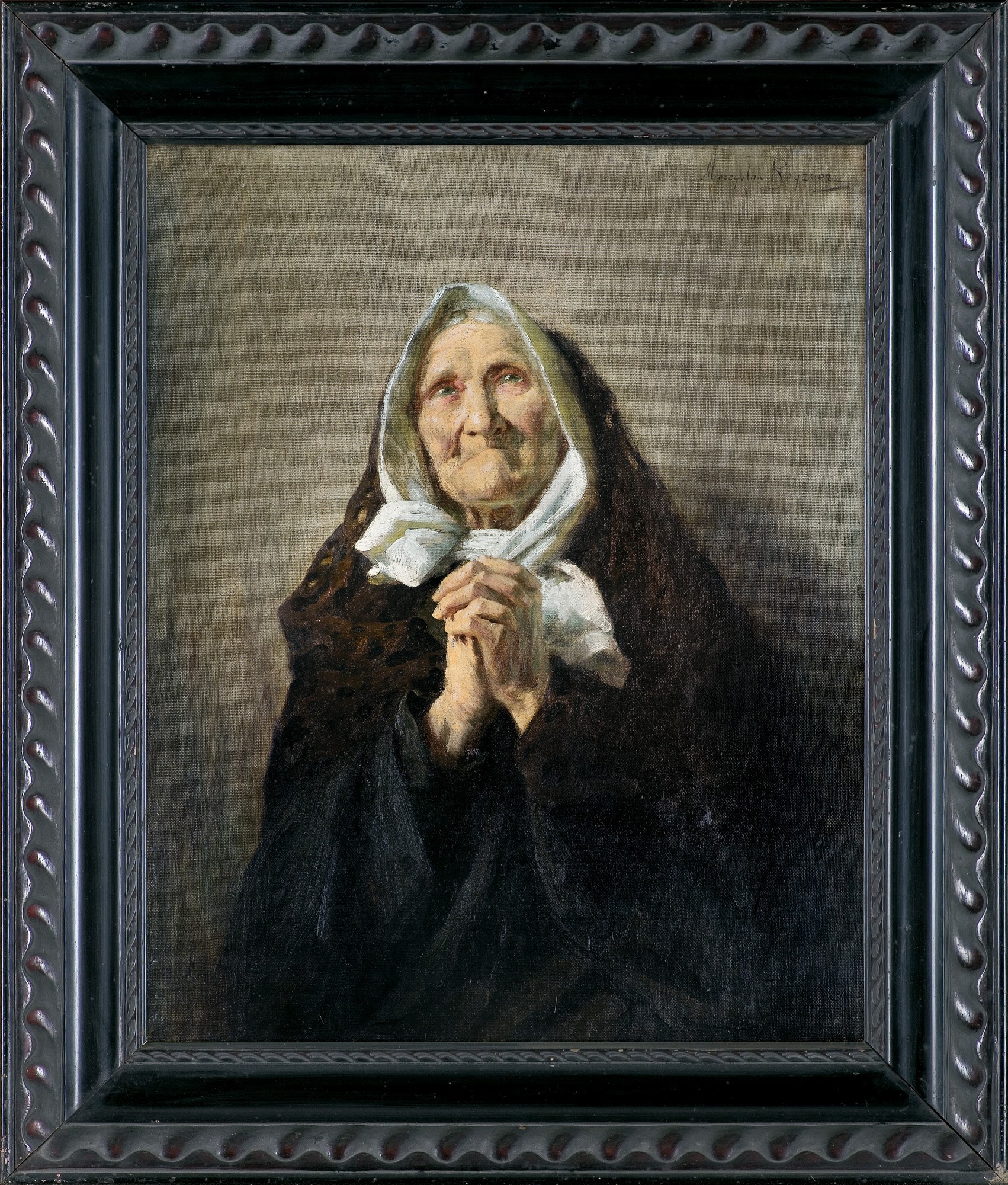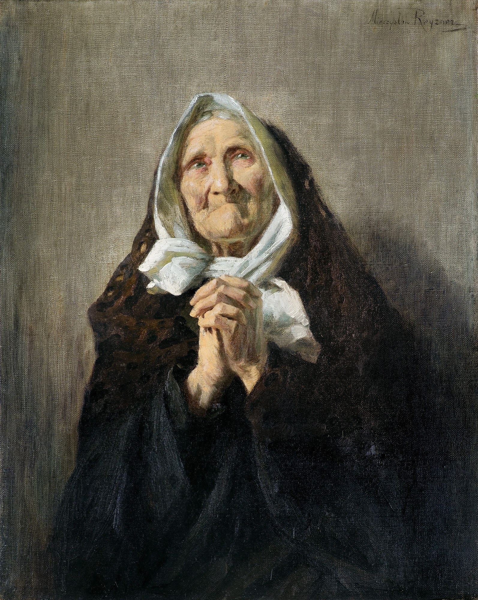 W latach 1888-1896 Mieczysław Reyzner działał w Paryżu, gdzie miał reprezentacyjną pracownię w pobliżu Ogrodu Luksemburskiego. Artysta cieszył się popularnością jako utalentowany pejzażysta – ale przede wszystkim portrecista, ze szczególnym upodobaniem oddający delikatne karnacje młodych kobiet. Stąd też niemałym zaskoczeniem był wizerunek modlącej się staruszki, który Reyzner zaprezentował na Salonie w 1892 roku. Tchnący spokojem, zachwycający realizmem wizerunek pogrążonej w modlitwie kobiety, został doceniony przez jury, które przyznało artyście mention honorable. Niewątpliwie przypadł też do gustu szerokiej publiczności, gdyż obraz ten otworzył zaliczany dziś do oeuvre artysty cykl modlących się staruszek. Oferowane dzieło powstało krótko po wielkim sukcesie Reyznera, który zyskał sobie miano „malarza starości“, o czym pisze Agnieszka Kluczewska-Wójcik (Agnieszka Kluczewska-Wójcik, Polskie malarstwo rodzajowe przełomu XIX i XX wieku, Instytut Historii Sztuki UW, Warszawa 2002, s. 143–147). Cykl stanowi rodzaj malarskiej medytacji nad upływem czasu, pokorą, duchowością i ludowym katolicyzmem. Staruszki Reyznera to nie tylko realistycznie ujęte postaci – są alegoriami przemijania, wiary i ludzkiej wytrwałości. Cykl ten można interpretować jako malarski esej o starości i religijności, ale także jako zapis duchowego pejzażu polskiej prowincji przełomu wieków. Reyzner nie idealizował swoich postaci, ale obdarzał je godnością i powagą, często zbliżając się do estetyki ikon.