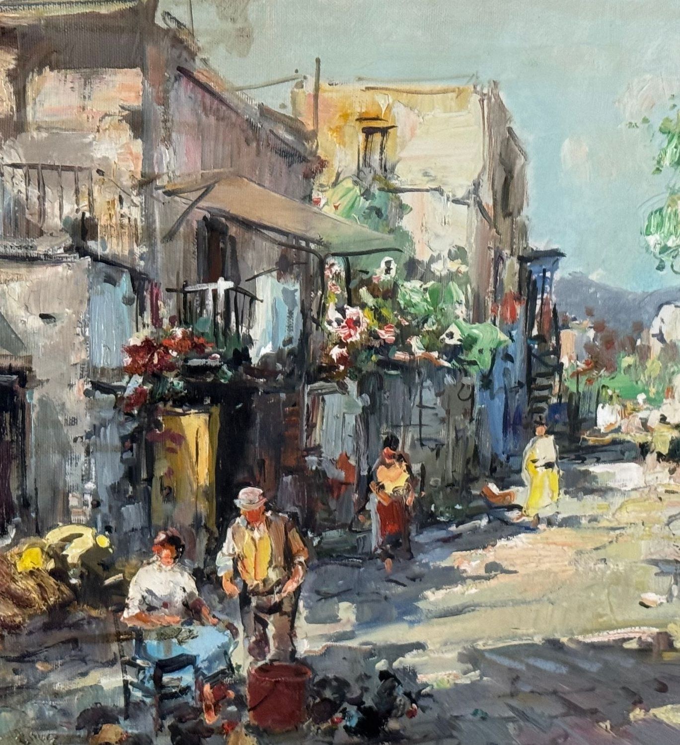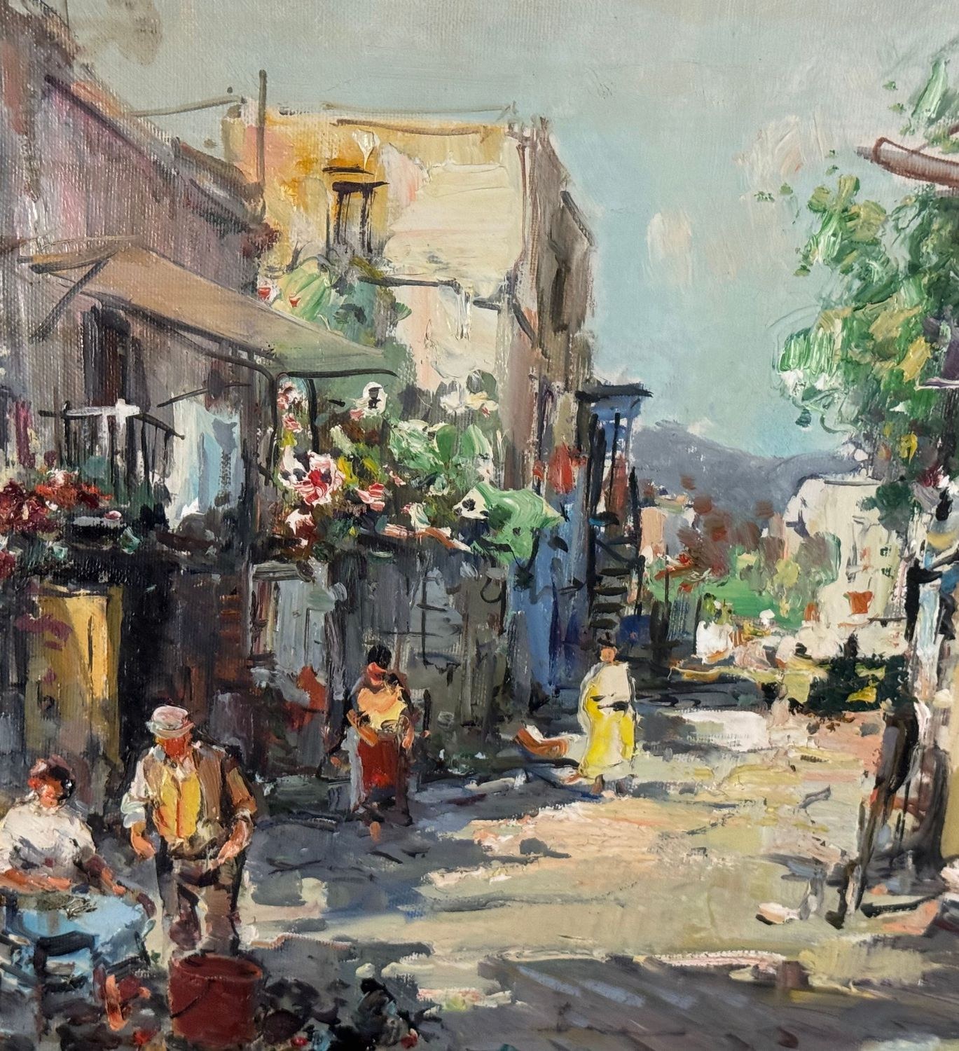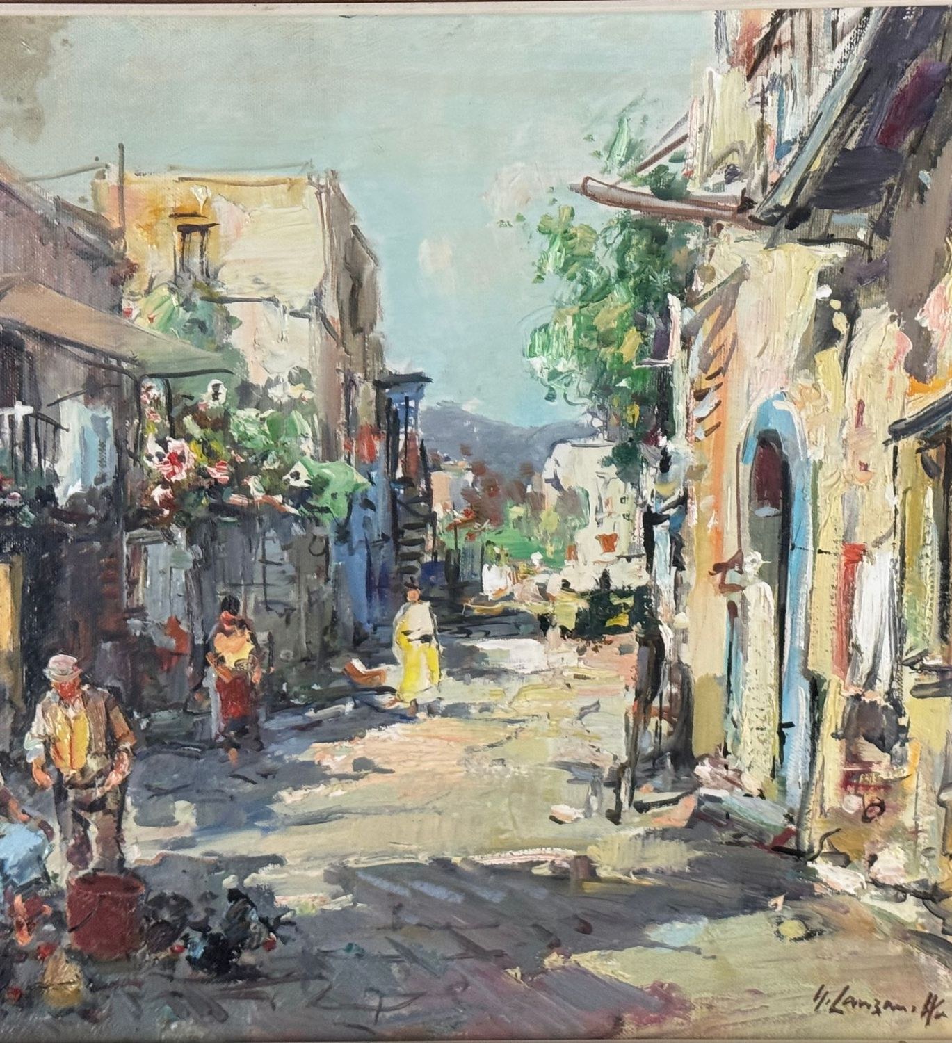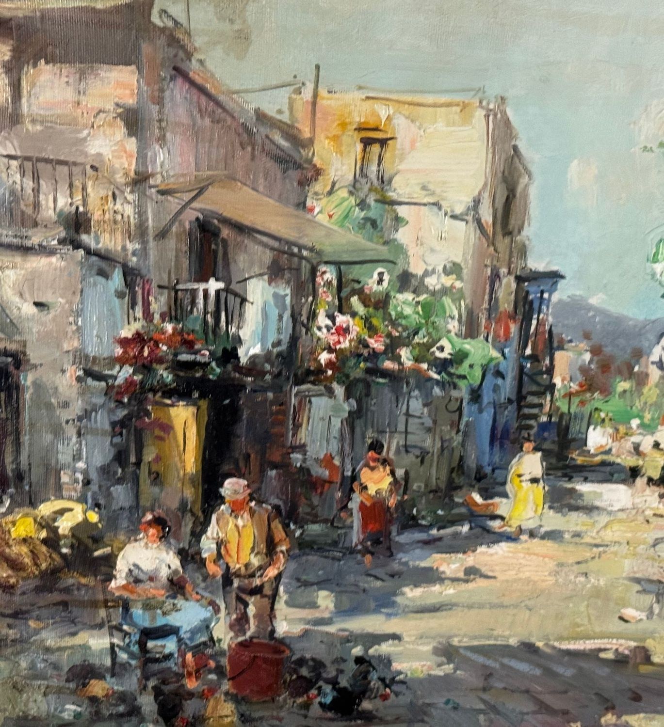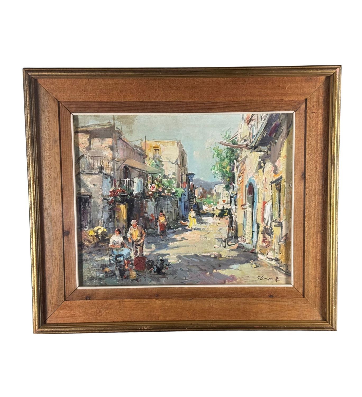 Oil painting on canvas, 20th century Italian school, depicting a suburban street with figures. Dimensions including frame: 68x58 cm. Inner frame dimensions: 50x40 cm. Signed lower right by Nicola Canzanella. Work in good condition.