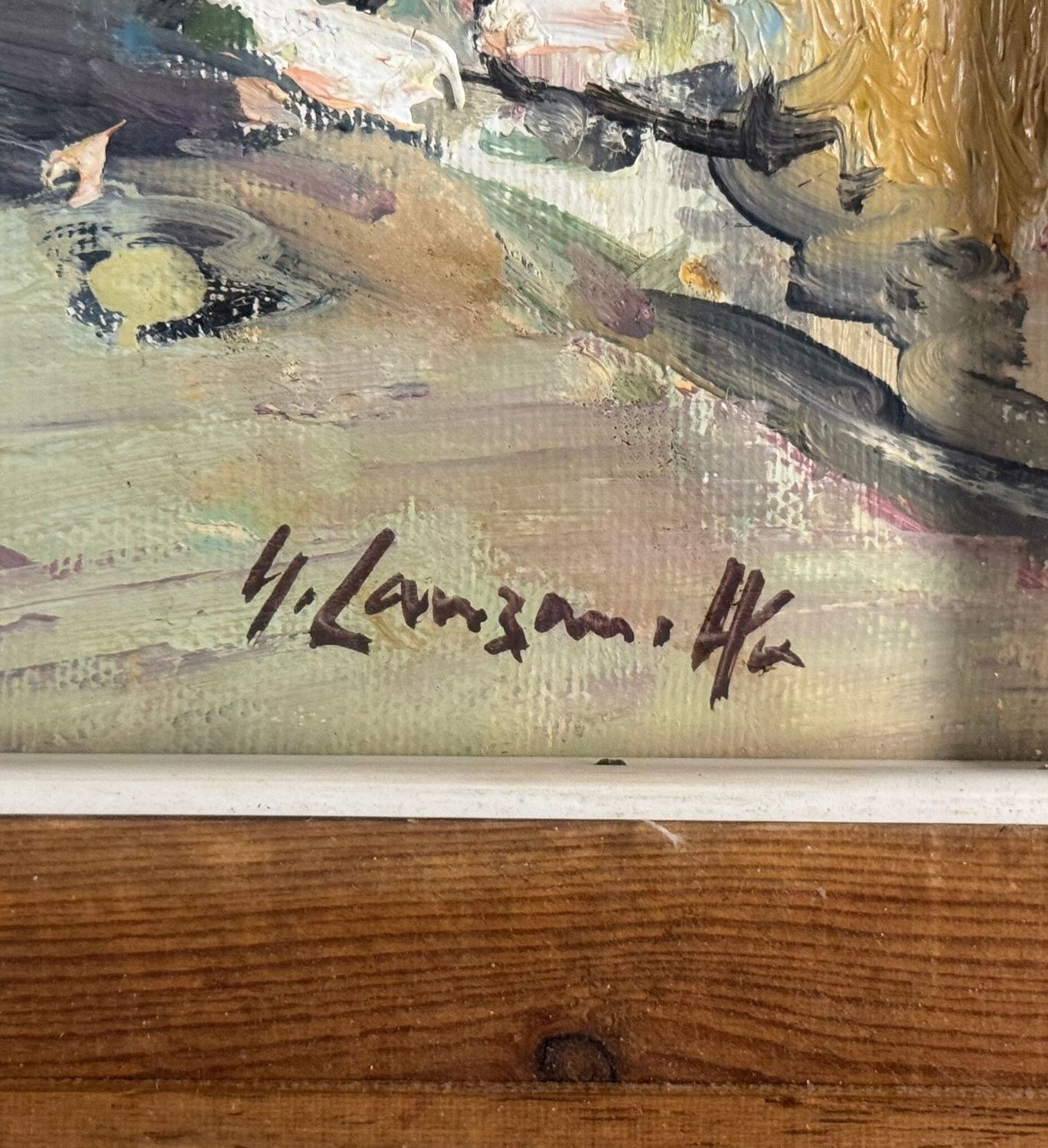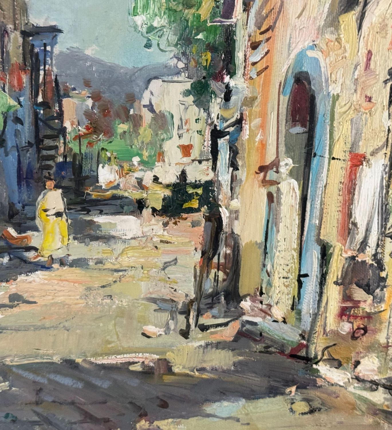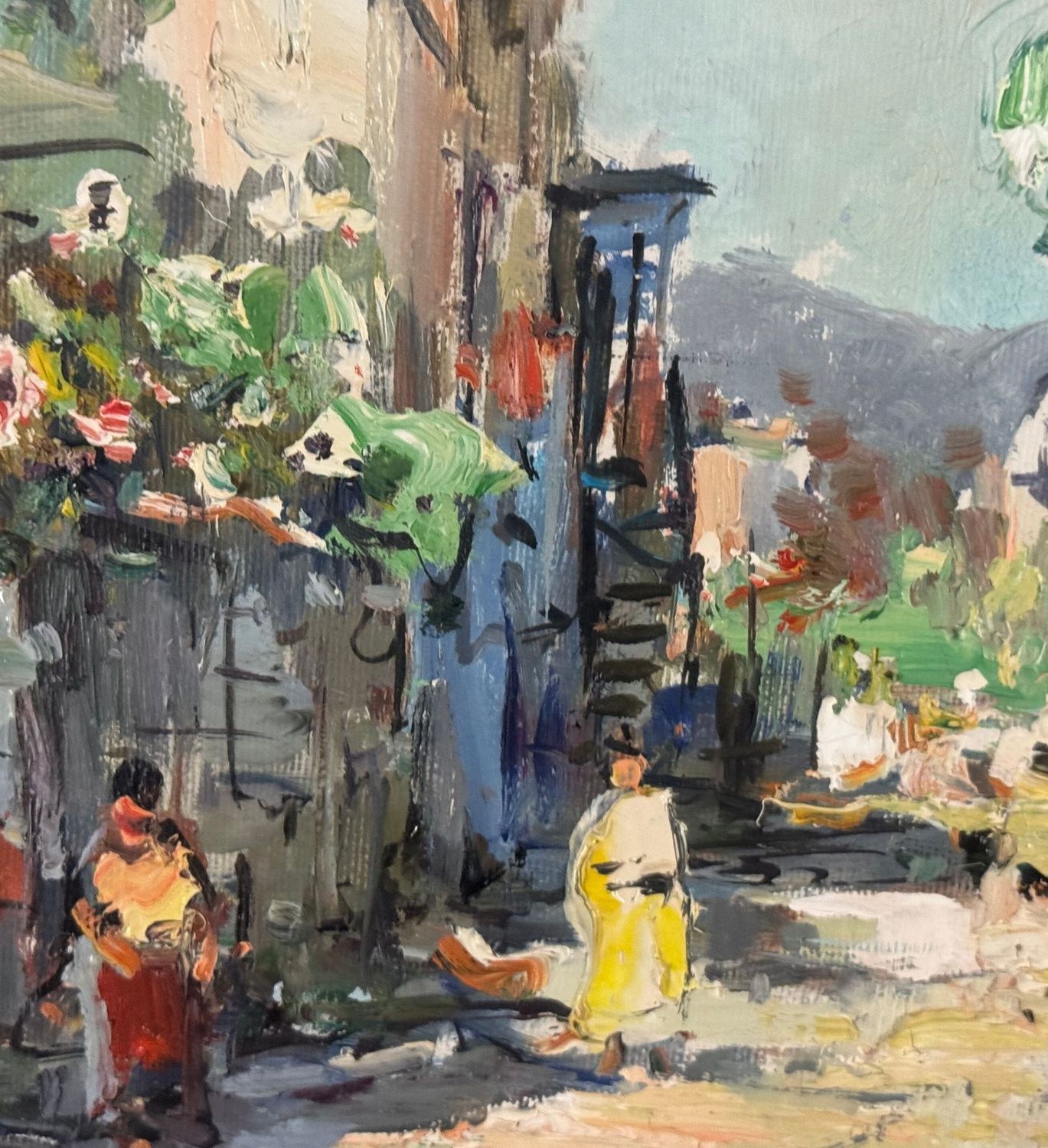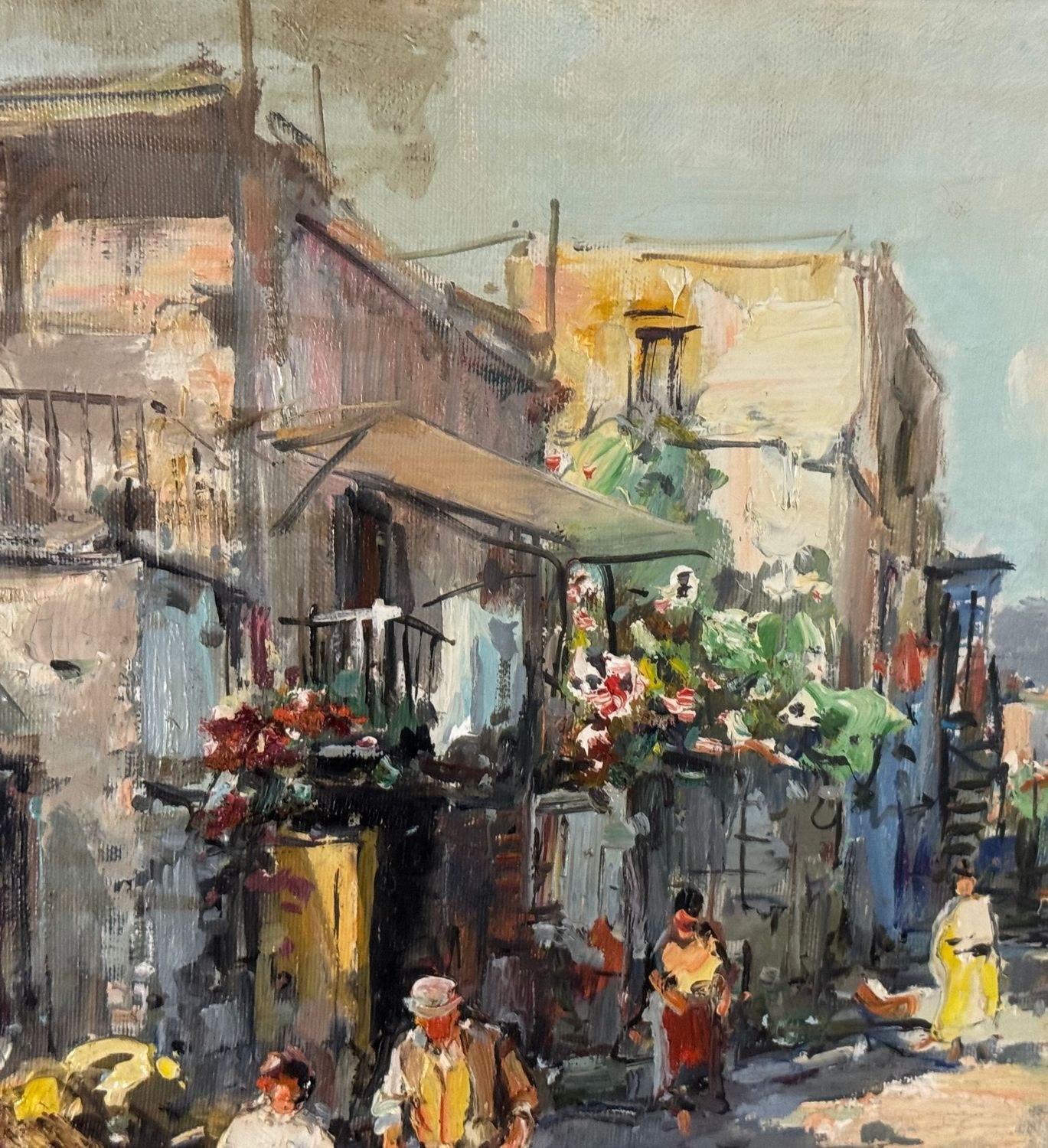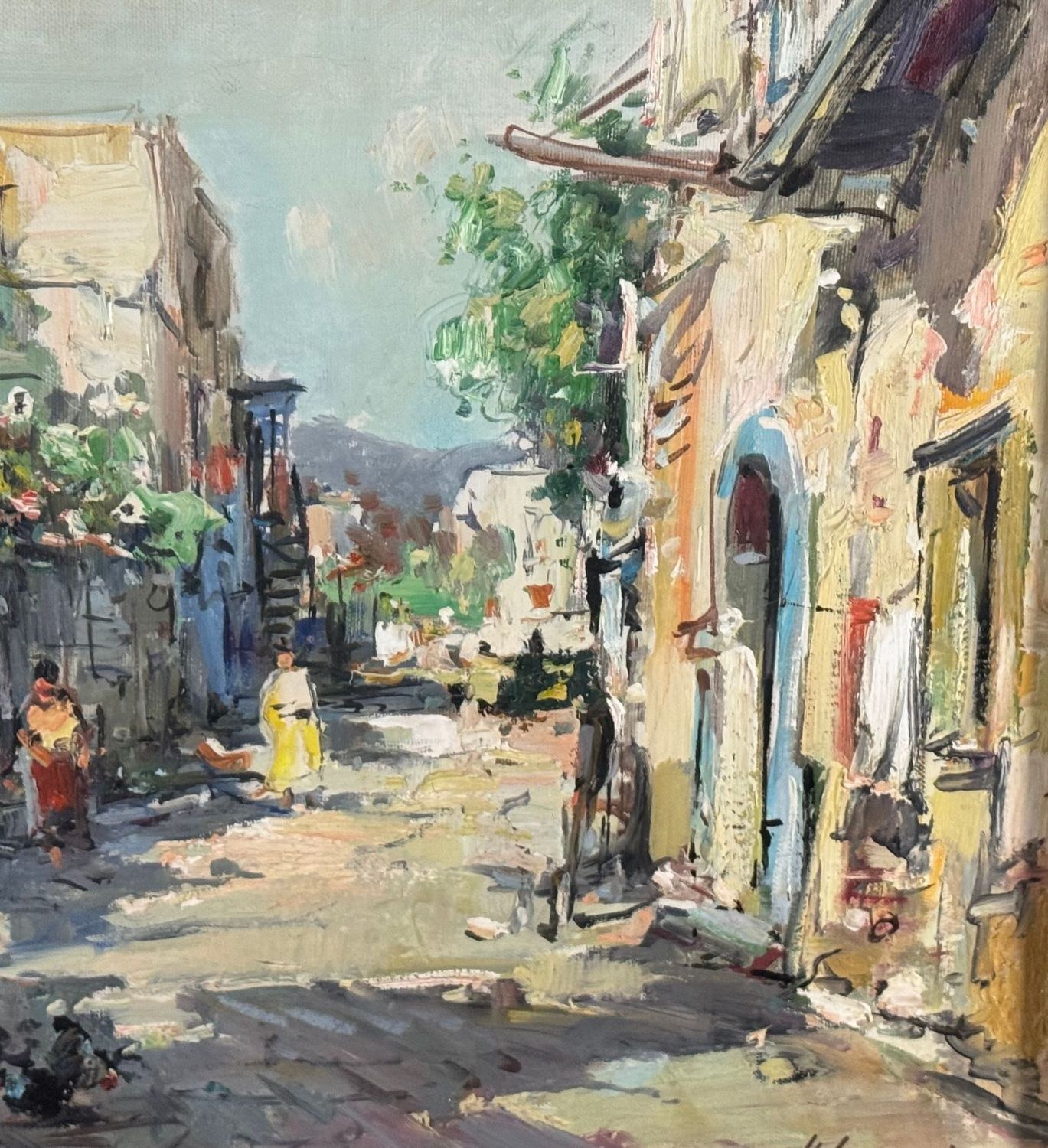 Oil painting on canvas, 20th century Italian school, depicting a suburban street with figures. Dimensions including frame: 68x58 cm. Inner frame dimensions: 50x40 cm. Signed lower right by Nicola Canzanella. Work in good condition.