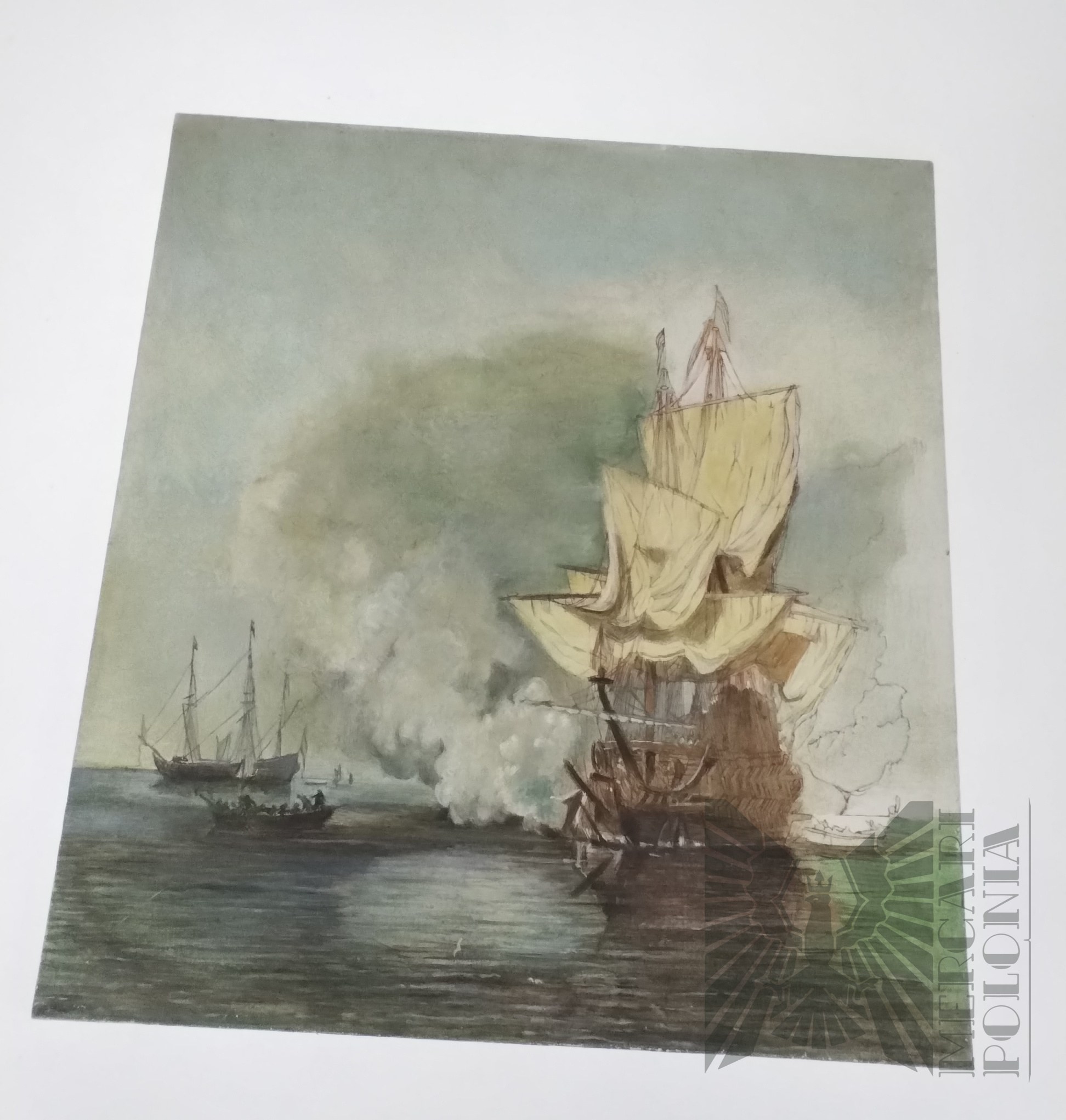 Obraz przedstawiający morską scenę, najprawdopodobniej bitwę rozgrywaną na pomiędzy statkami.