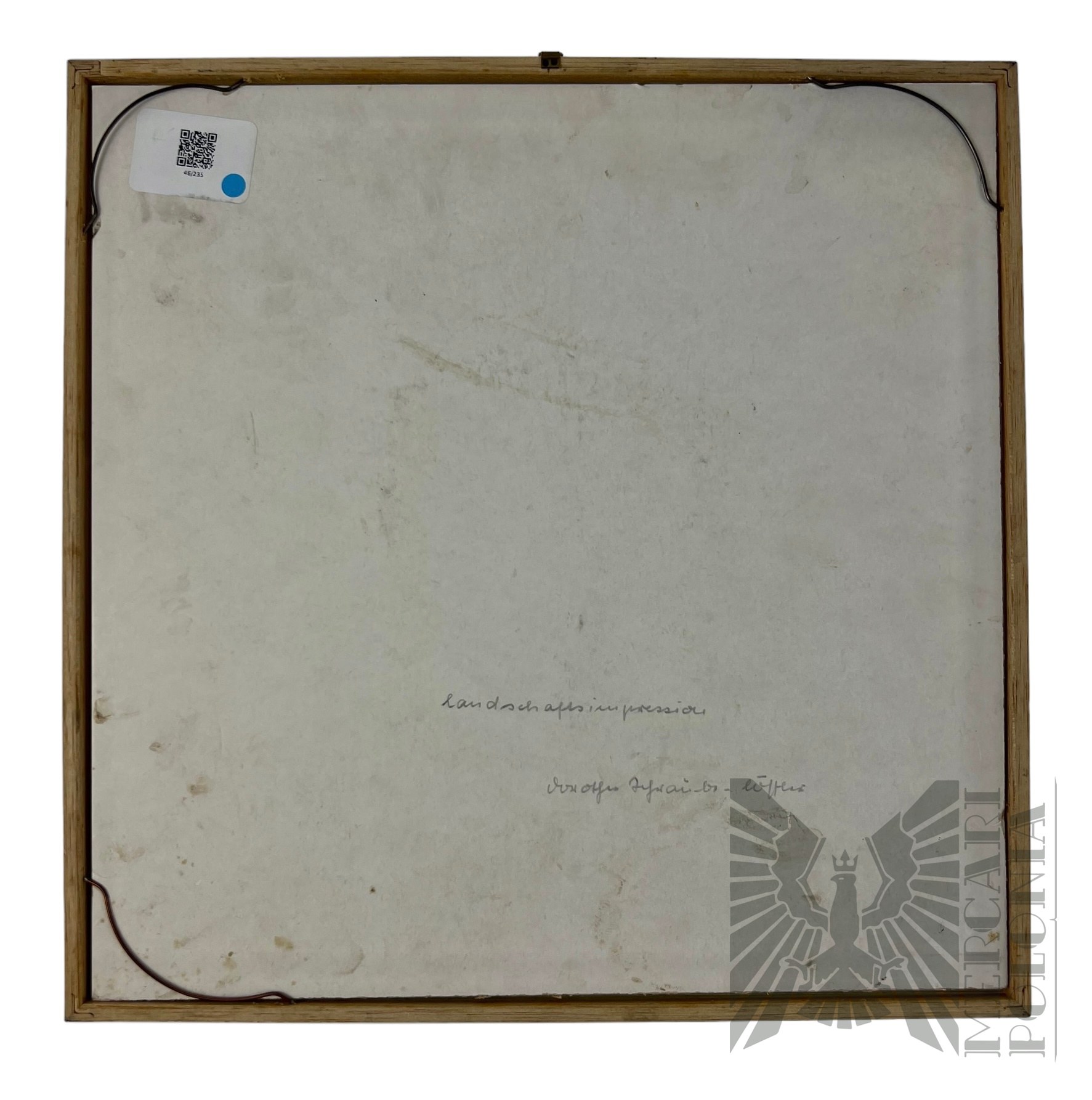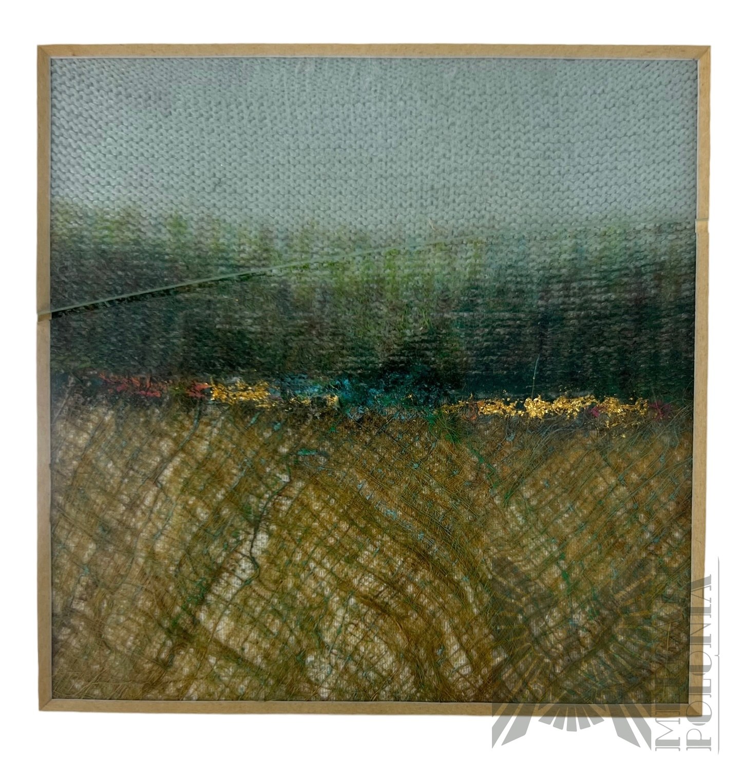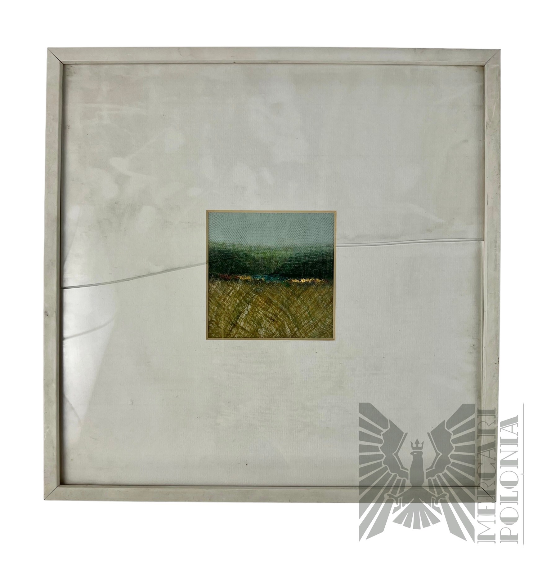 Oprawiony minimalistyczny obraz, przedstawiający łany zbóż. Pęknięte szkło.