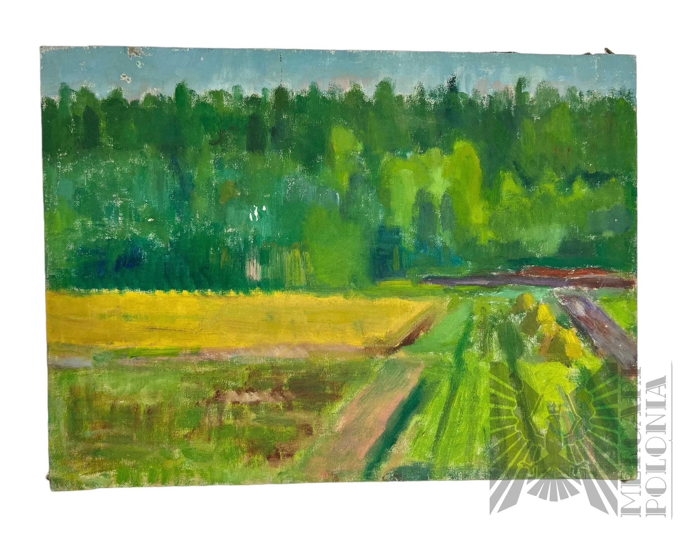 Obraz, pejzaż wiejski z dominującymi kolorami zieleni, przedstawiający łąki zlewające się z lasem. Obraz malowany na płótnie, brak sygnatur.