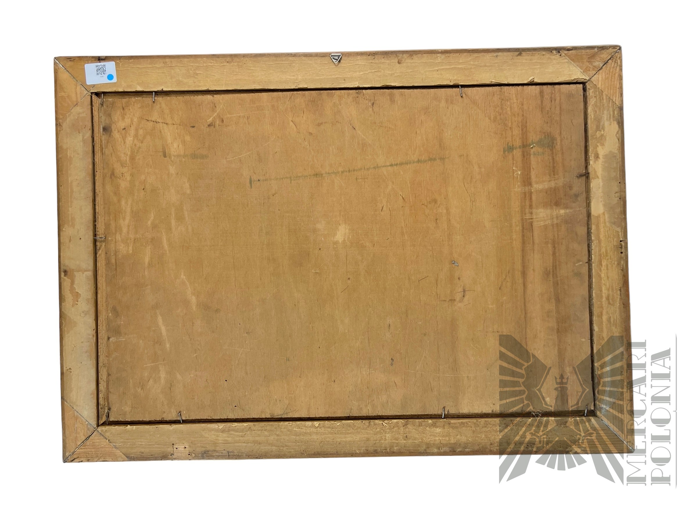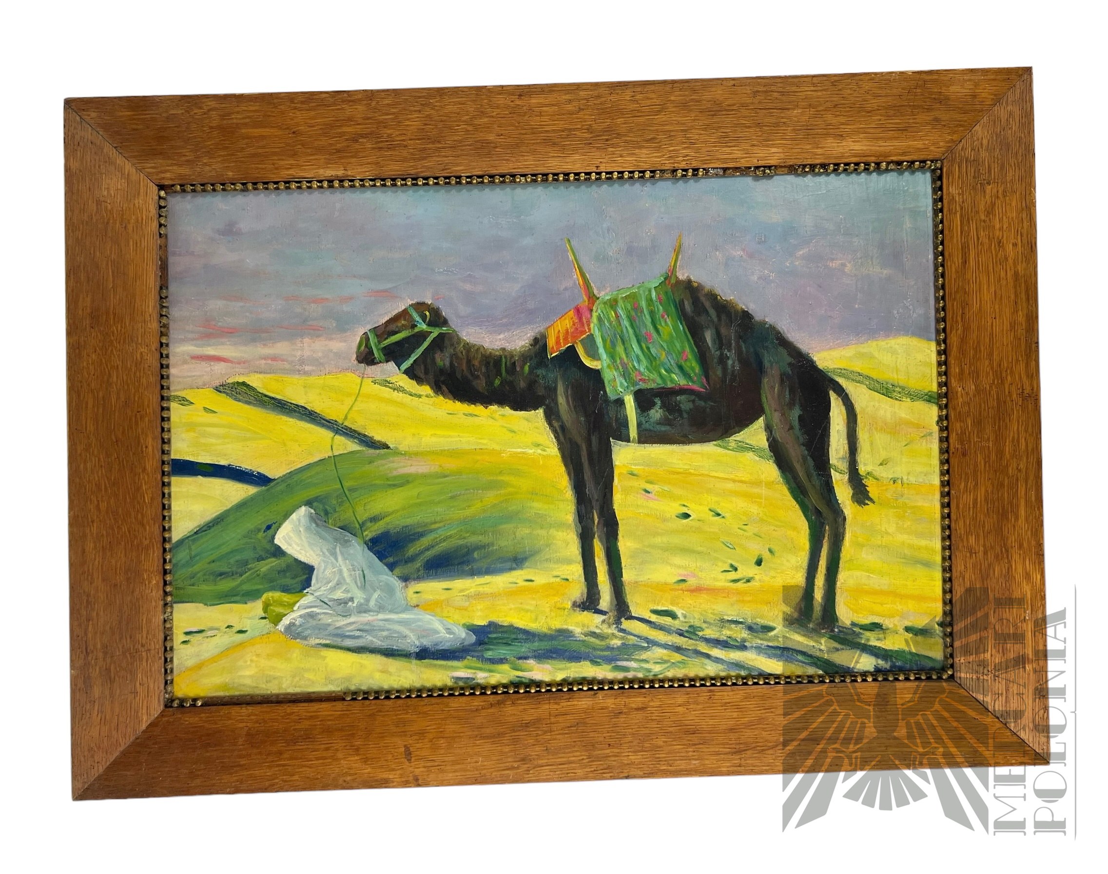 Obraz pełen jasnych kolorów, przedstawiający pustynną scenkę modlitwy Beduina pośrodku wydm piaskowych, trzymającego swego wielbłąda.