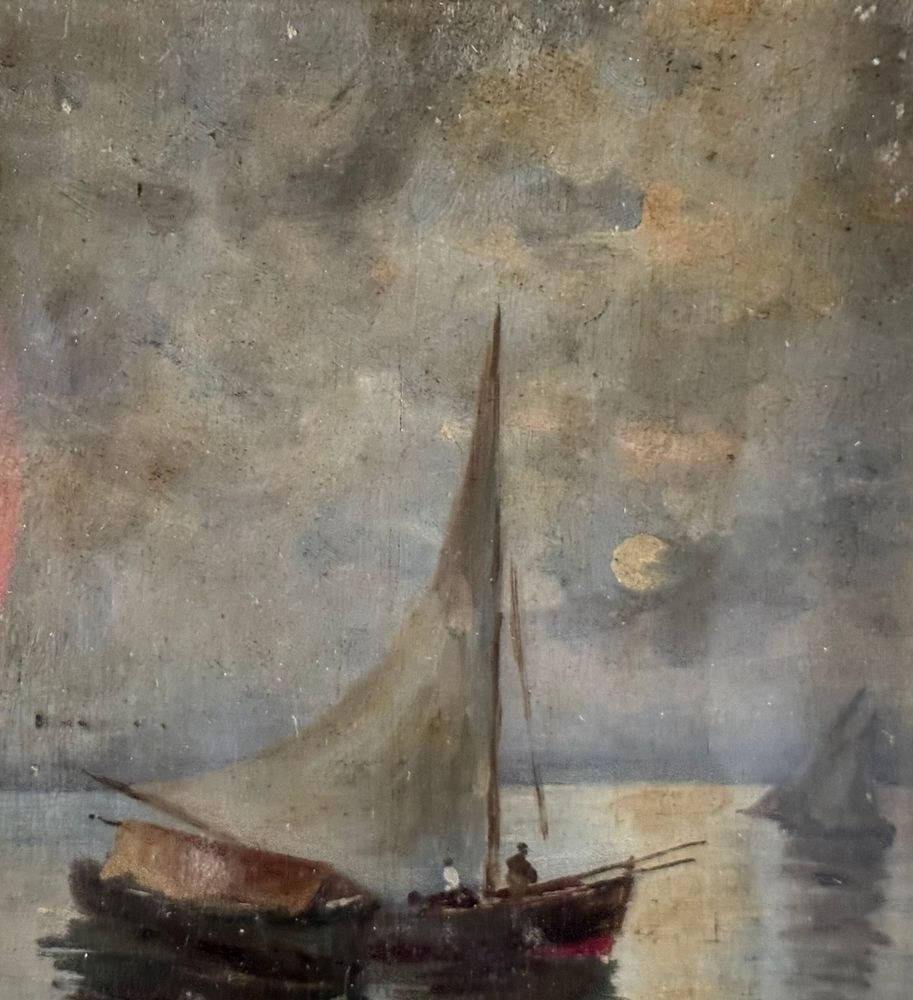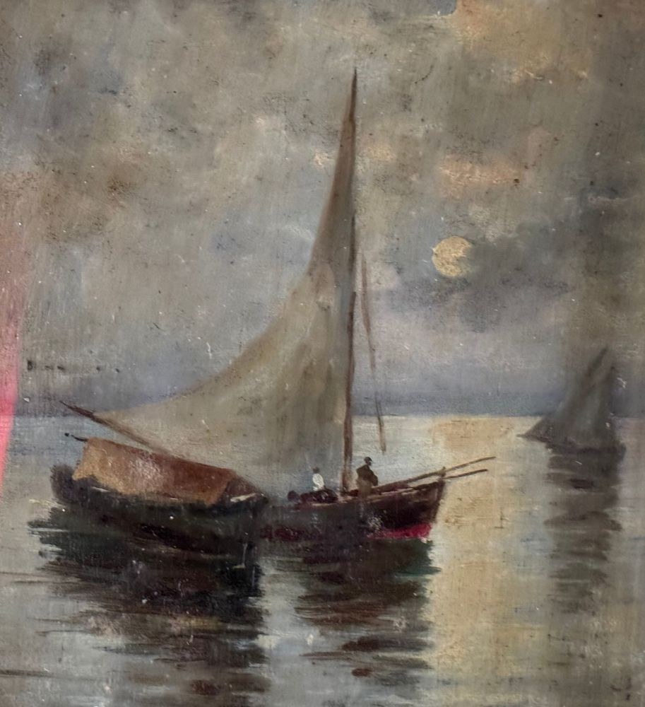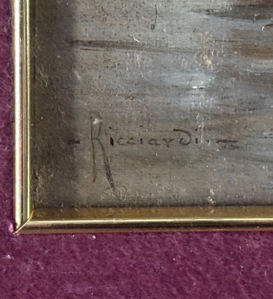 Oil painting on panel, 20th-century Italian school depicting a Seascape with Boats. Dimensions including frame: 48x53 cm. Dimensions inside the frame: 18x24 cm. Signed lower left by Oscar Ricciardi. The artwork is in good condition.