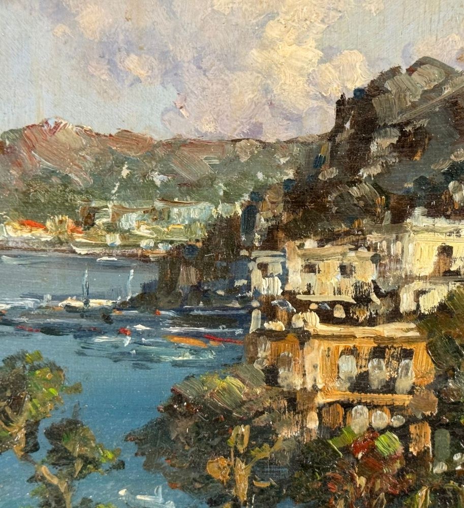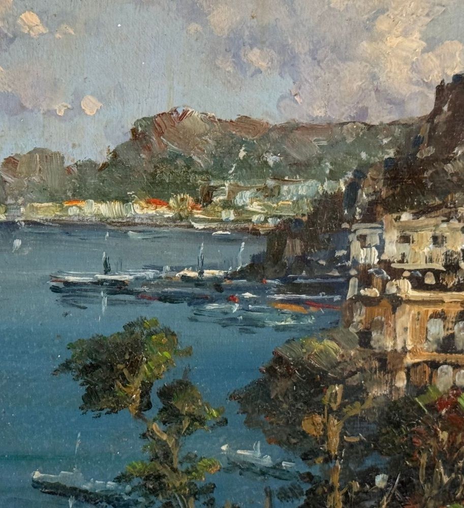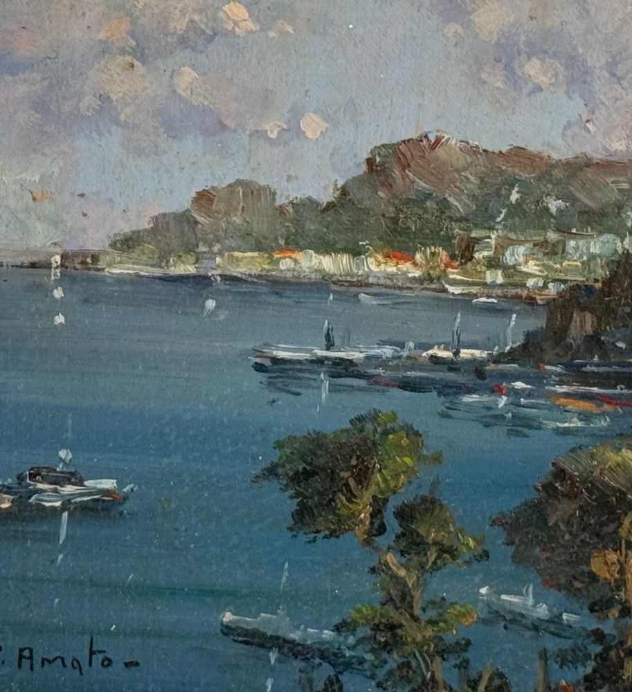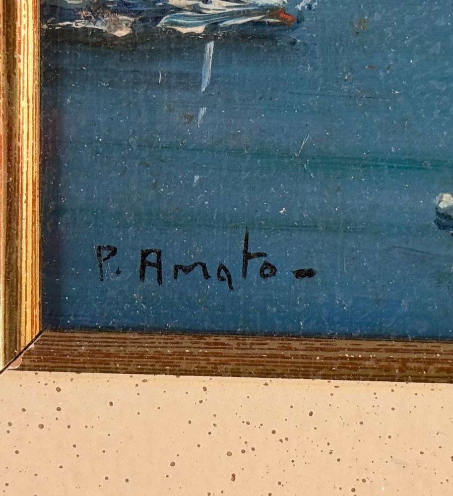 Oil painting on panel, 20th century, Italian school, depicting a coastal landscape. Dimensions including frame: 51x36 cm. Dimensions inside the frame: 16x30 cm. Signed lower left: P. Amato. Artwork in excellent condition.