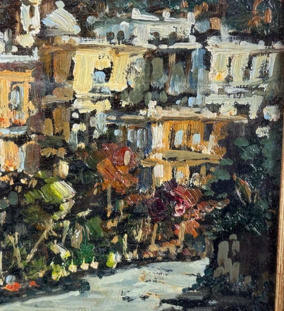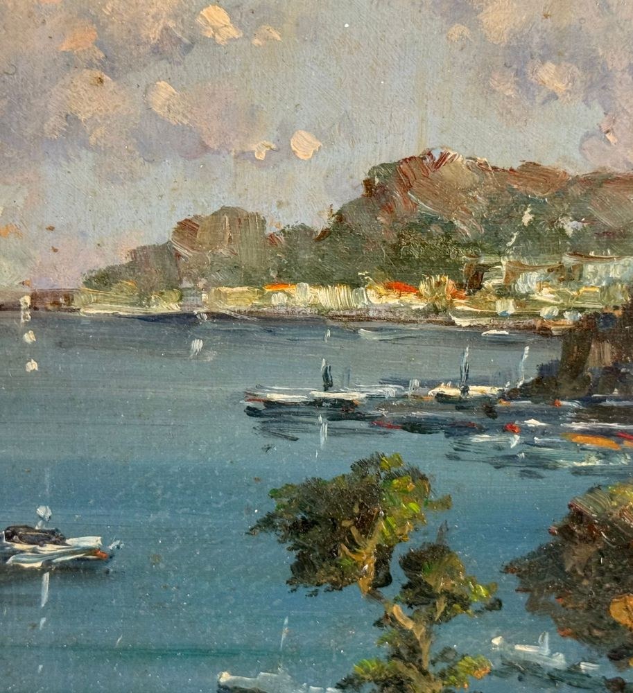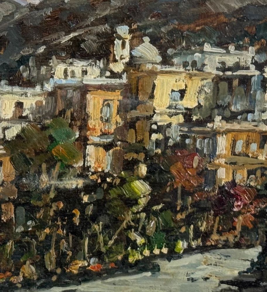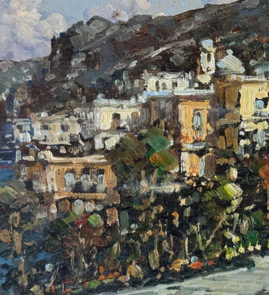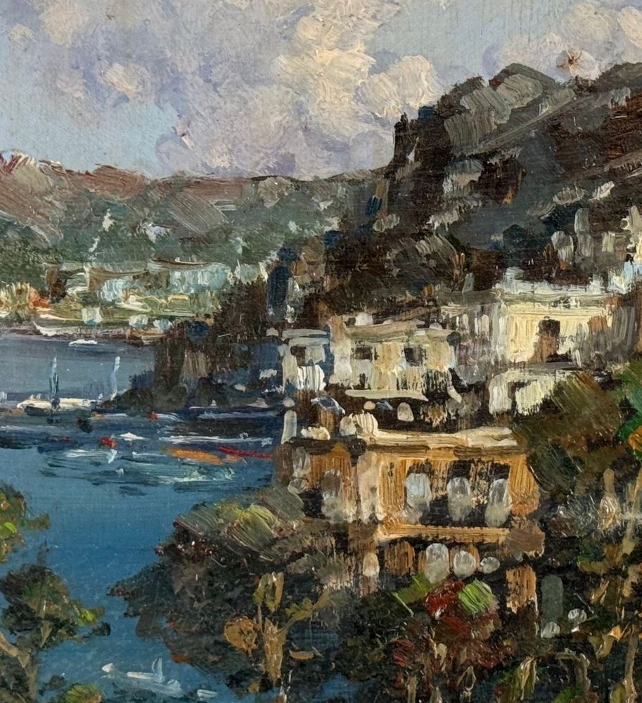 Oil painting on panel, 20th century, Italian school, depicting a coastal landscape. Dimensions including frame: 51x36 cm. Dimensions inside the frame: 16x30 cm. Signed lower left: P. Amato. Artwork in excellent condition.