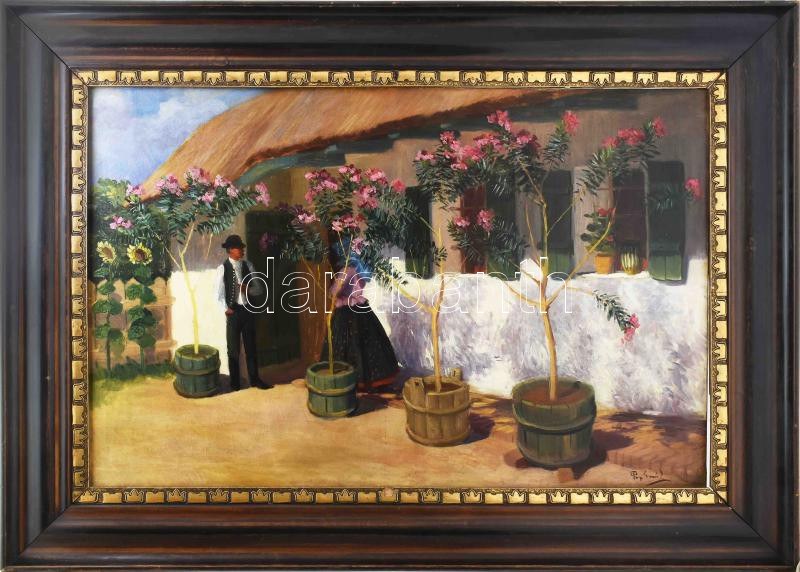 Pap Emil (1884-1955): Virágos udvar. Olaj, vászon, jelzett. Dekoratív fakeretben, 65x101 cm / oil on canvas, signed, framed. KIZÁRÓLAG SZEMÉLYES ÁTVÉTEL, NEM POSTÁZZUK! / ONLY PERSONAL COLLECTION AT OUR OFFICE!