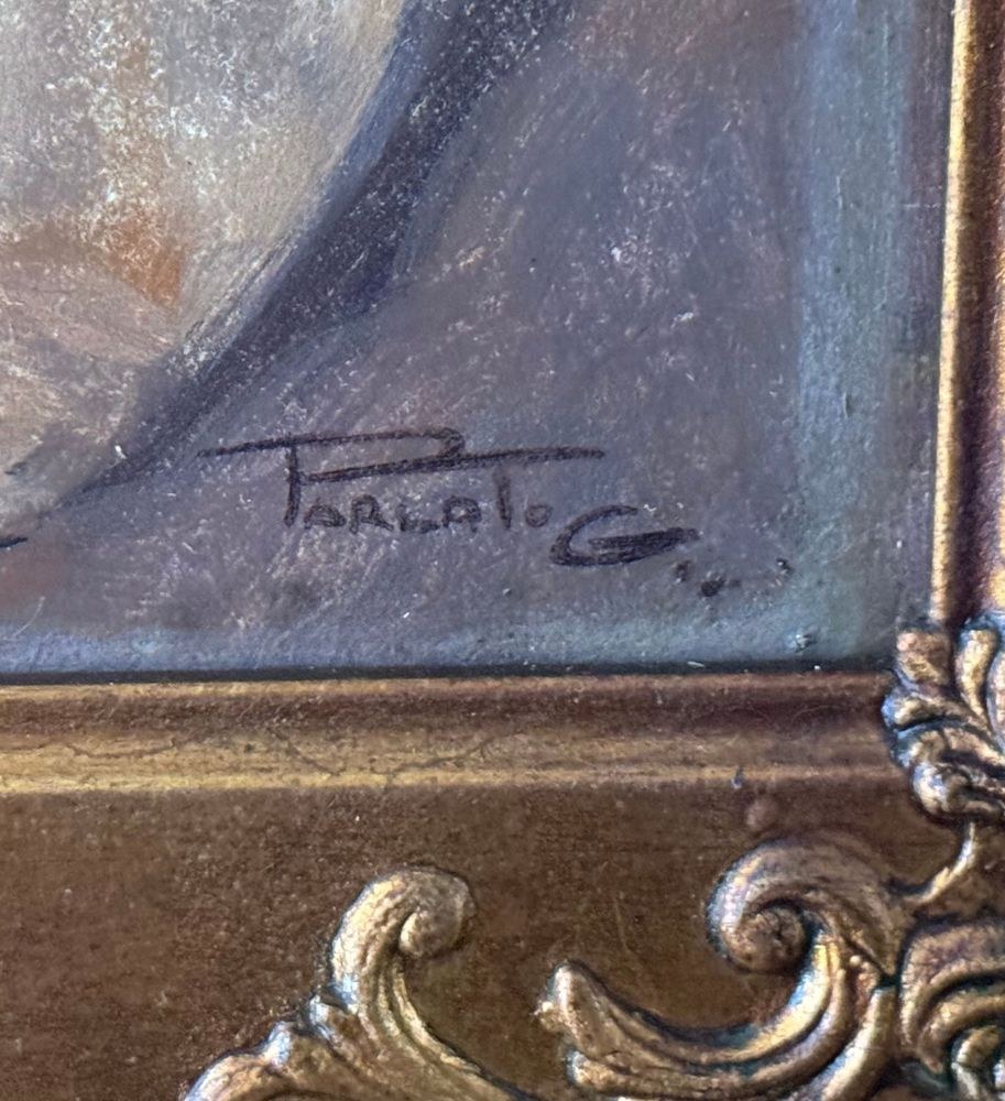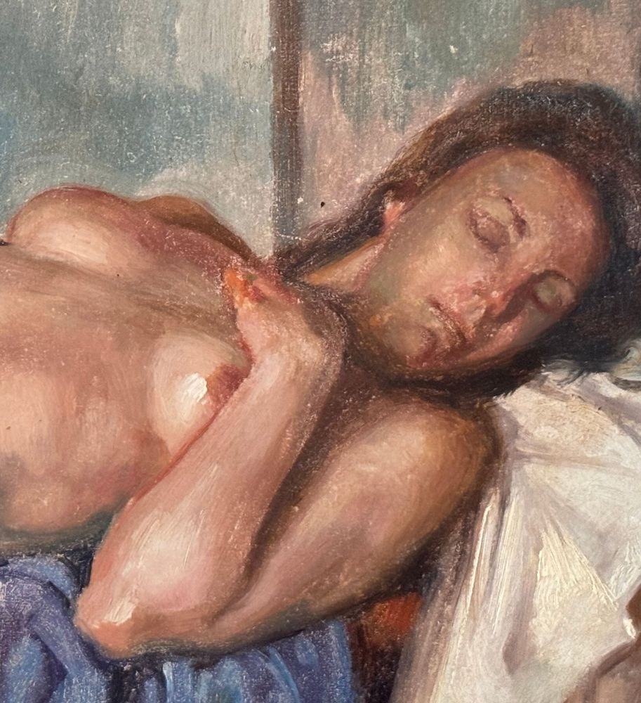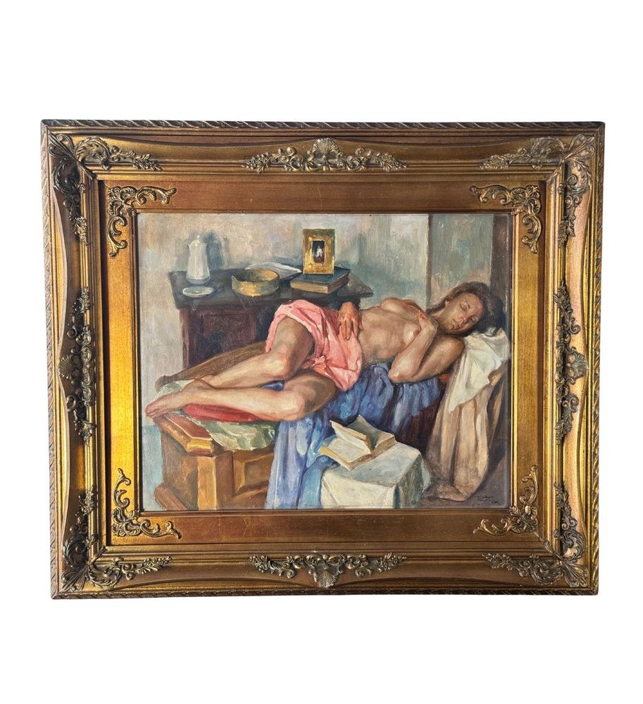 Oil painting on panel, 20th century, Italian school, depicting a female nude. Dimensions including frame: 72x62 cm. Dimensions inside the frame: 50x40 cm. Signed lower right: Giovanni Parlato. Artwork in good condition.