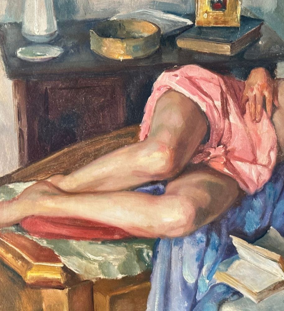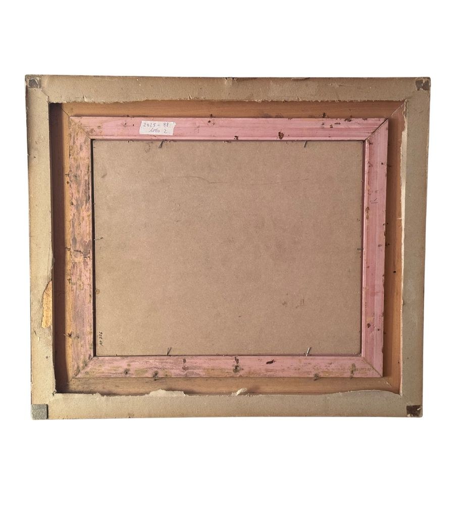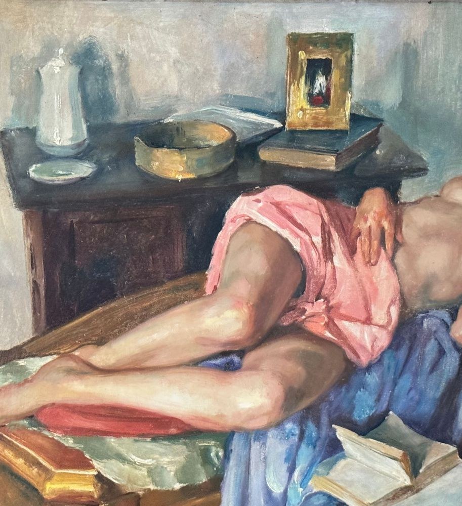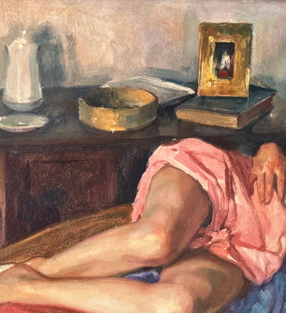 Oil painting on panel, 20th century, Italian school, depicting a female nude. Dimensions including frame: 72x62 cm. Dimensions inside the frame: 50x40 cm. Signed lower right: Giovanni Parlato. Artwork in good condition.