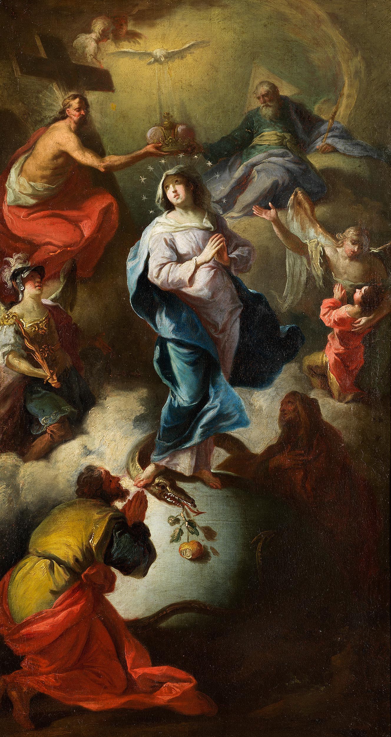 Die Darstellung geht auf die Offenbarung 12,1 zurück: Demnach erschien am Himmel eine Frau mit einer Krone von zwölf Sternen auf ihrem Haupt, Maria die Jungfrau ohne Makel, die den Sündenfall Evas wiedergutgemacht hat, sie hat mit ihrem unbeflecktem Fuß der Höllenschlange den Kopf zertreten. Zu sehen Maria in bewegtem blau-rötlichen Gewand, um ihr Haupt einen Kranz aus zwölf Sternen, den rechten Fuß auf dem Kopf der Höllenschlange. Umgeben wird sie von mehreren Heiligen. Oberhalb ihres Kopfes wird zudem eine goldene Krone gehalten, von Jesus im roten Gewand, rechtsseitig vom Gottvater und darüber fliegend die weiße Taube des Heiligen Geistes. Malerei in teils kräftigen Farbtönen, die Höllenschlange in leicht naiver Manier wiedergegeben.