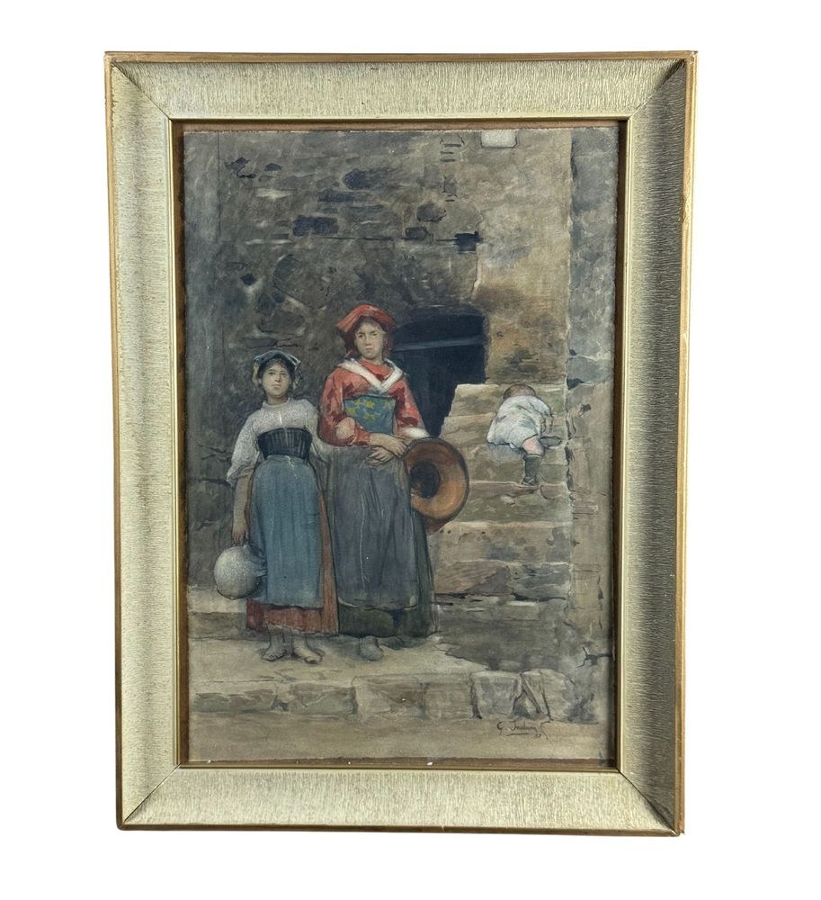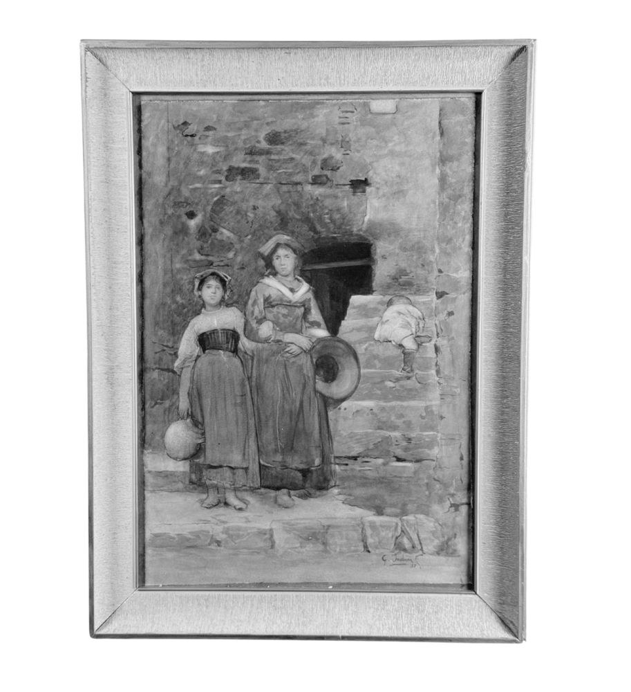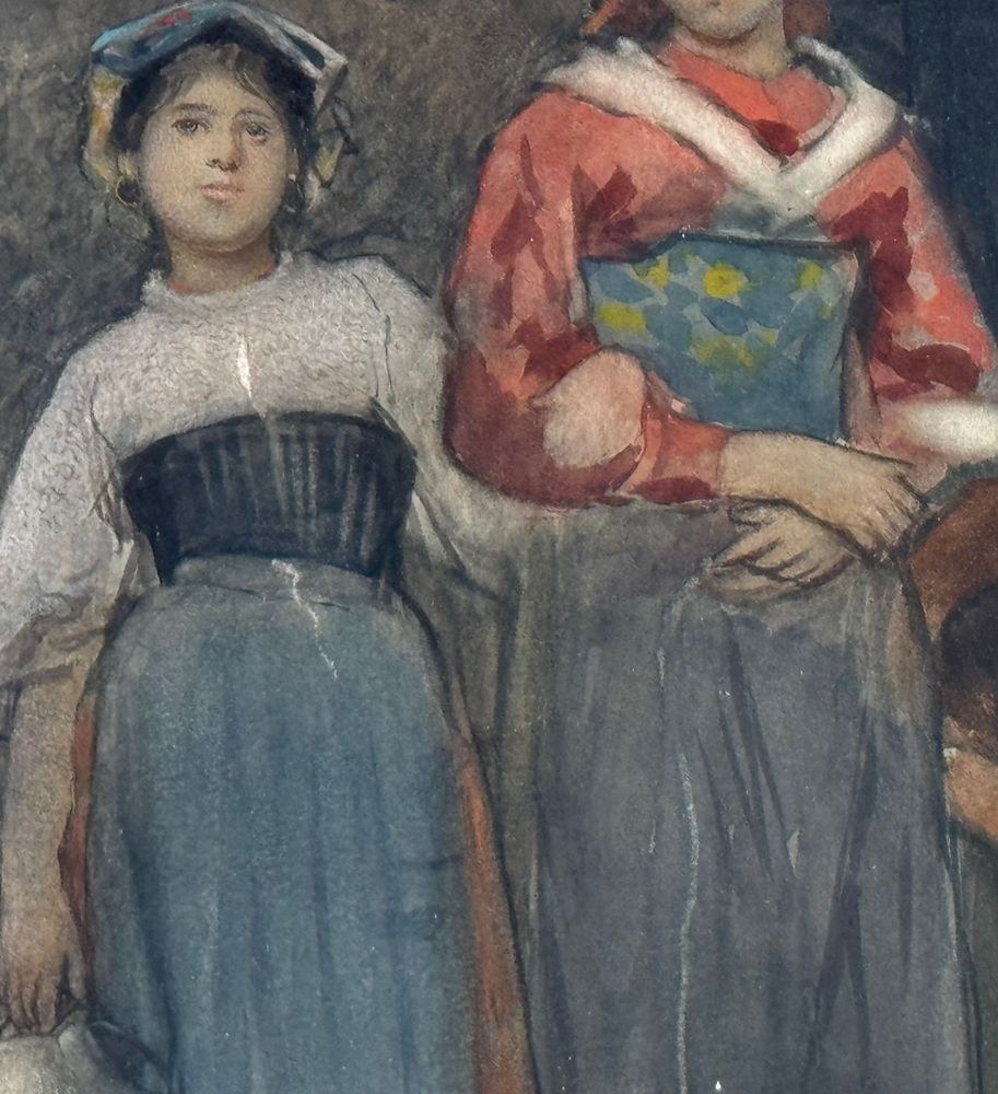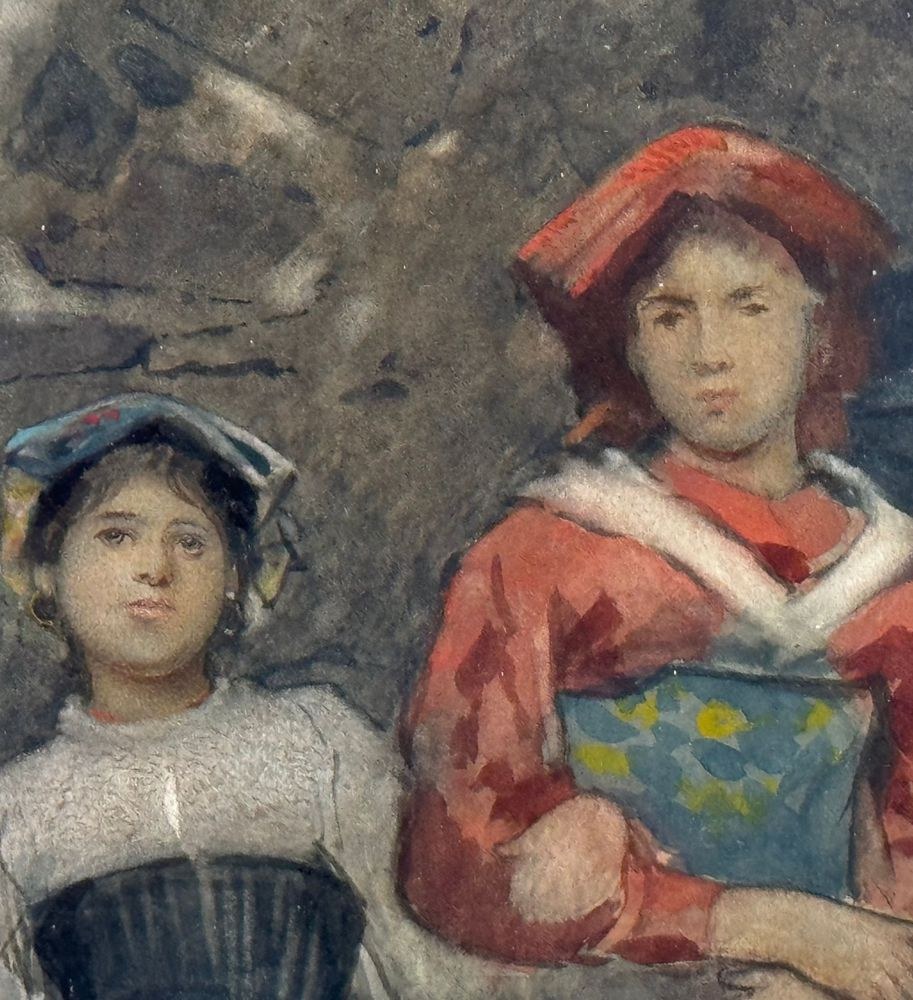 Watercolor on paper, 19th-century Italian school, depicting Peasant Women. Dimensions including frame: 50x67 cm. Dimensions inside the frame: 36x54 cm. Signed at the bottom right by Induni. The artwork is in good condition.