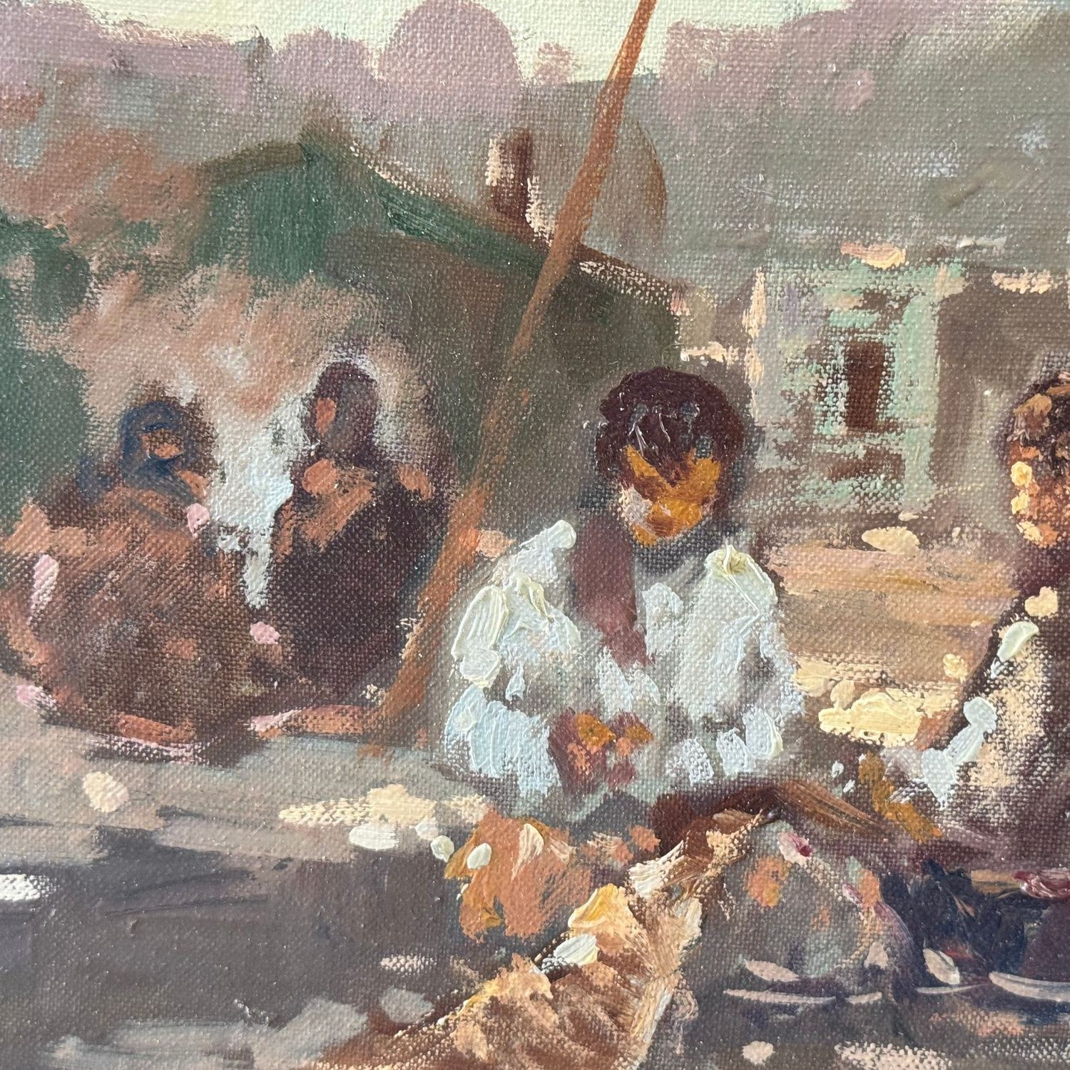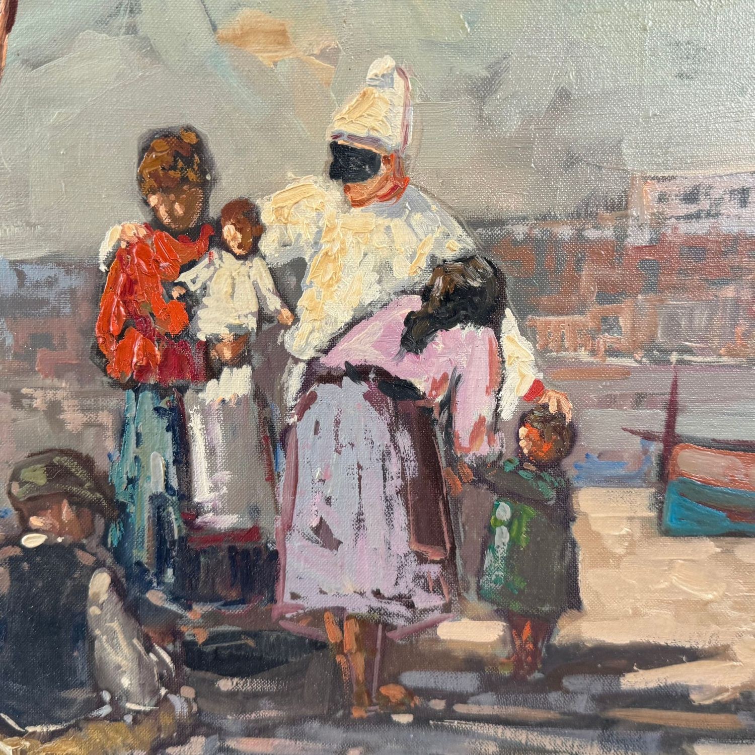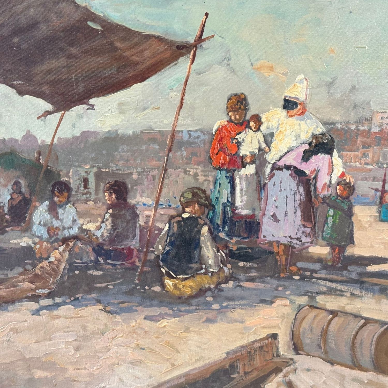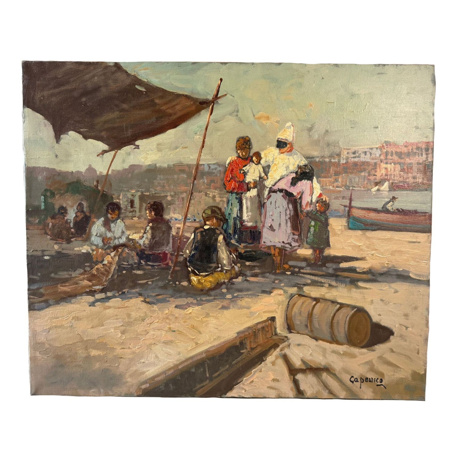 Oil painting on canvas, 20th-century Italian school, depicting Characters and Pulcinella at Mergellina.