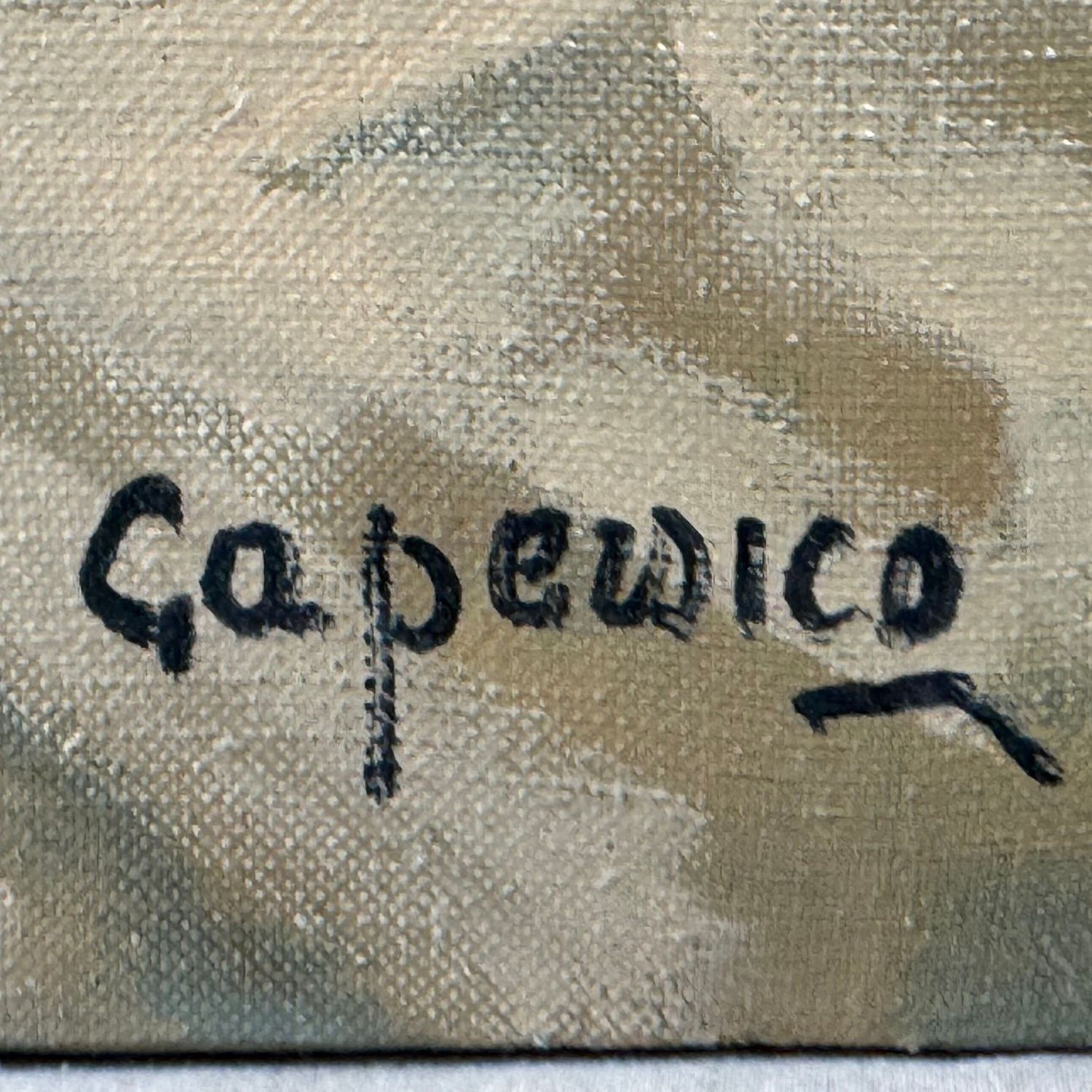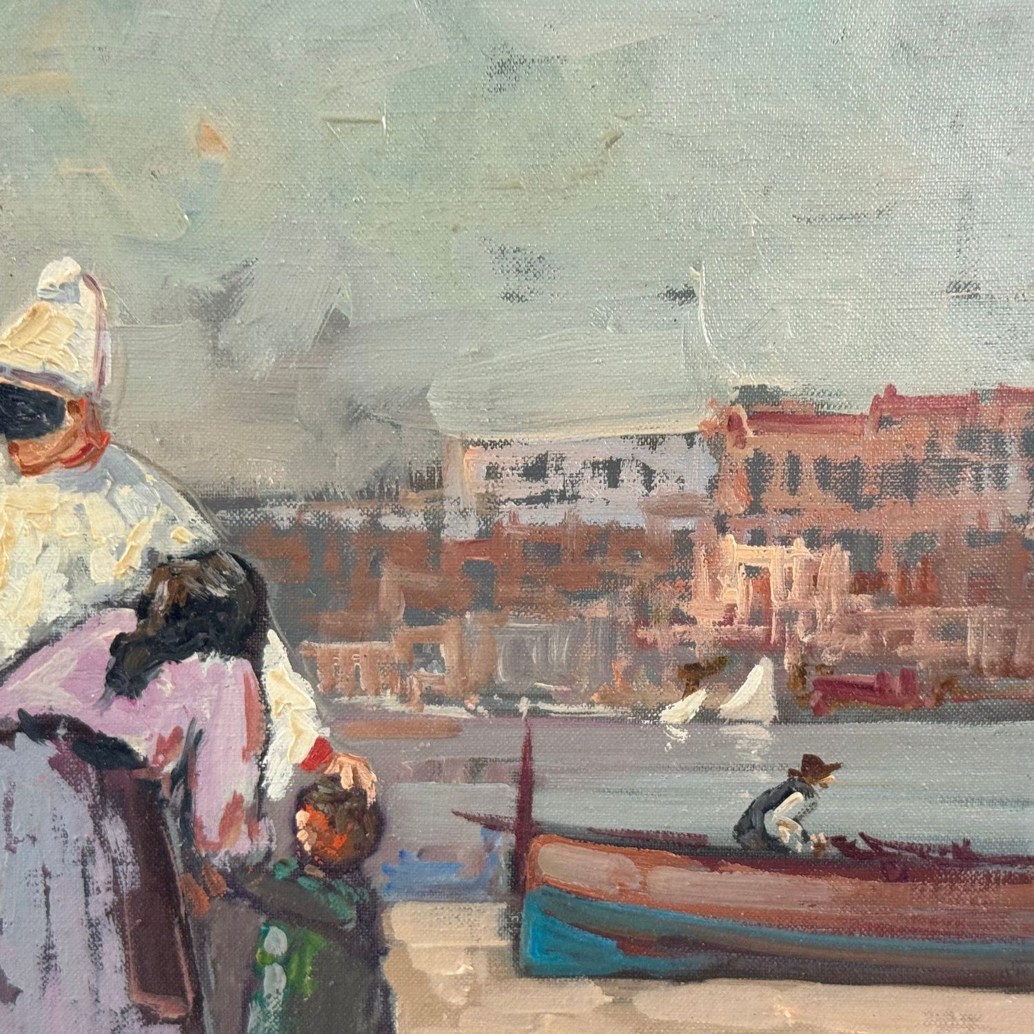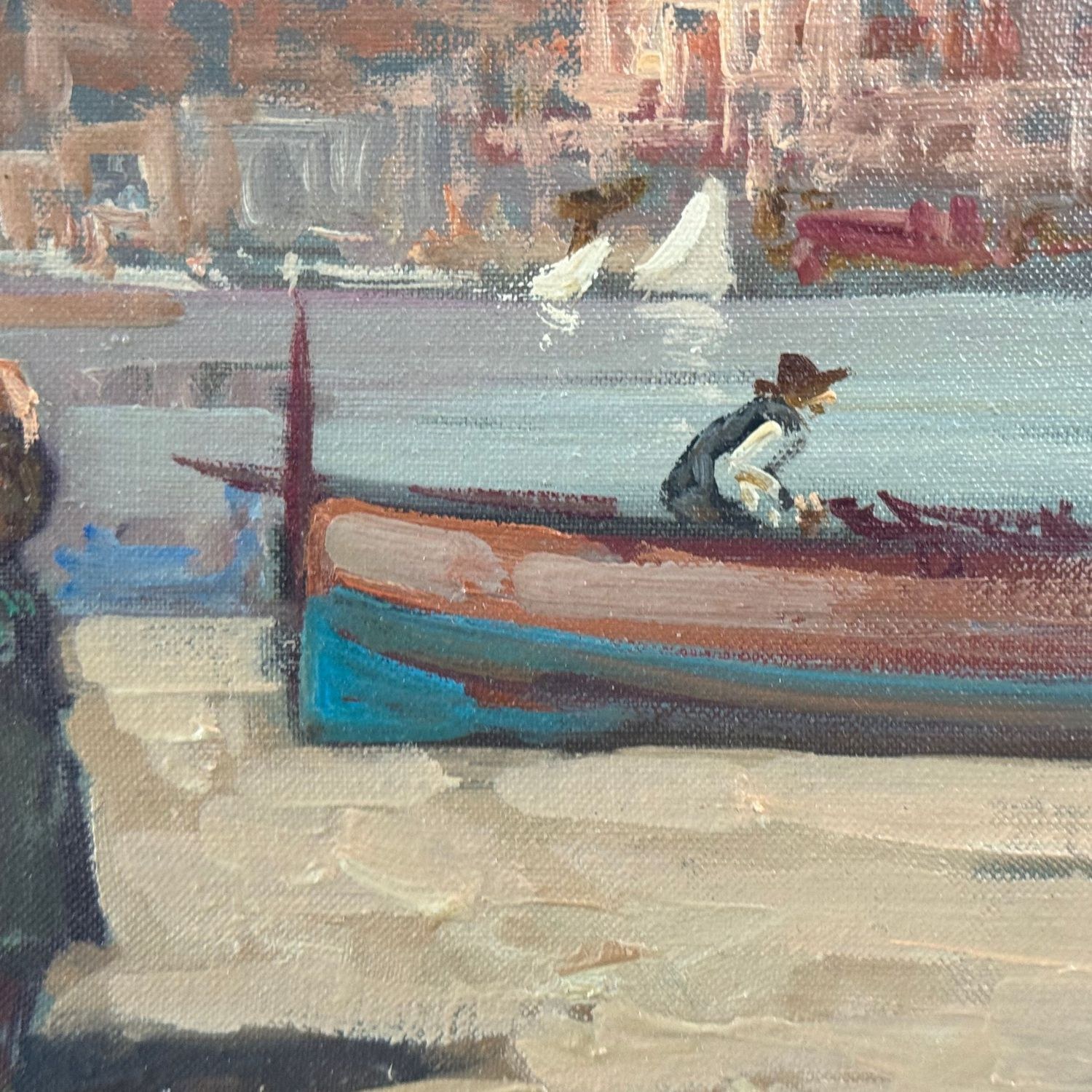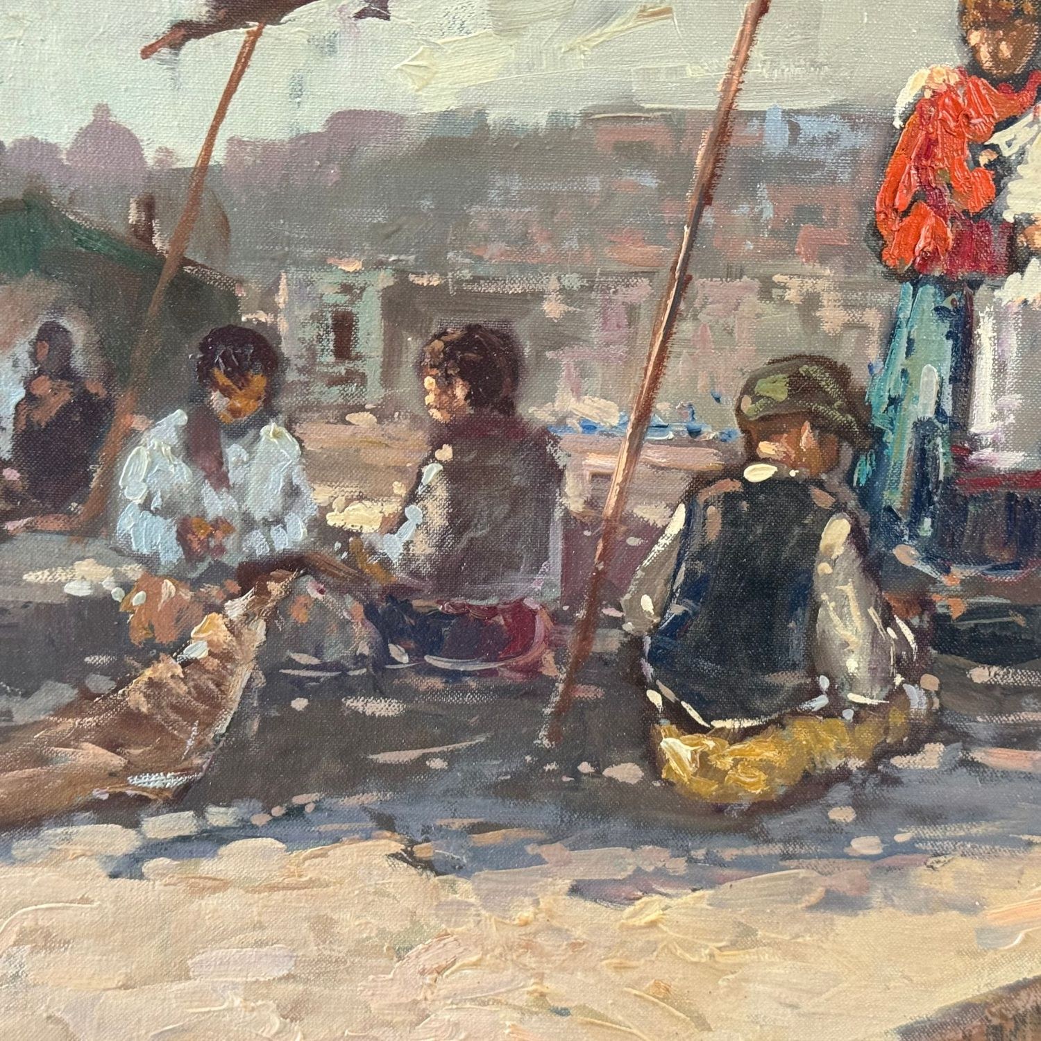 Oil painting on canvas, 20th-century Italian school, depicting Characters and Pulcinella at Mergellina.