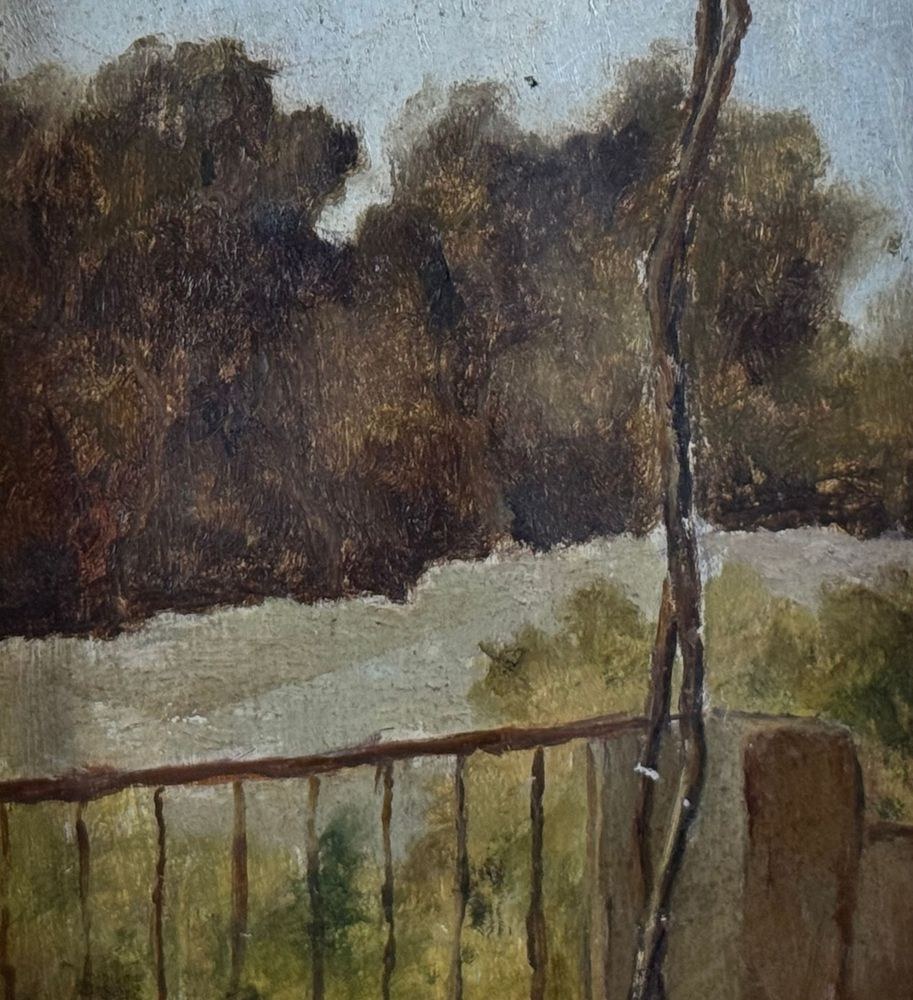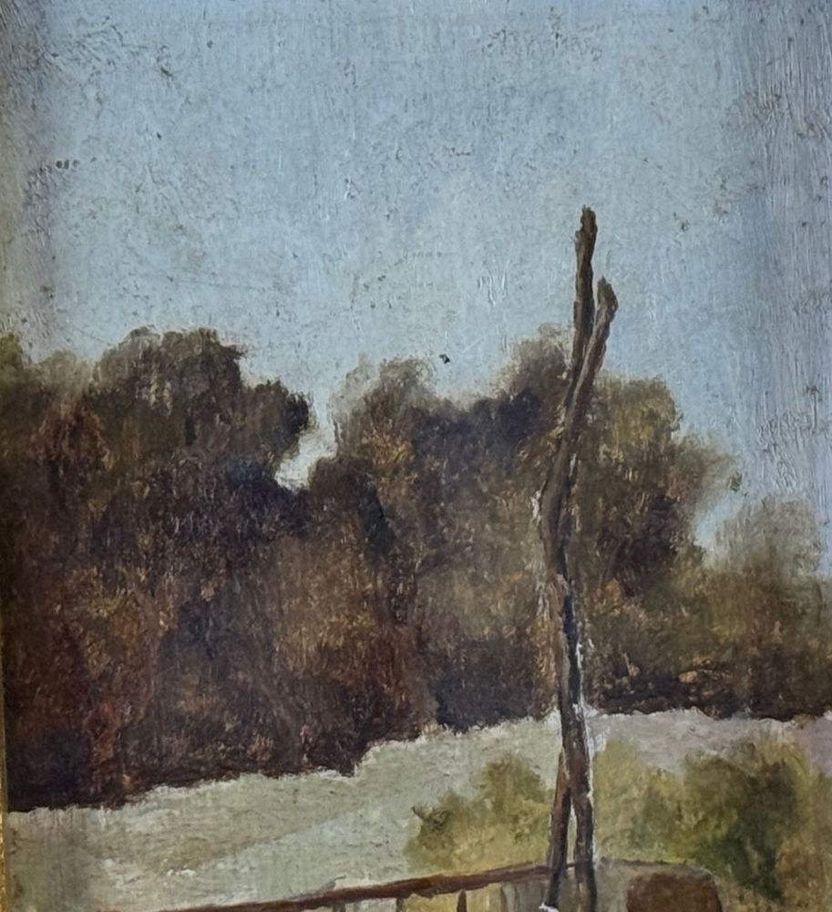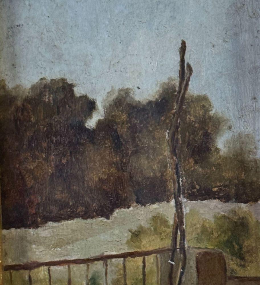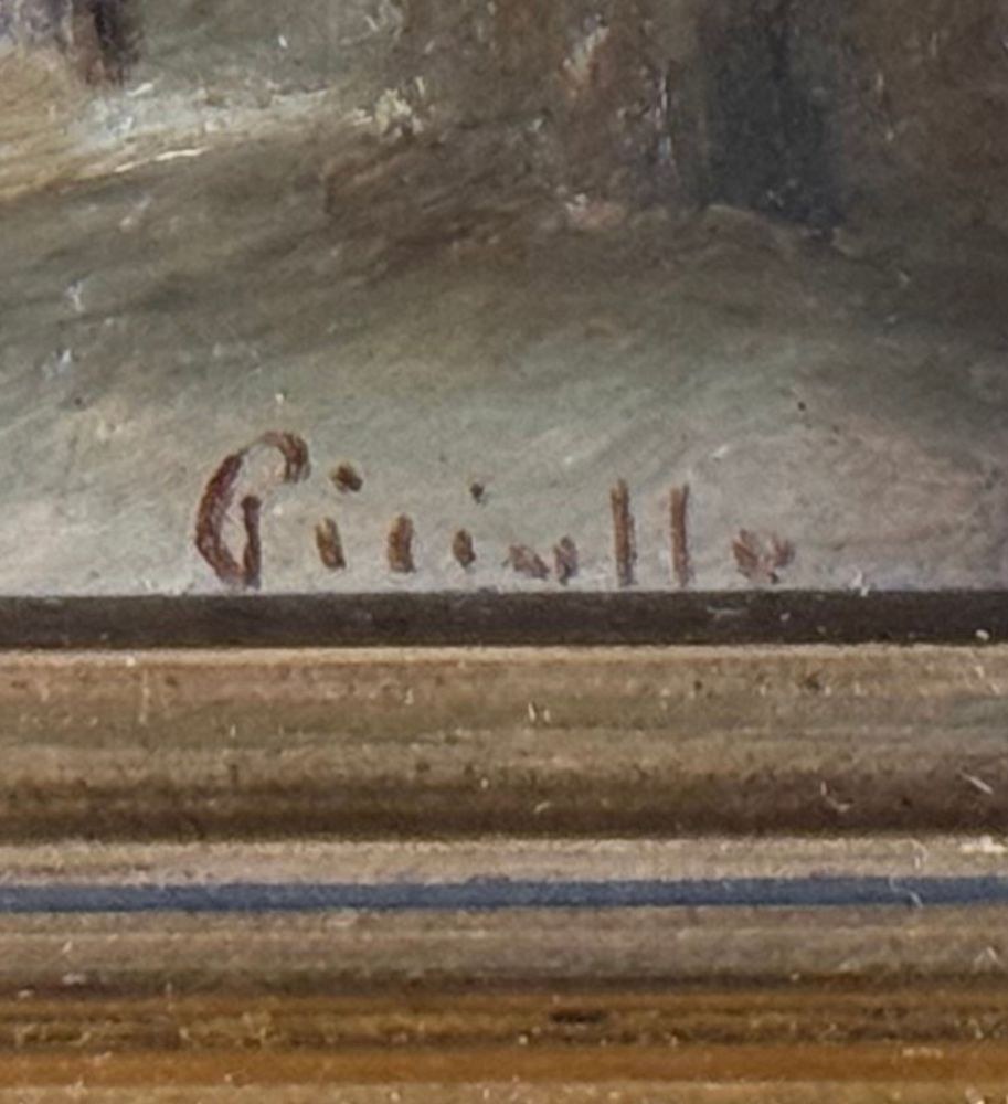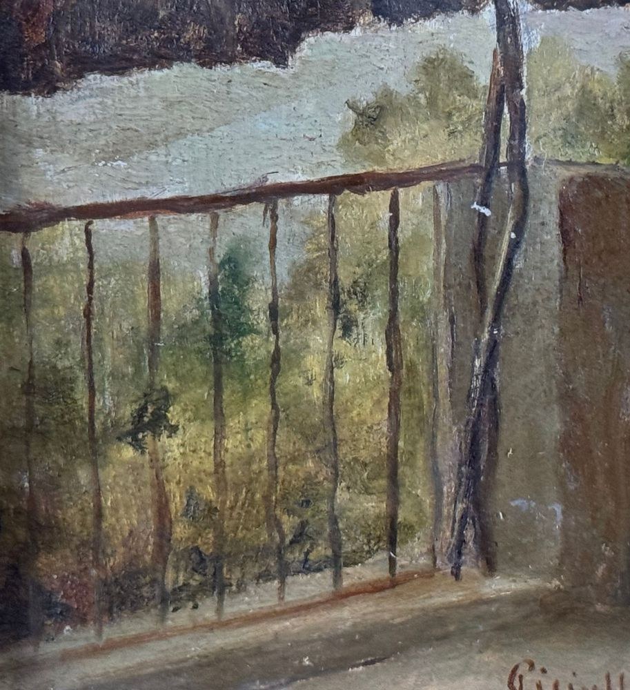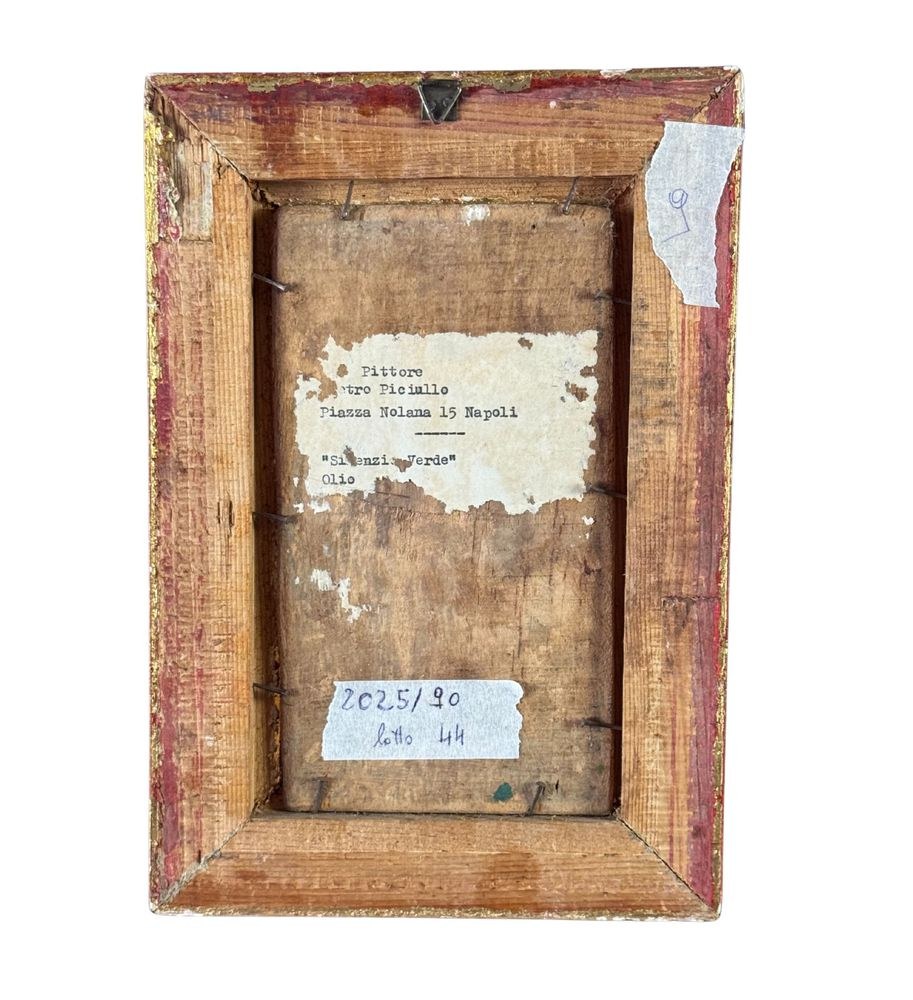 Oil on panel painting, 20th century, Italian school, titled *Silences in the Green*. Dimensions including frame: 17 x 24 cm. Inner frame dimensions: 10 x 18 cm. Signed lower right *Pietro Piciullo*. The artwork is in good condition.