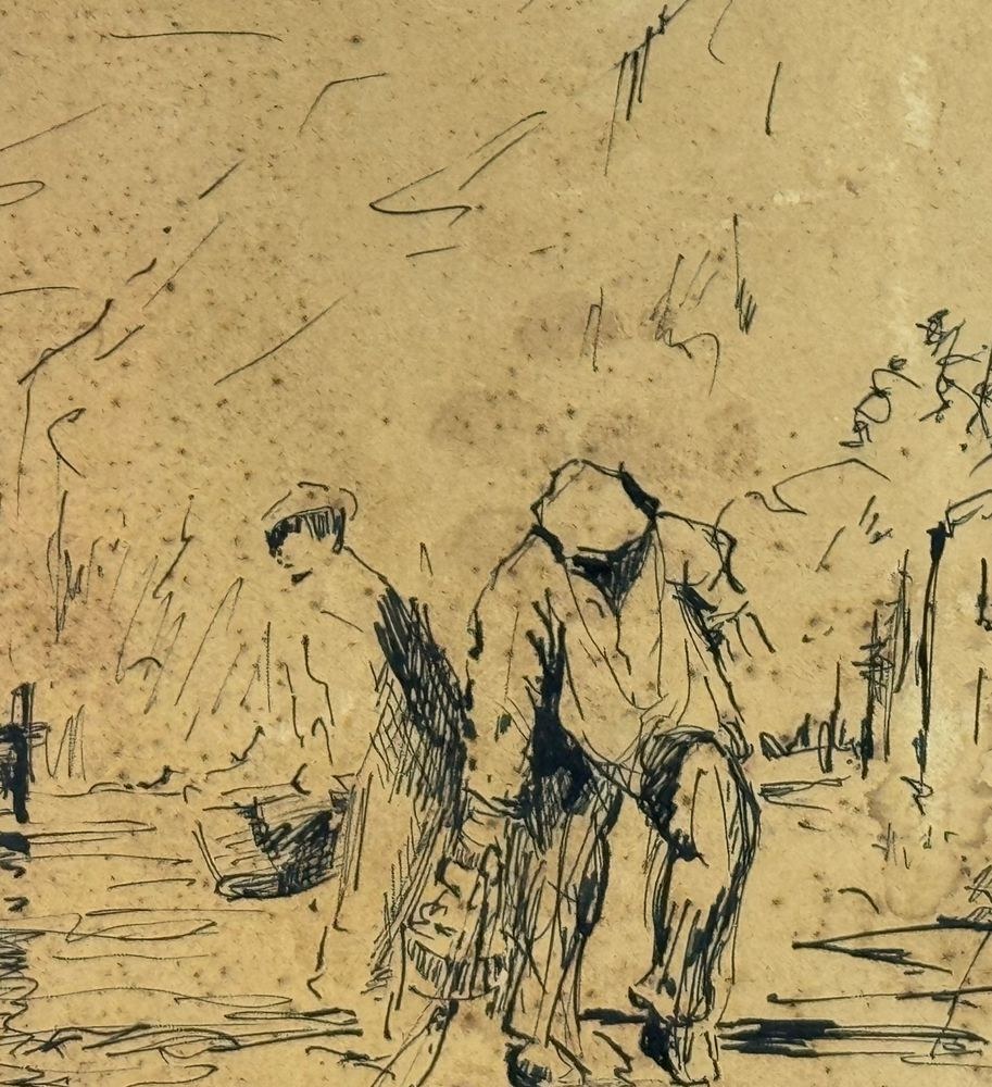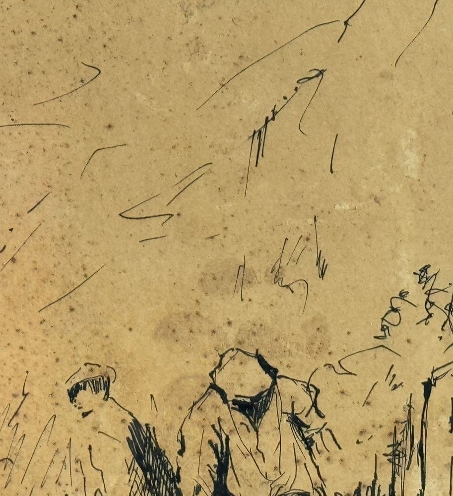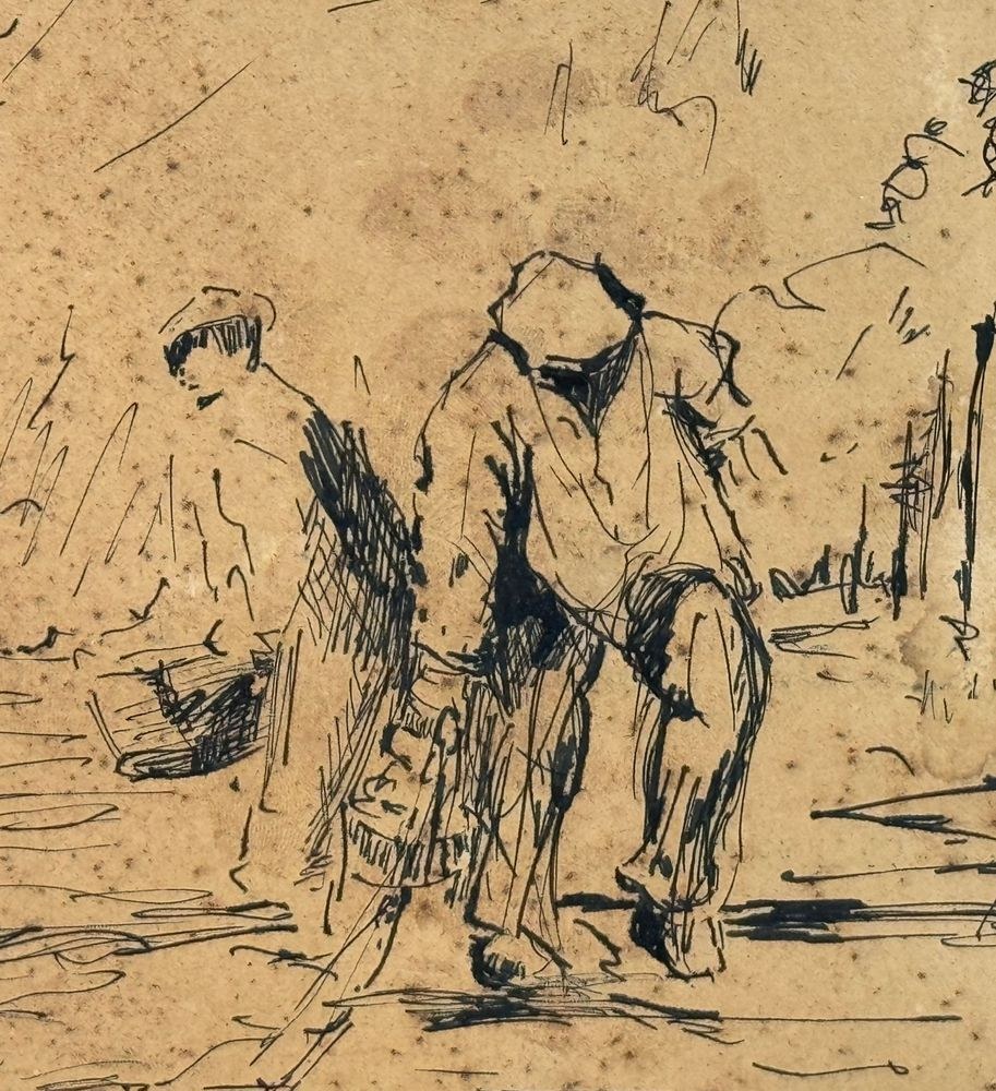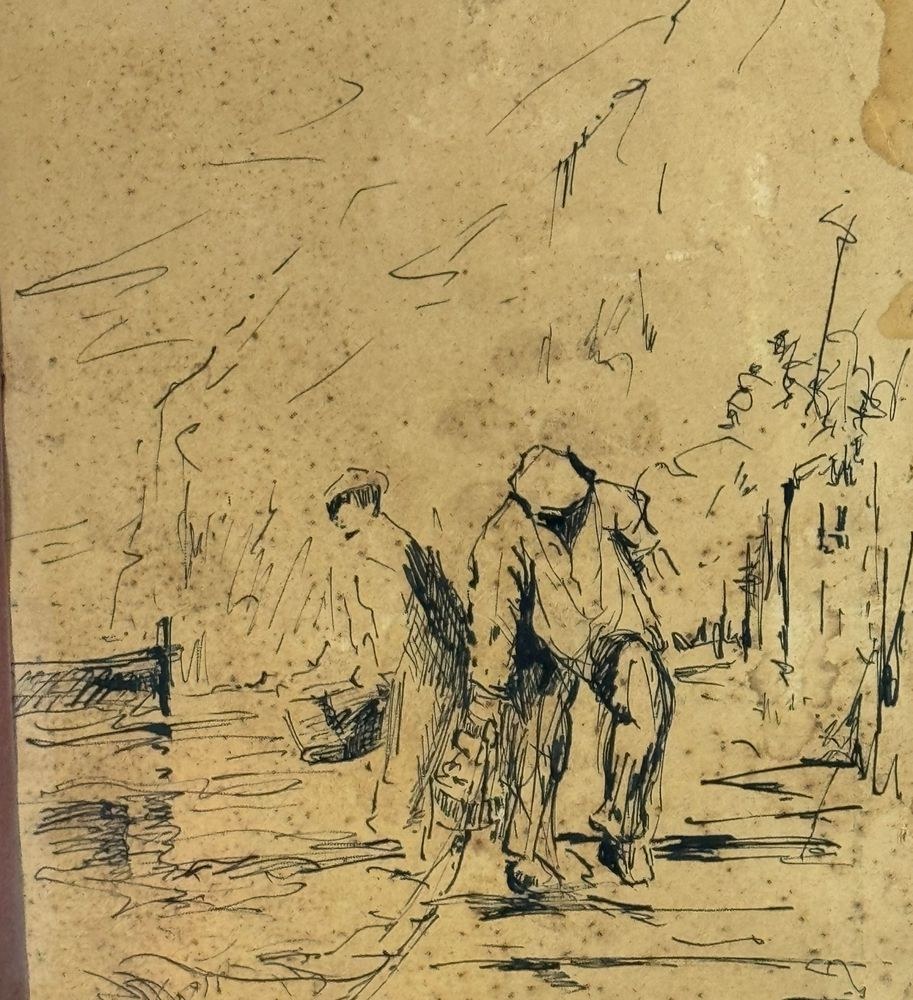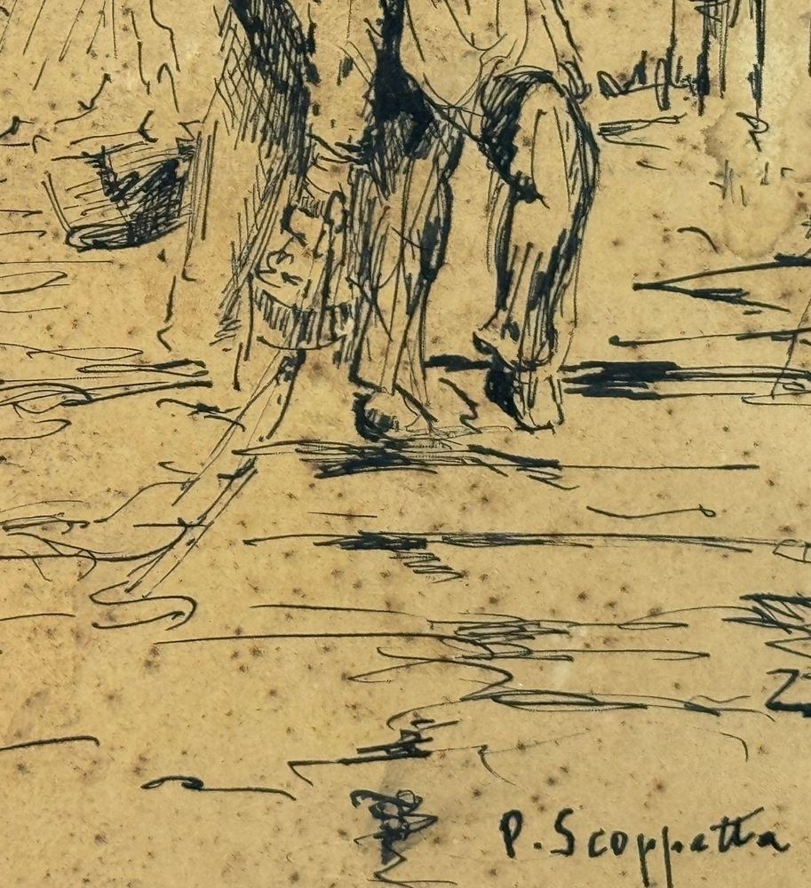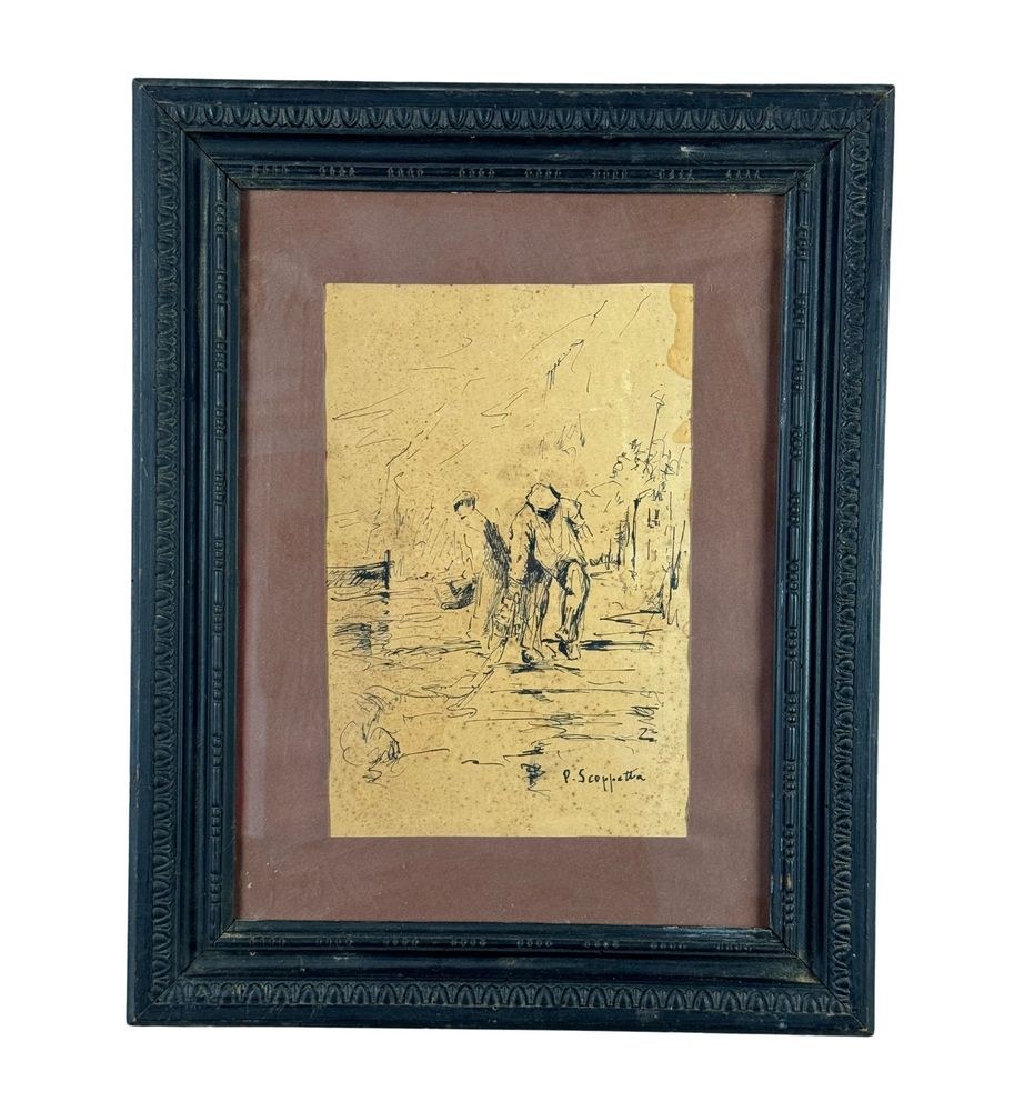 Drawing on paper, 20th-century Italian school, depicting fishermen. Dimensions including the frame: 39.5x49.5 cm. Interior frame dimensions: 20x30 cm. Signed at the bottom right by Pietro Scoppetta. The piece is in good condition with slight signs of wear as shown in the attached photos.