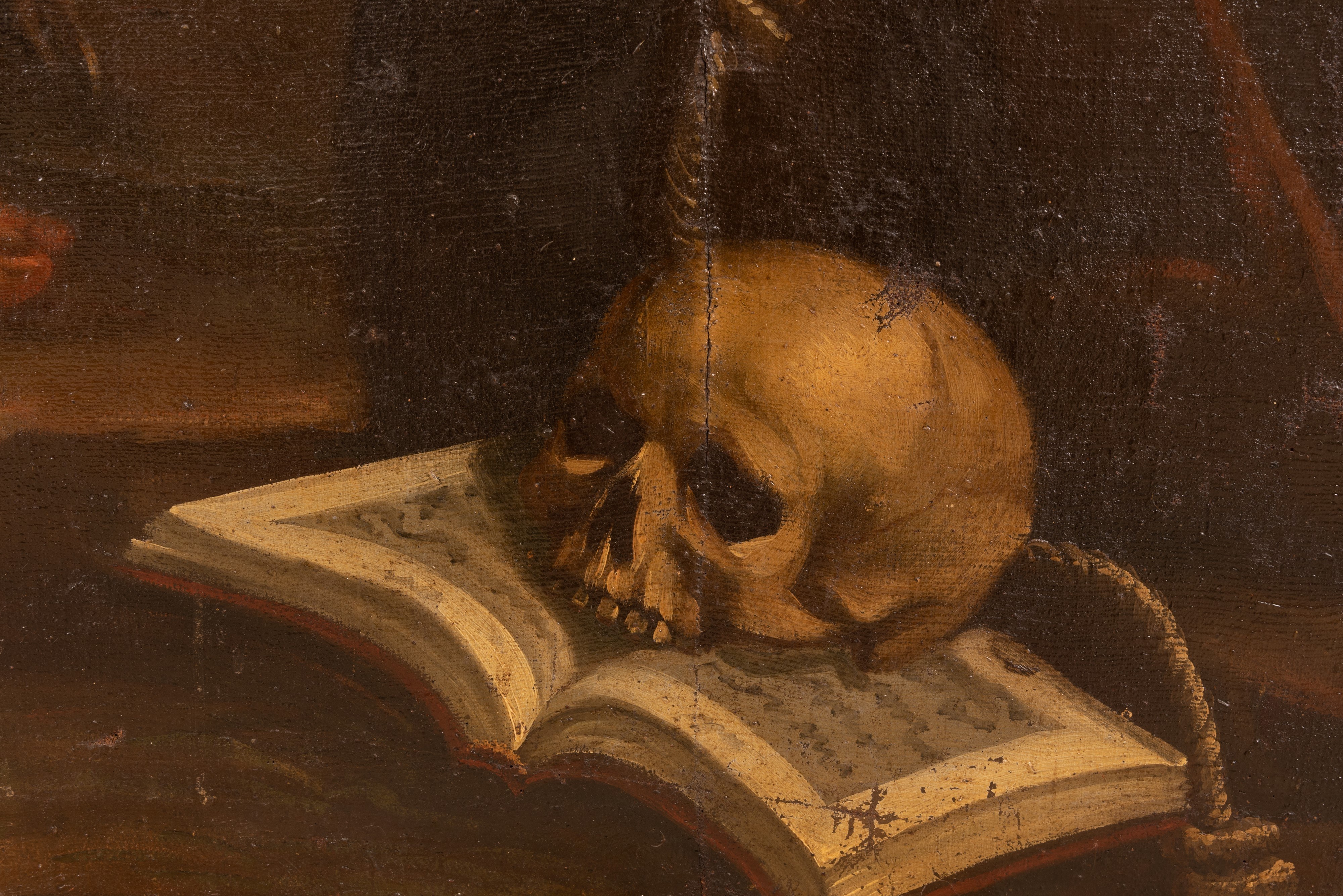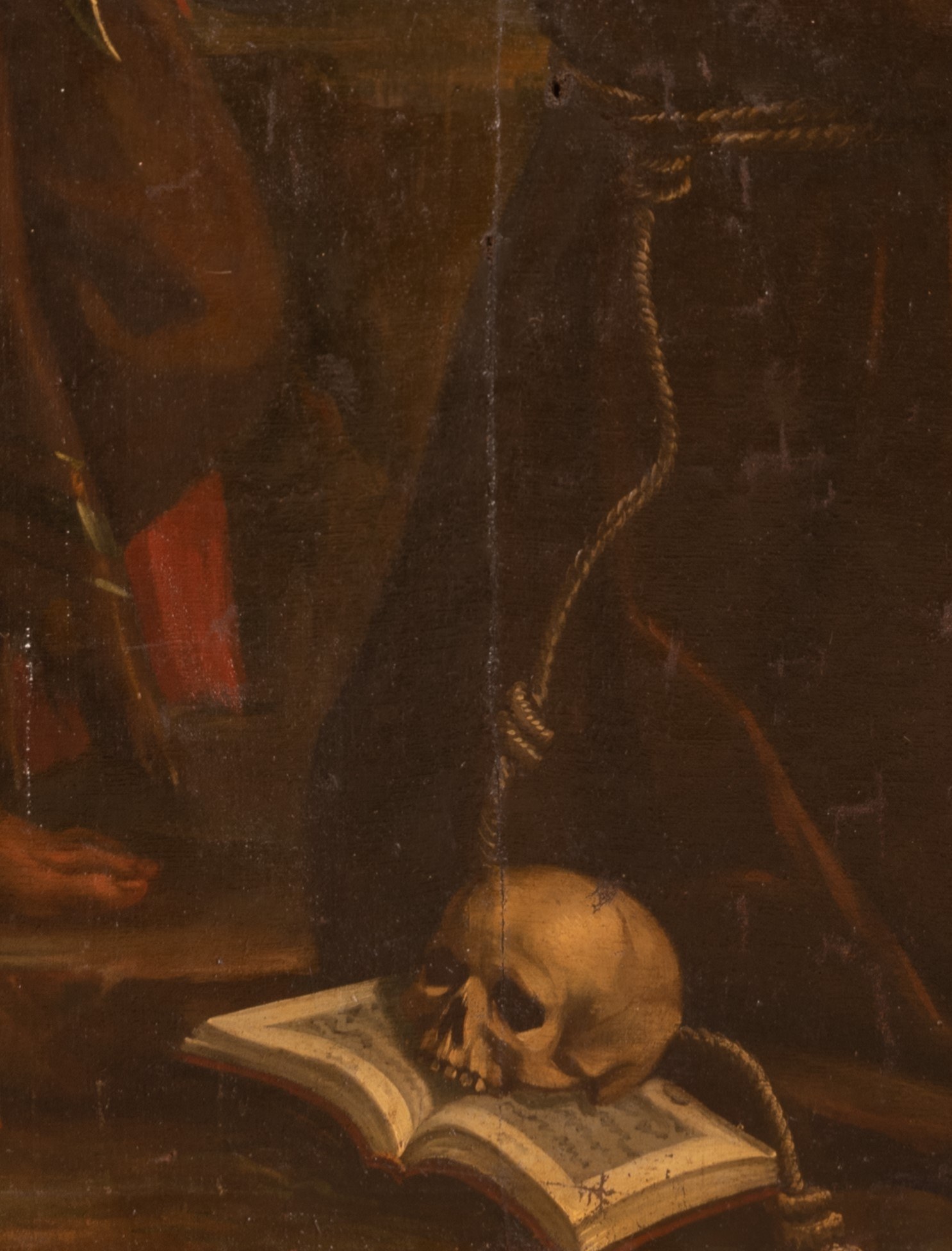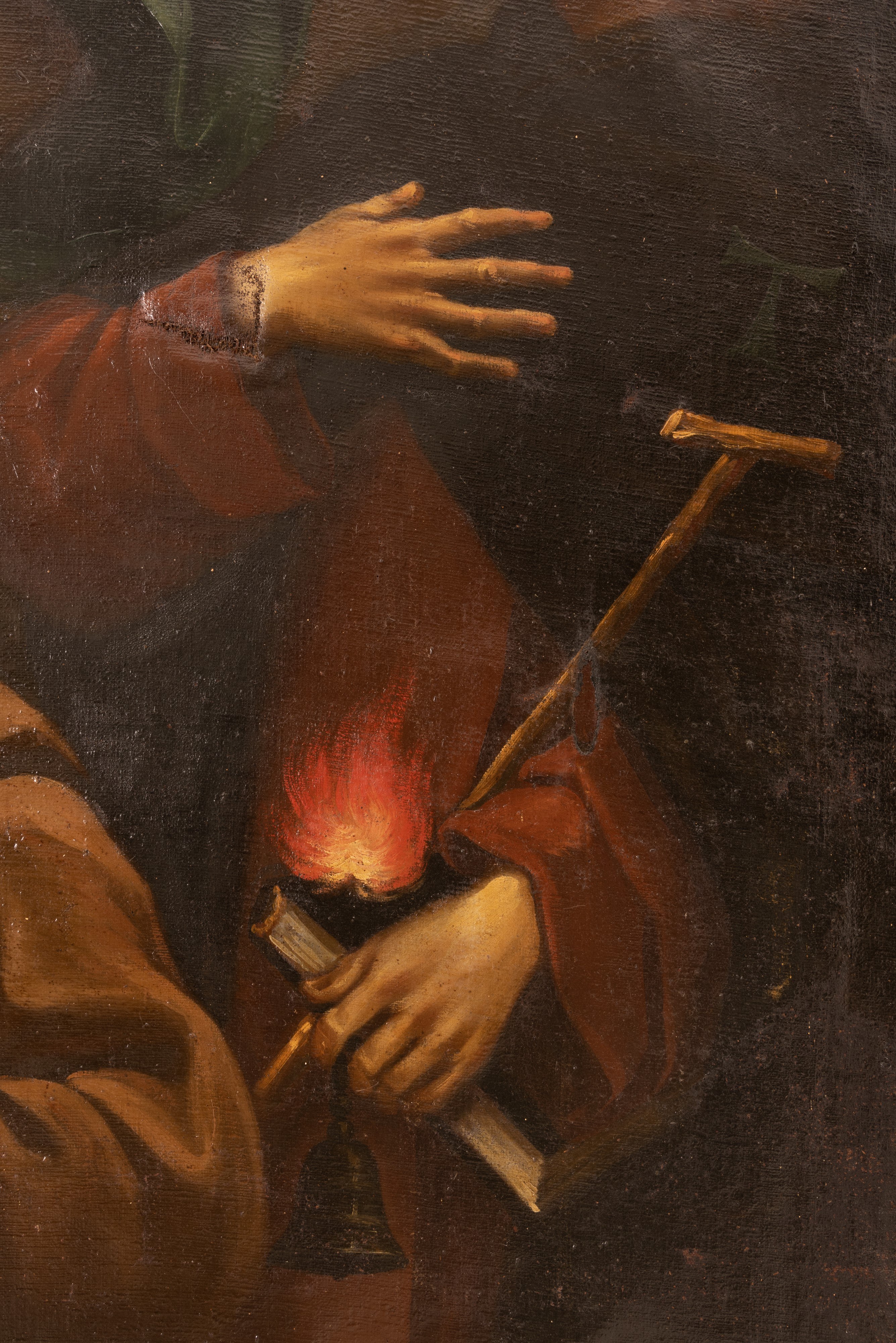 La pala d’altare pone in primo piano e in posizione centrale in basso, il teschio su cui meditava San Francesco d’Assisi, arricchendo la sacra rappresentazione con una allusione alla vanitas dei beni terreni.