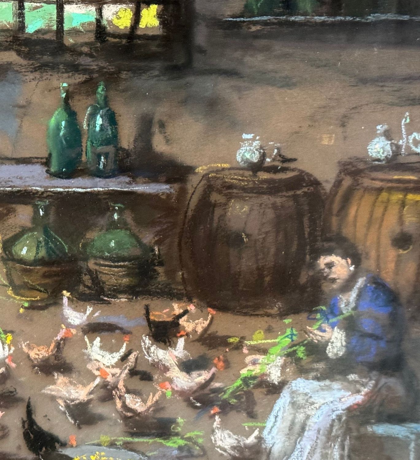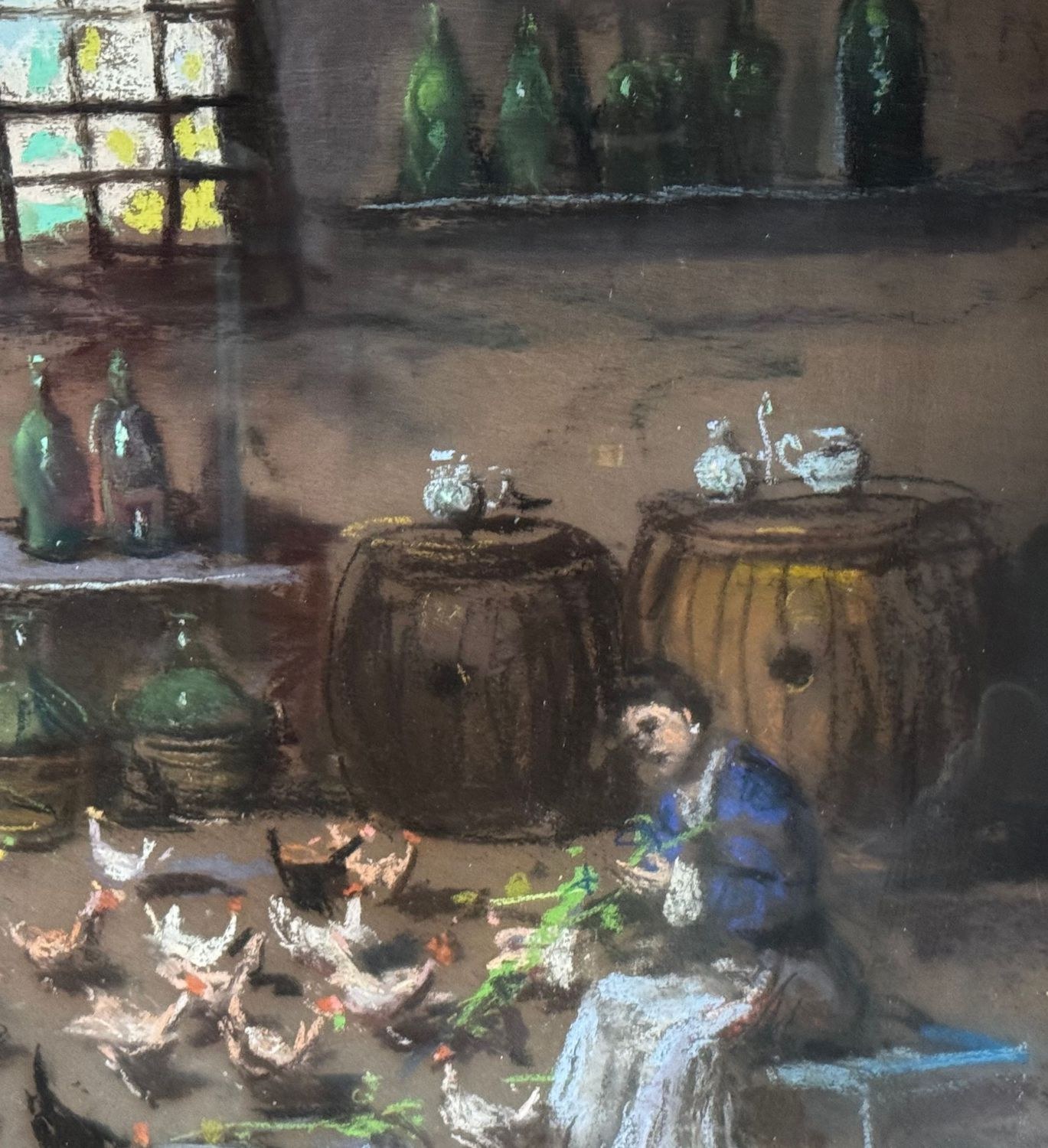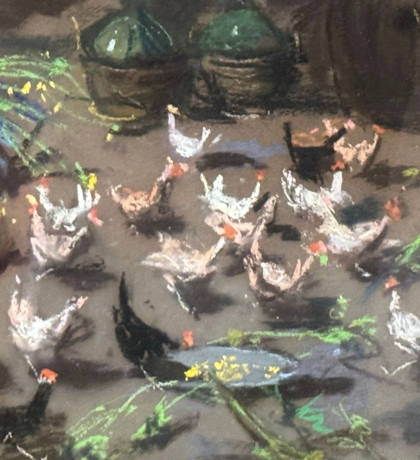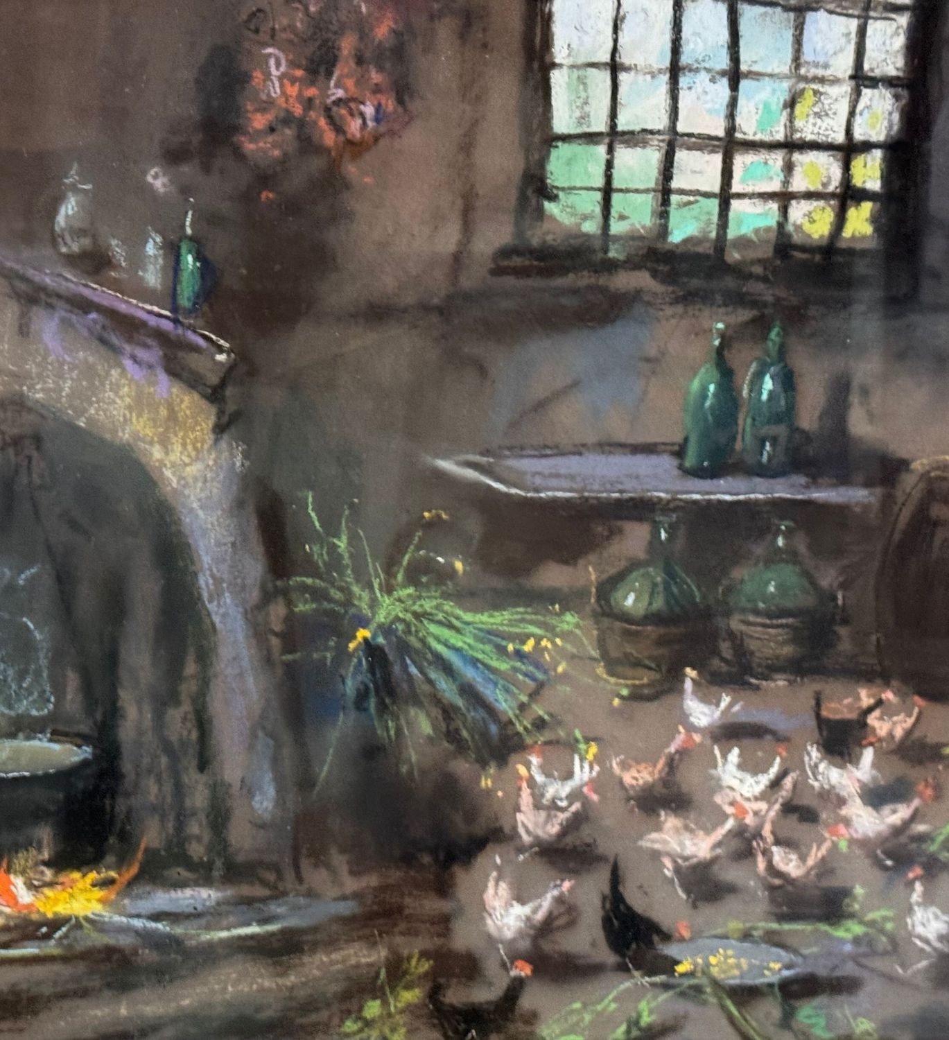 Oil and pastel on board painting, 20th-century period, Italian school, depicting an interior with chickens. Dimensions including frame: 101x86 cm. Inner frame dimensions: 80x60 cm. Bearing signature lower left: R. Carignani. The artwork is in good condition.