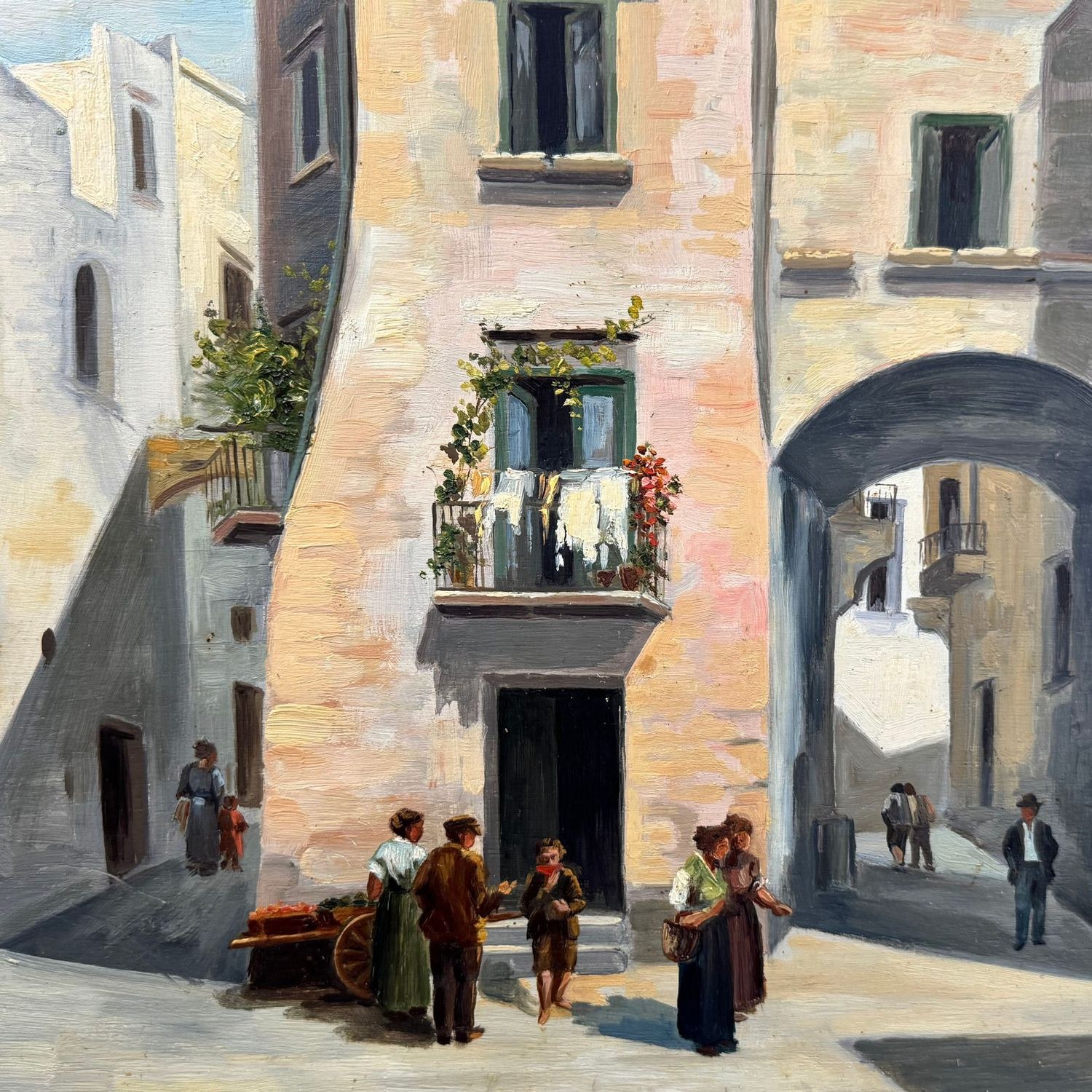 Oil painting on panel, 20th-century Italian school, depicting a View of villages with characters.