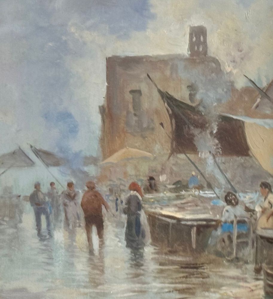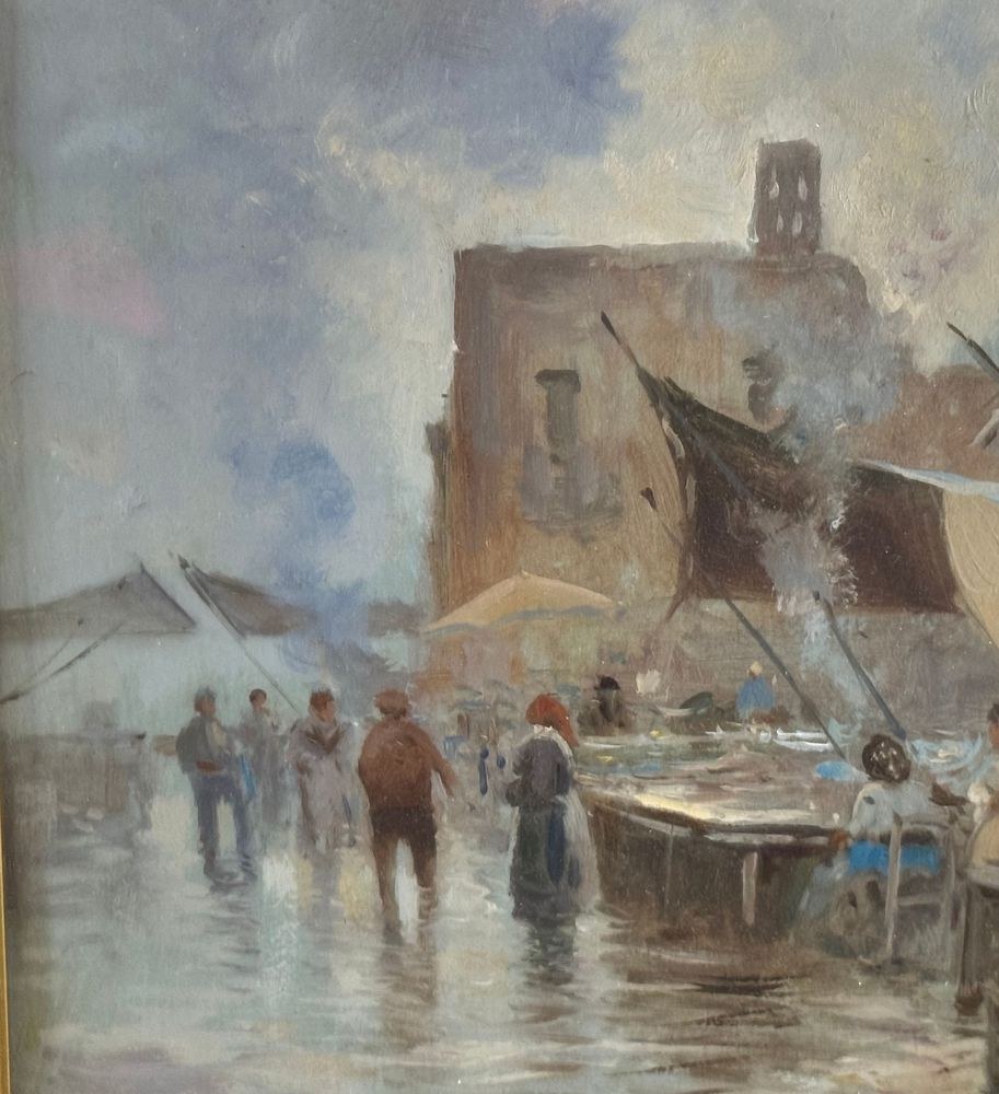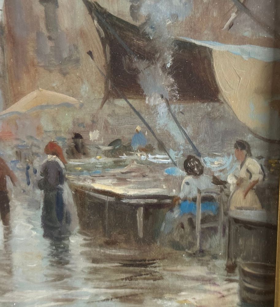Oil painting on panel, 20th-century Italian school, depicting a Market Scene with Figures. Dimensions including frame: 40x45 cm. Dimensions inside the frame: 18x24 cm. Signed lower right: Ricciardi. The work is in good condition.