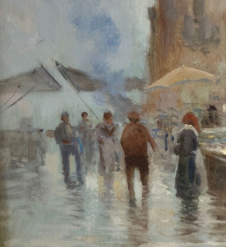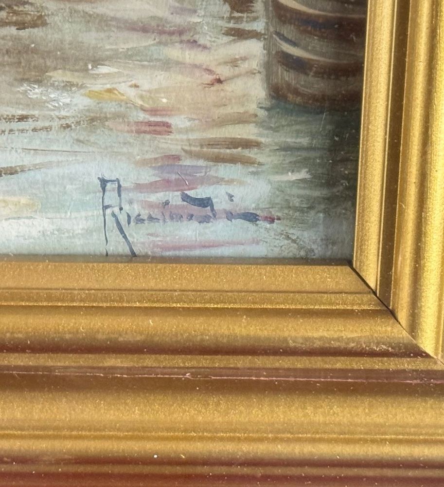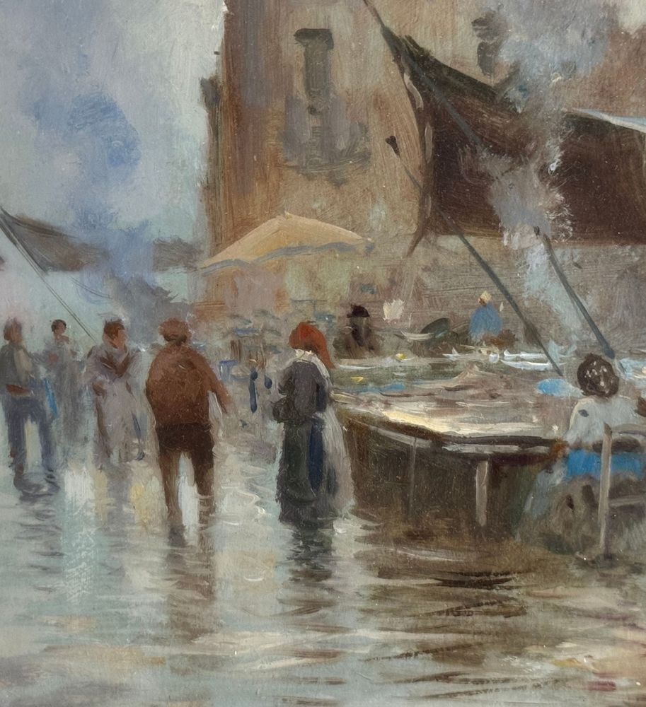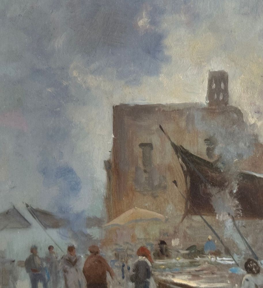 Oil painting on panel, 20th-century Italian school, depicting a Market Scene with Figures. Dimensions including frame: 40x45 cm. Dimensions inside the frame: 18x24 cm. Signed lower right: Ricciardi. The work is in good condition.