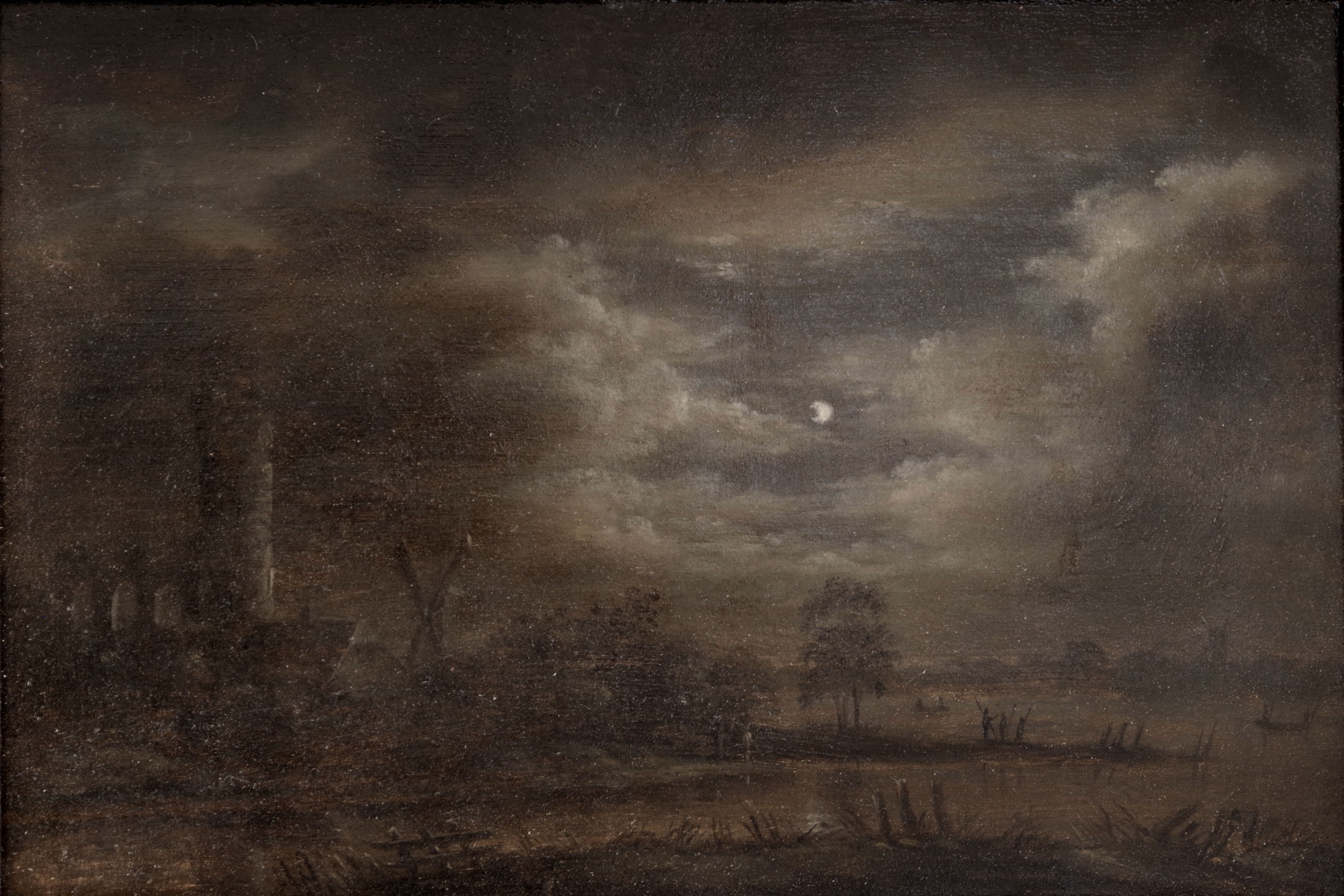 Olej na dřevěné dubové desce, nesignováno, nedatováno. Aernout van der Neer (kol. 1603 Amsterdam –  1677 Amsterdam). Holandsko, 17. století, rozměry 24 x 16 cm. Rámováno.  Stav 2