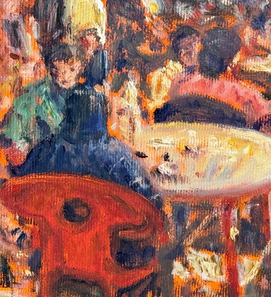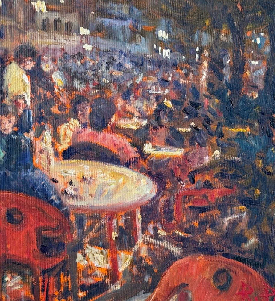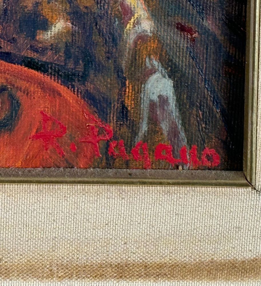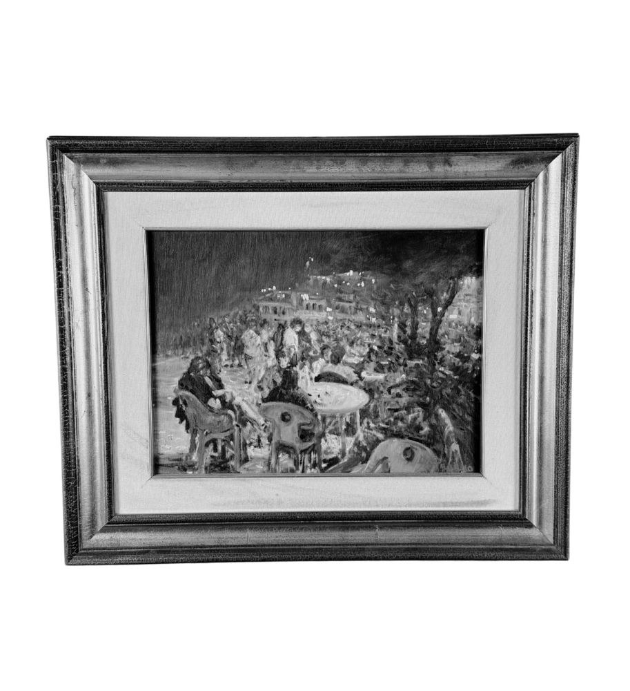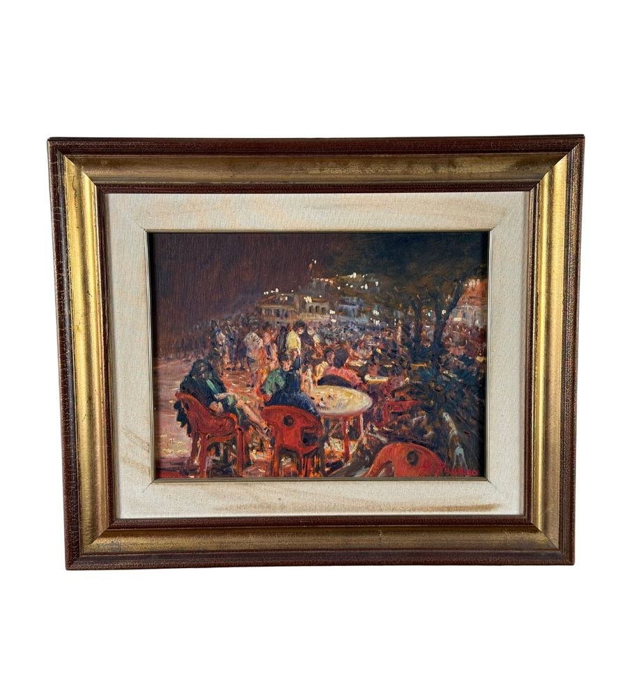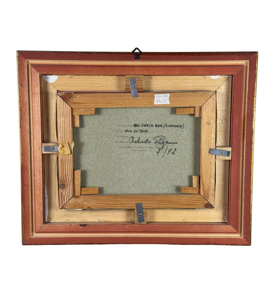 Oil painting on canvas, 20th century, Italian school, titled "At the Snack Bar (Diamante)". Dimensions including the frame: 60x50 cm. Inner frame dimensions: 40x30 cm. Signed in the lower right corner and with authentication on the back by Roberto Pagano. The artwork is in good condition.