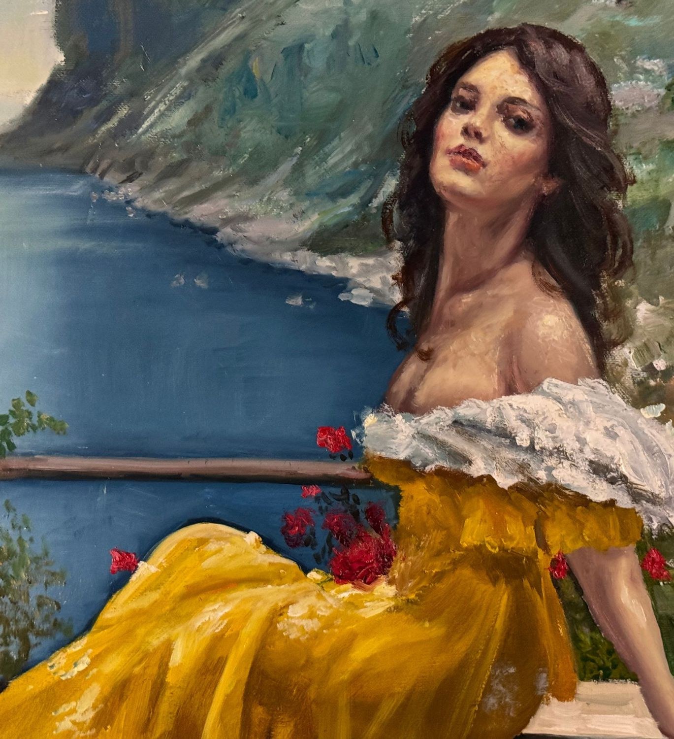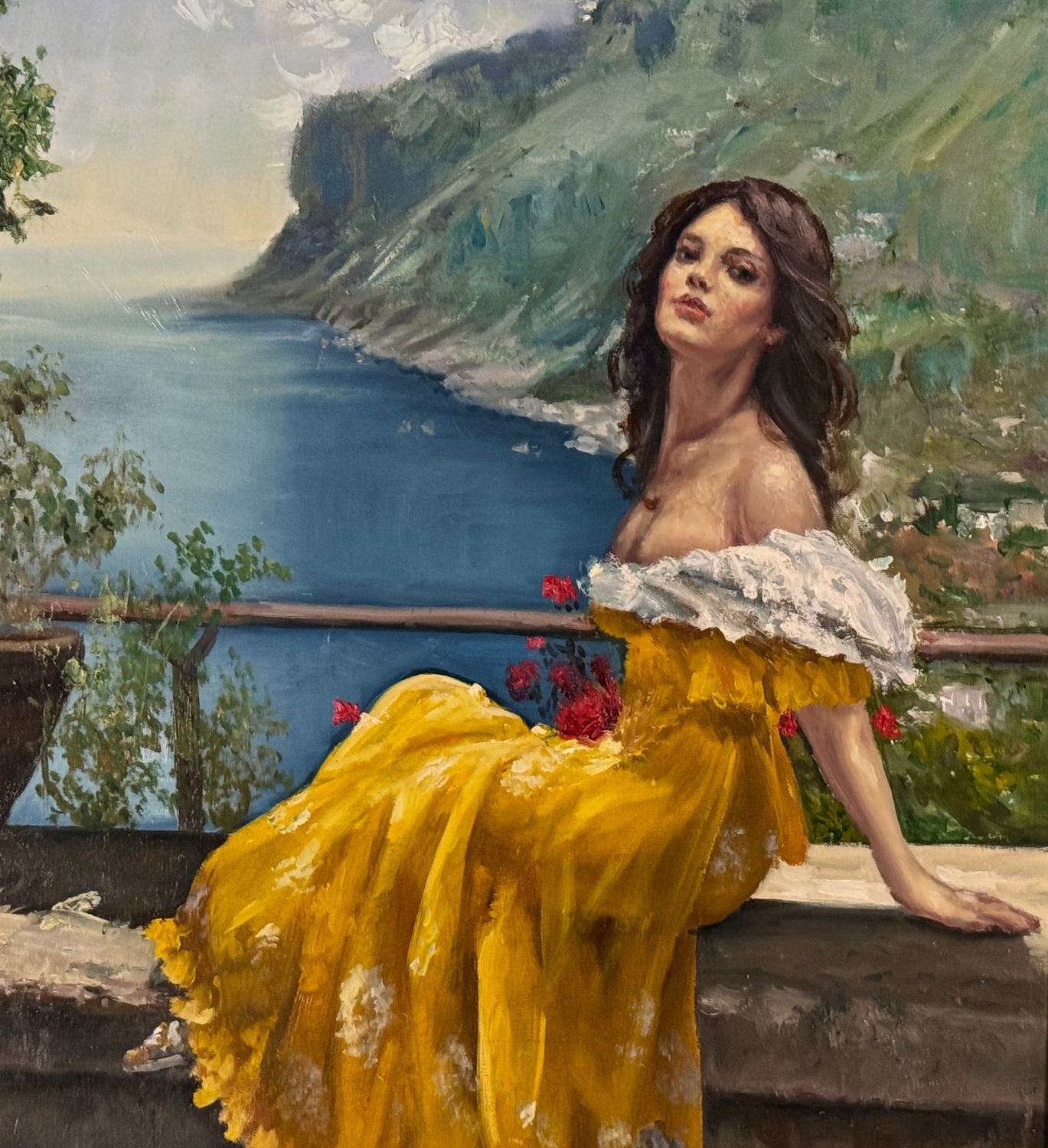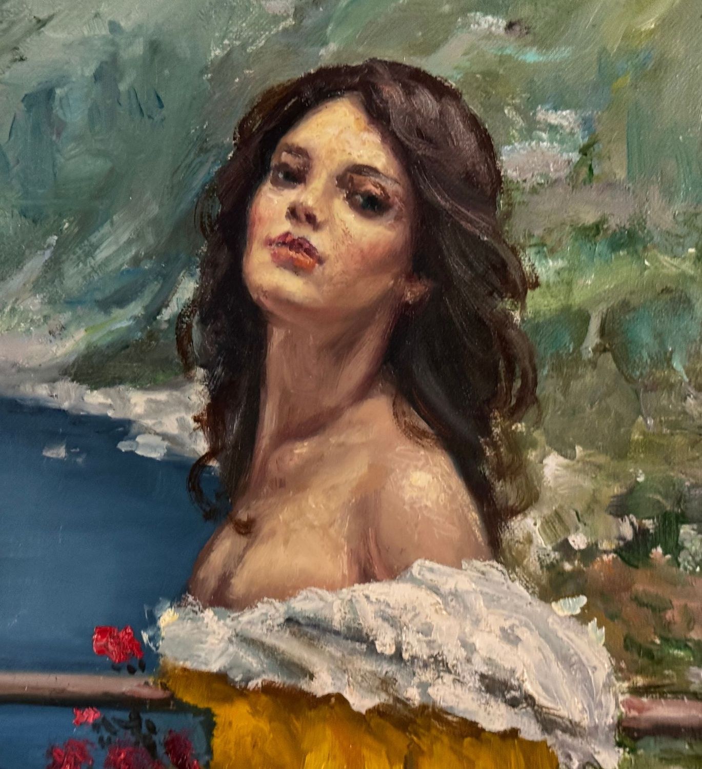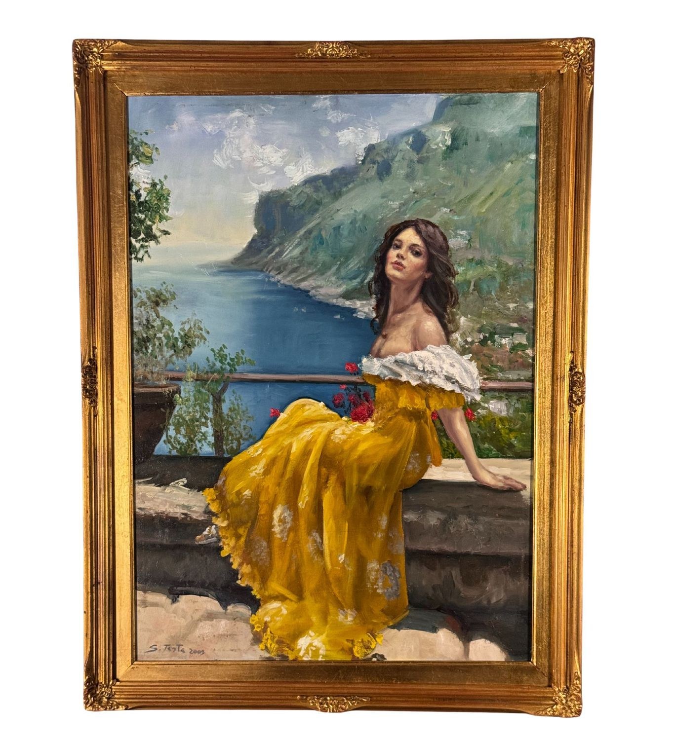 Oil painting on canvas, 20th/21st century Italian school, depicting a portrait of a young woman on the coast. Dimensions including frame: 62x82 cm. Inner frame dimensions: 50x70 cm. Signed lower left by Salvatore Testa. Work in excellent condition.