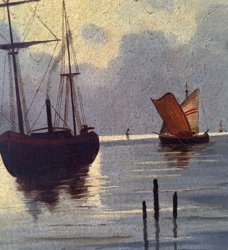 Oil on panel painting, 19th century, European school, depicting a seascape with boats at sunset. Dimensions including frame: 57x47 cm. Inner frame dimensions: 44x36 cm. Signed in the lower left corner by an unidentified artist. Artwork in excellent condition.