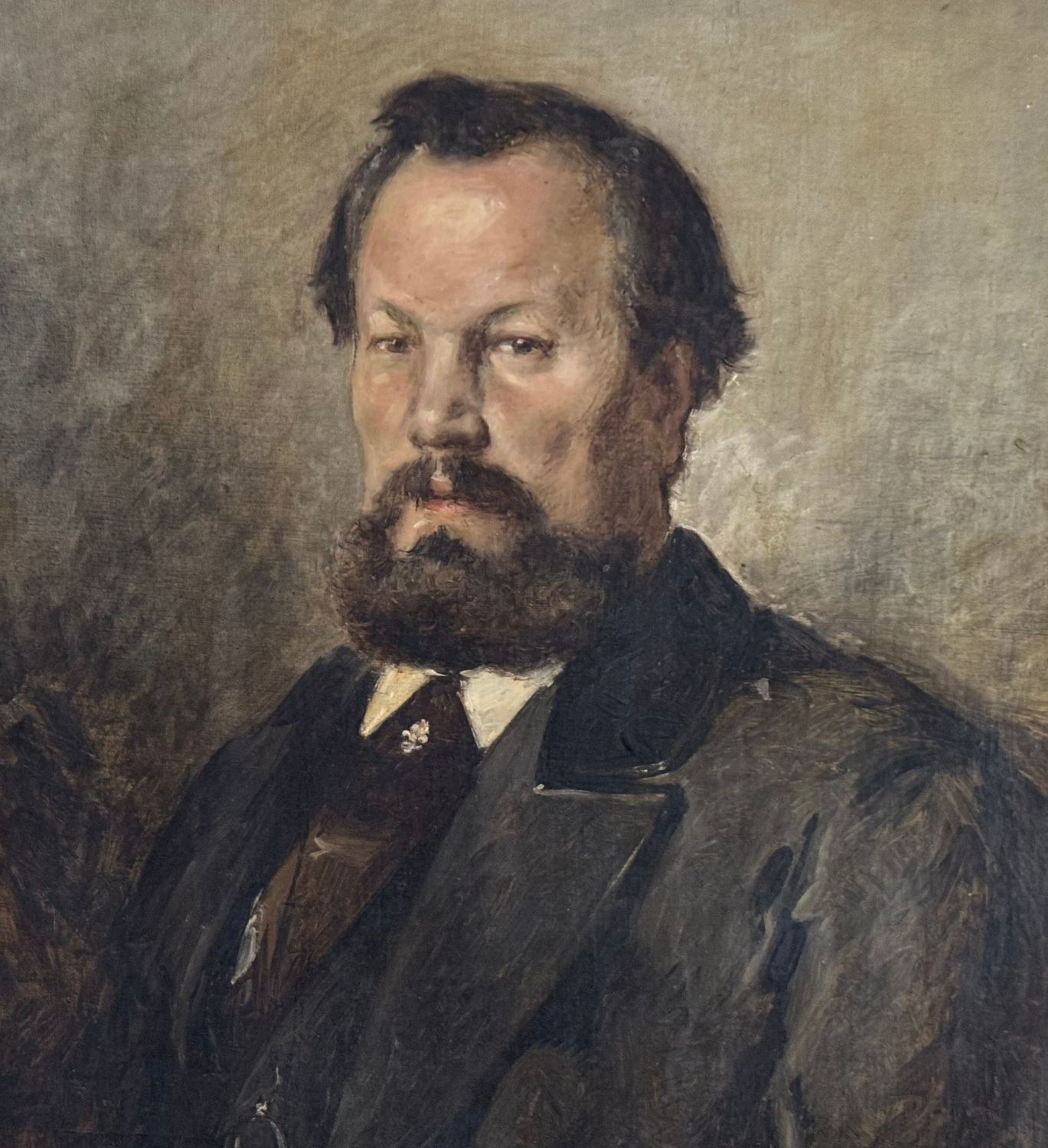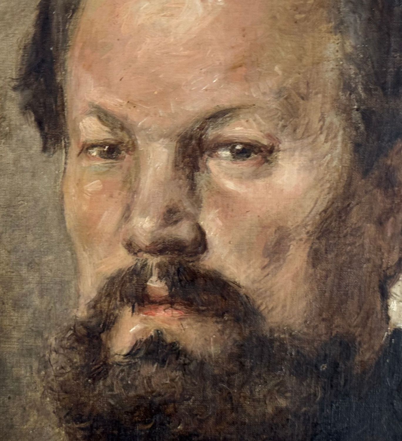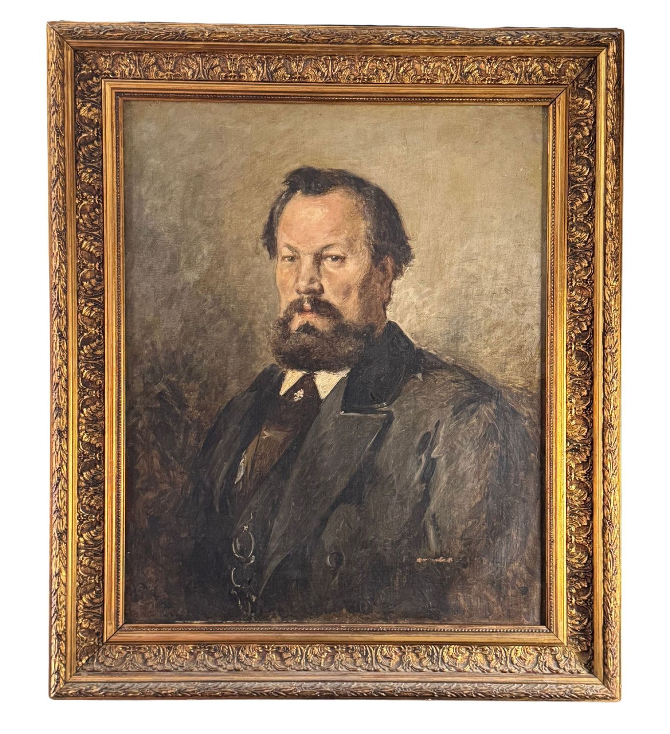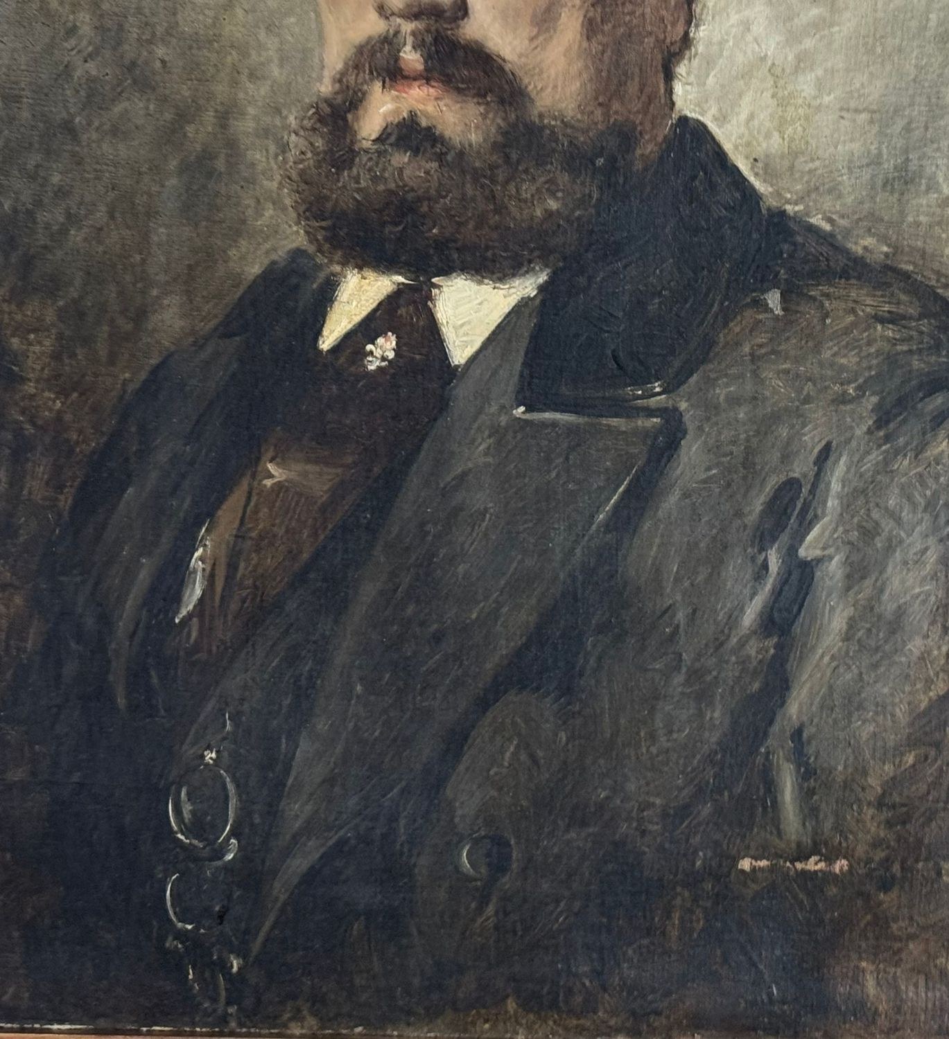 Oil painting on canvas, 19th century, Italian school, depicting a Portrait of a Man. Dimensions including frame: 78x91 cm. Inner frame dimensions: 60x73 cm. Traces of a signature lower left. The artwork is in good condition with minor signs of aging, as shown in the attached photos.