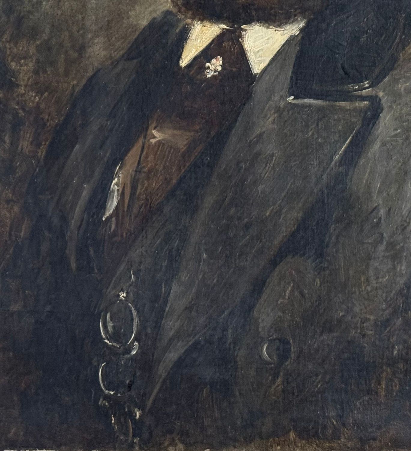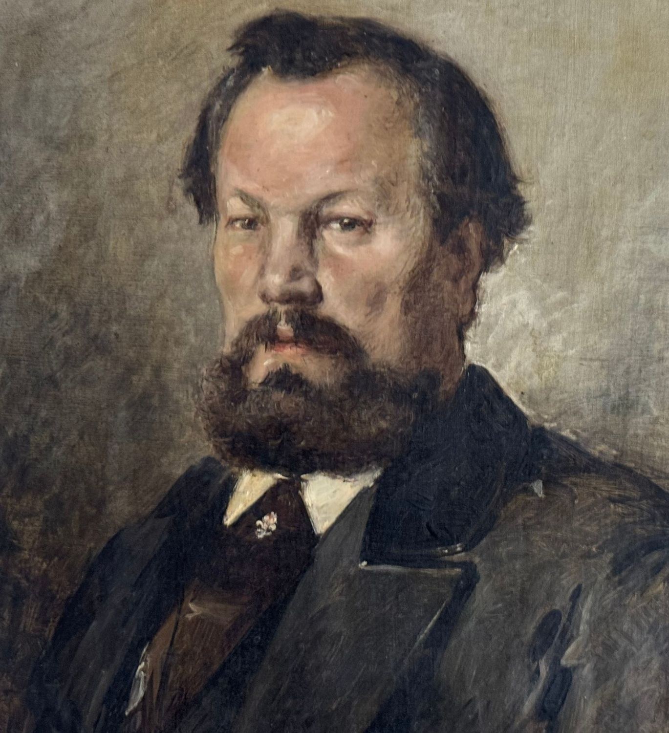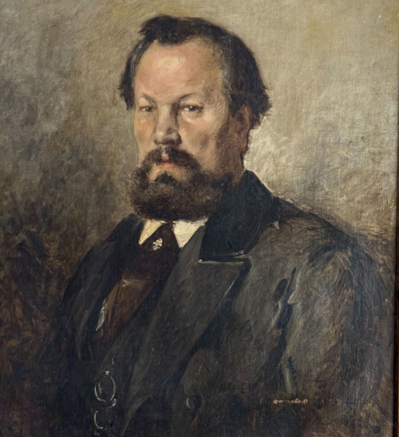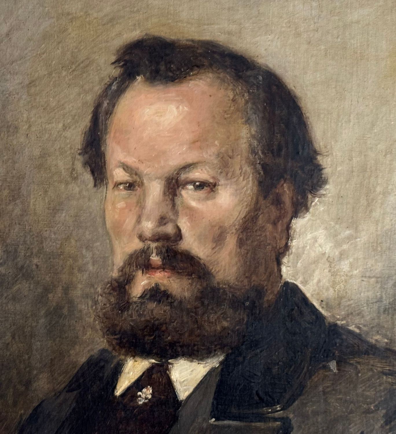 Oil painting on canvas, 19th century, Italian school, depicting a Portrait of a Man. Dimensions including frame: 78x91 cm. Inner frame dimensions: 60x73 cm. Traces of a signature lower left. The artwork is in good condition with minor signs of aging, as shown in the attached photos.