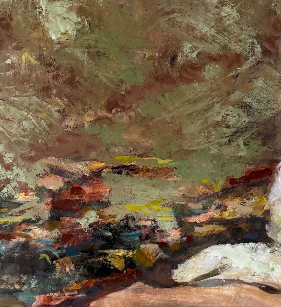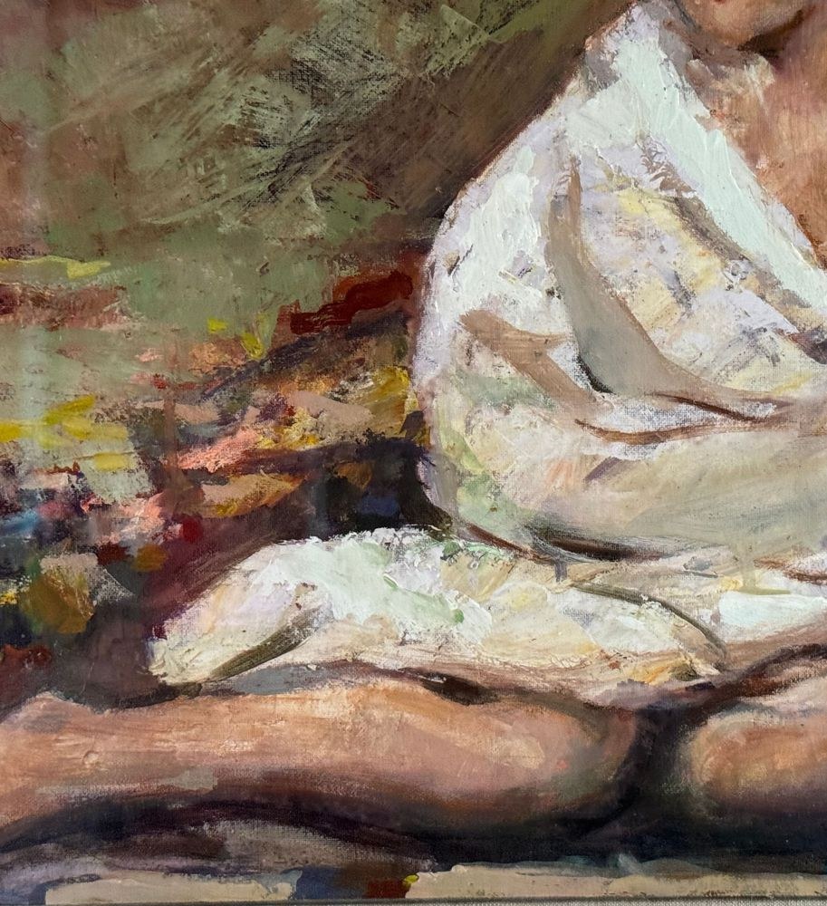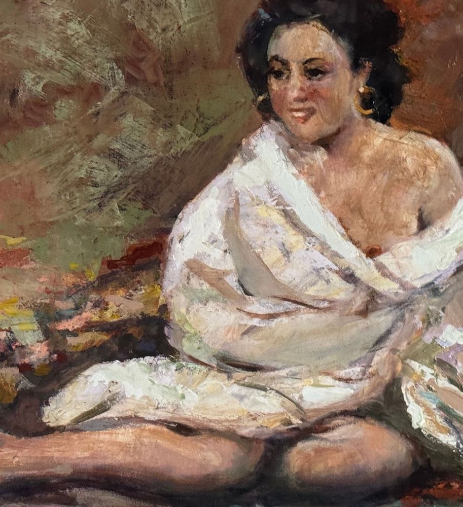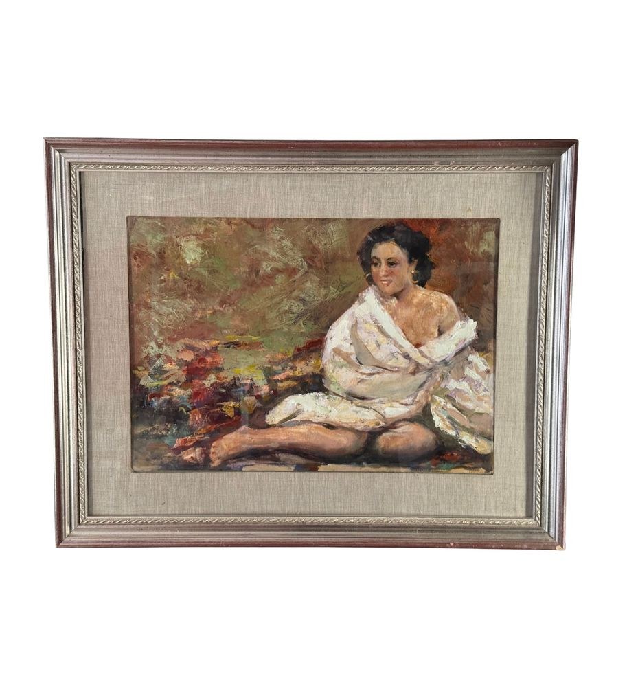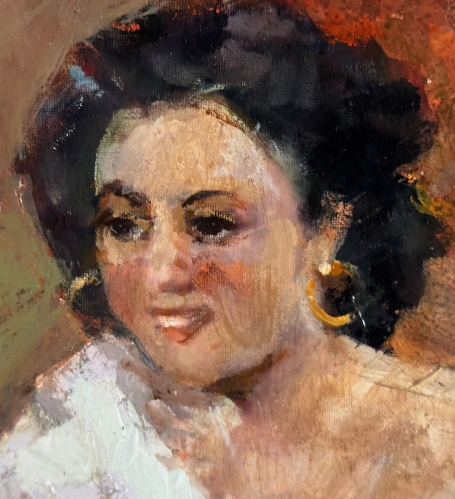 Oil on panel painting, 20th-century period, Italian school, depicting a portrait of a woman in a garden. Based on a work by Vincenzo Irolli. Dimensions including frame: 70x56 cm. Inner frame dimensions: 50x35 cm. By an anonymous artist. The artwork is in good condition.