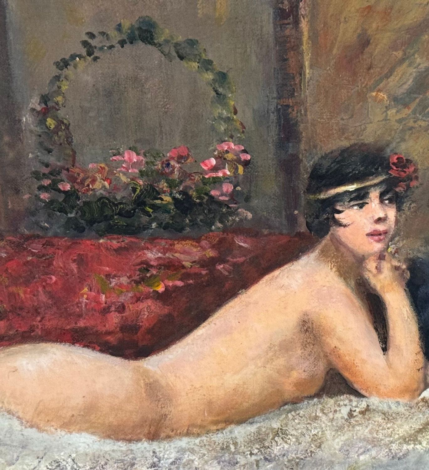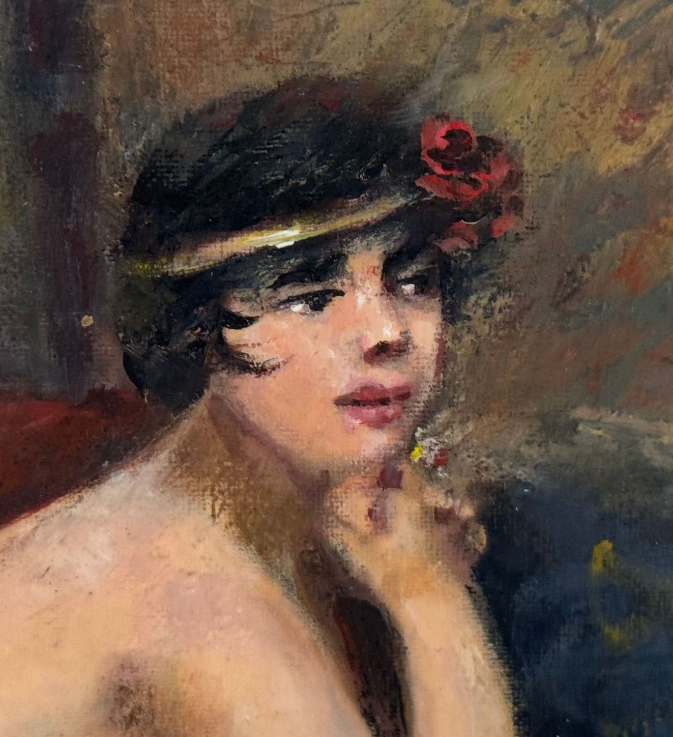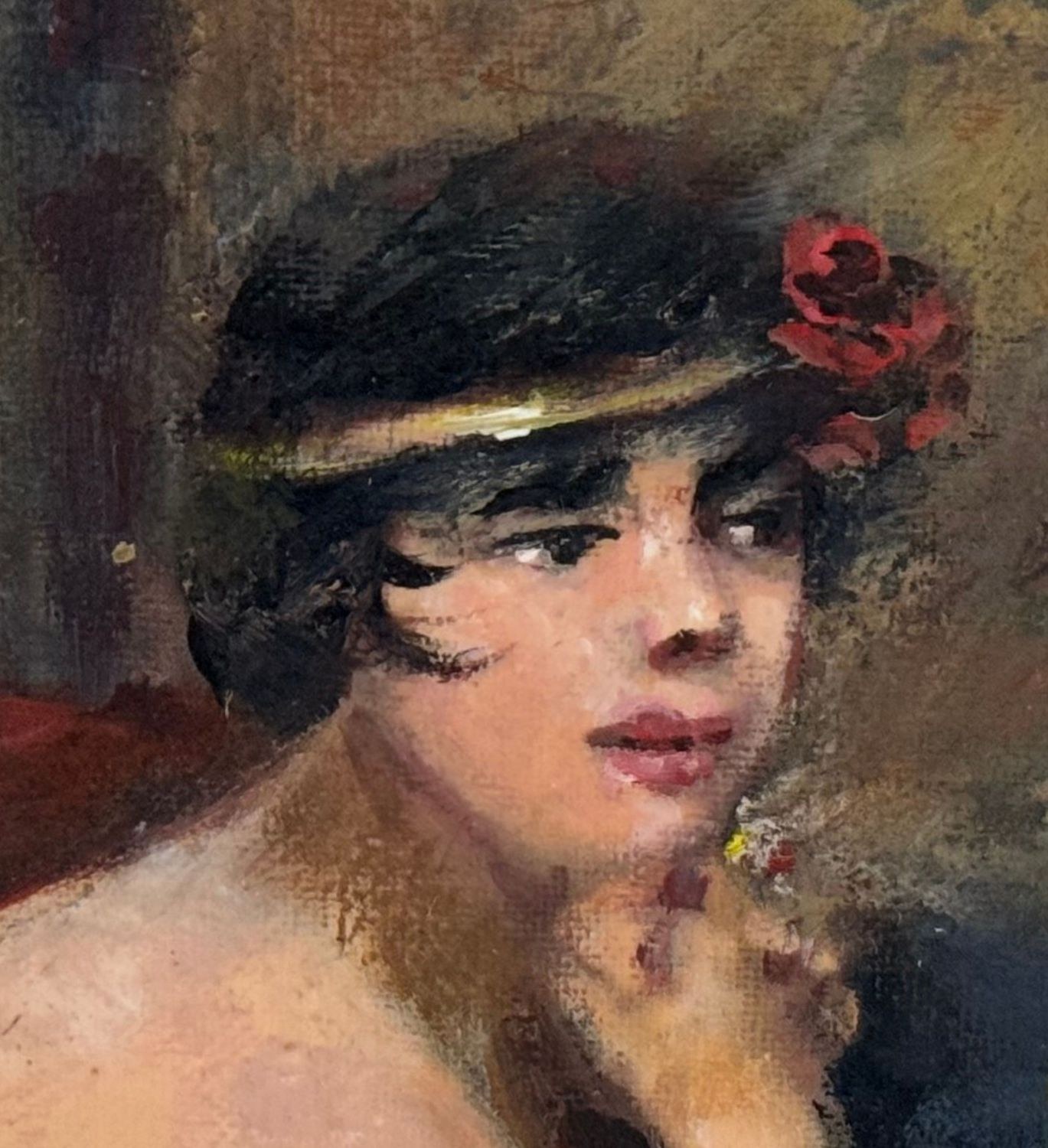 Oil painting on canvas-mounted cardboard, 20th-century period, Italian school, depicting a portrait of the model. Dimensions including the frame: 54 × 44 cm. Dimensions inside the frame: 30 × 40 cm. By an anonymous artist. Artwork in good condition.