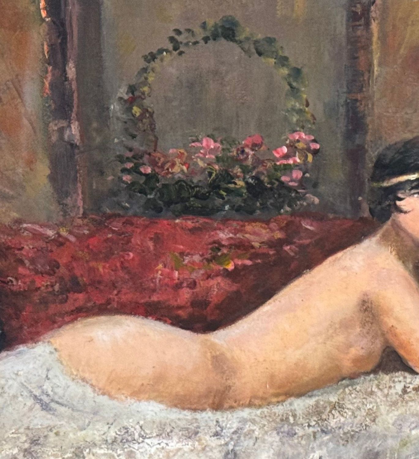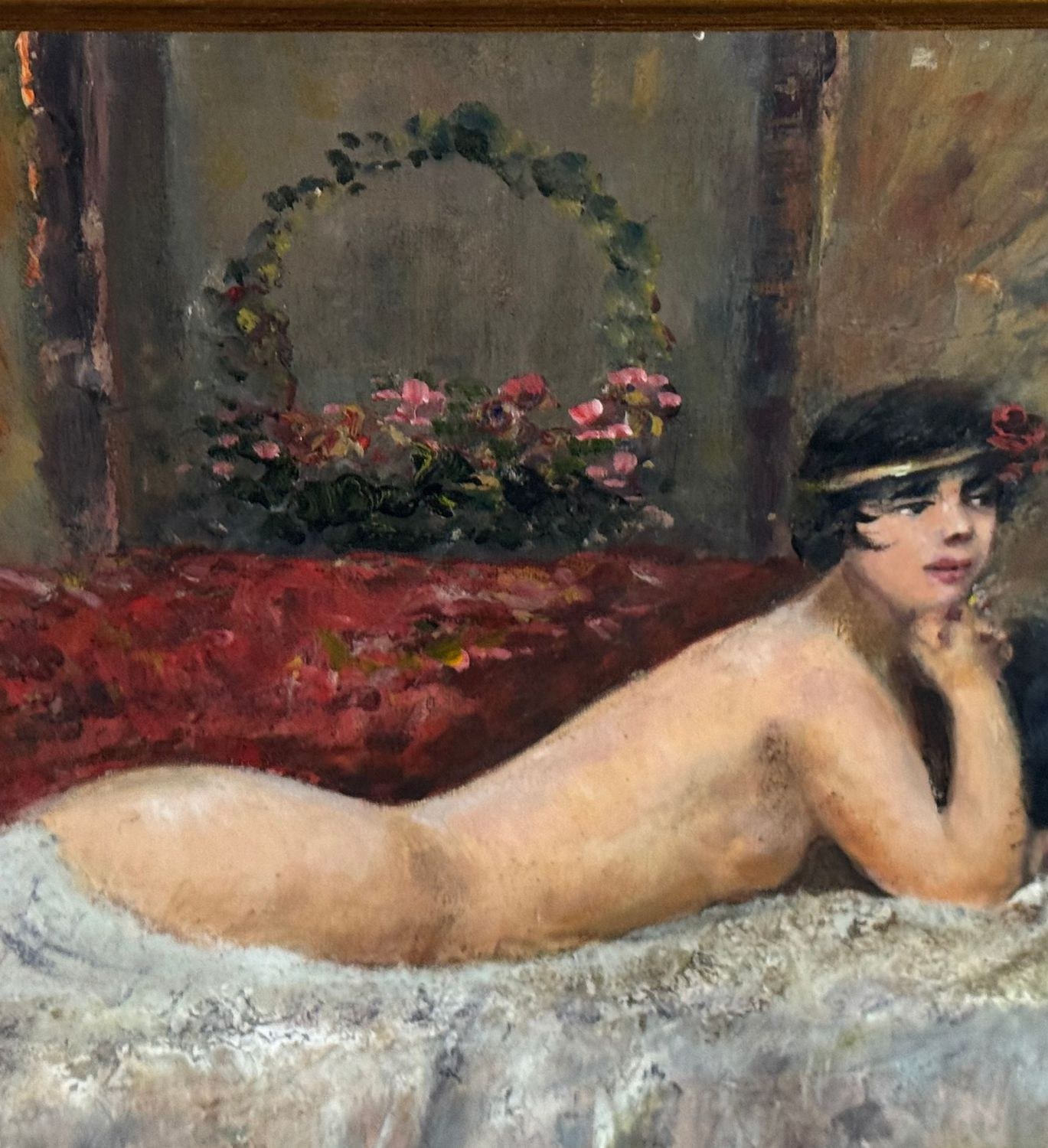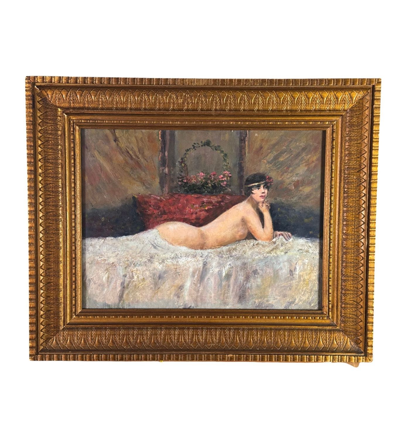 Oil painting on canvas-mounted cardboard, 20th-century period, Italian school, depicting a portrait of the model. Dimensions including the frame: 54 × 44 cm. Dimensions inside the frame: 30 × 40 cm. By an anonymous artist. Artwork in good condition.