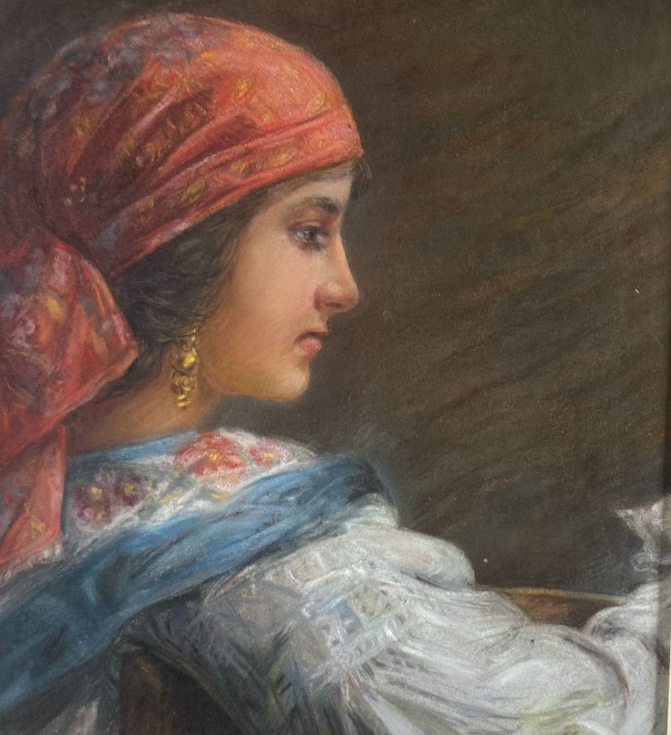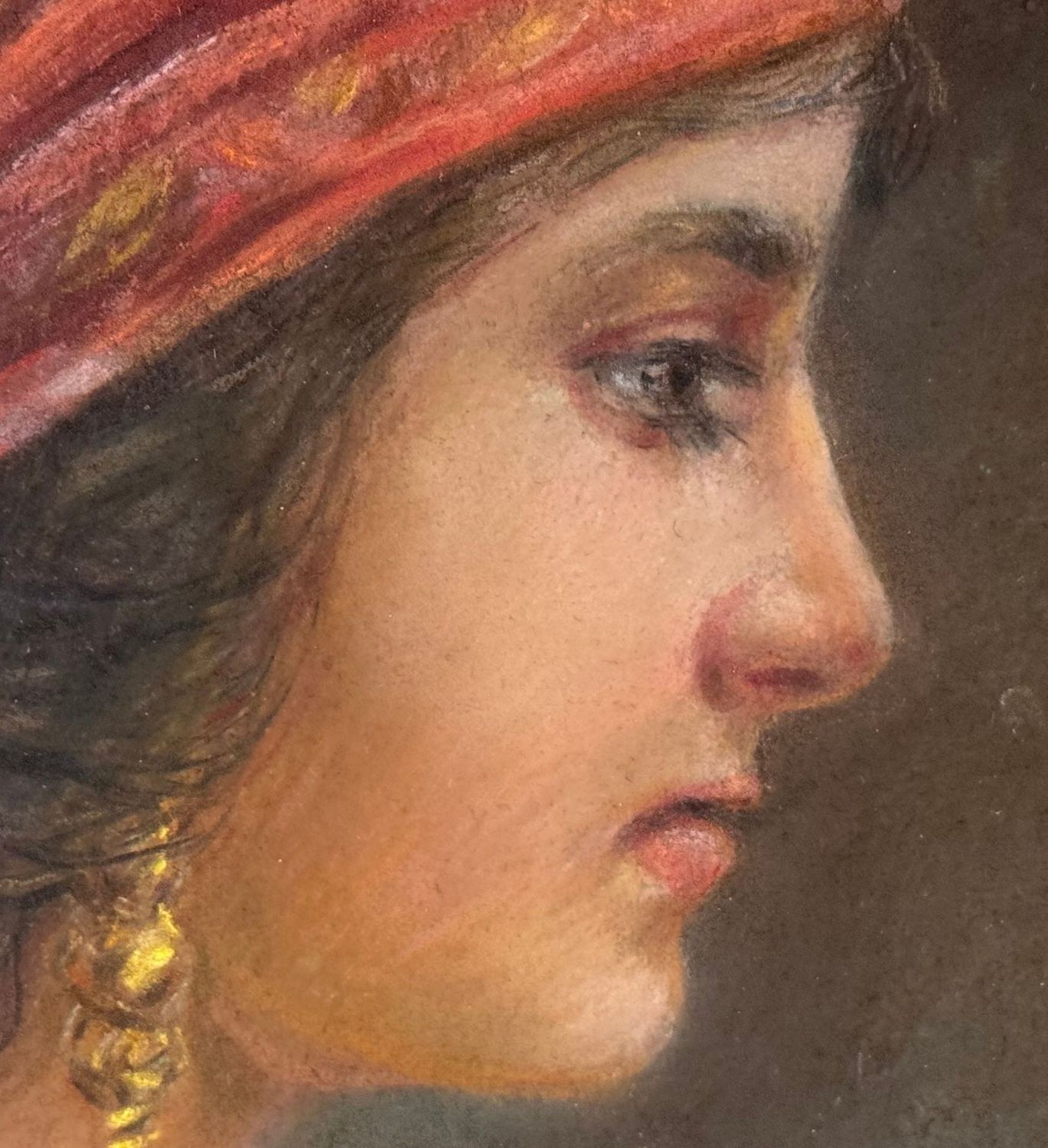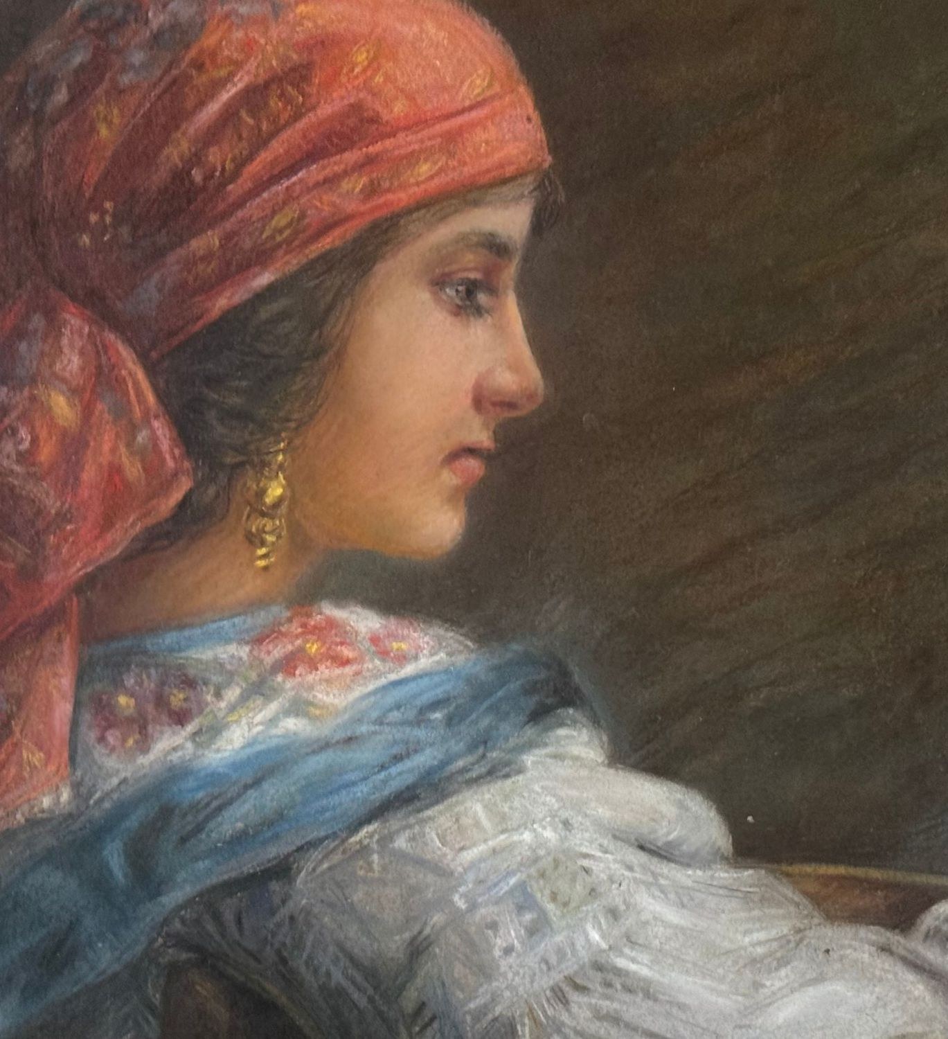 Mixed media painting on cardboard, 20th century period, Italian school, depicting a profile of a woman with a turban. Dimensions including frame: 64 × 79 cm. Inner frame dimensions: 60 × 45 cm. Bears signature at lower right, unidentified artist. Artwork in good condition.