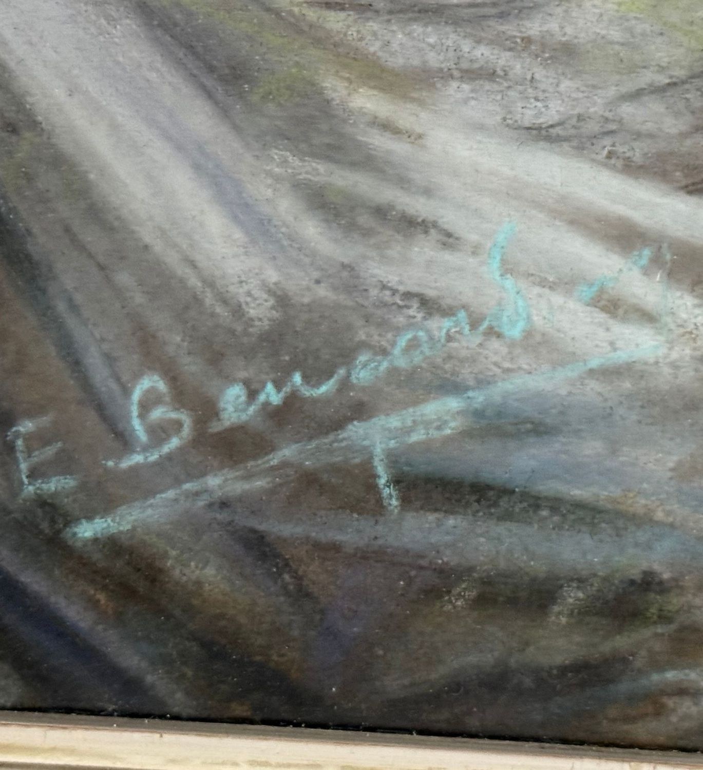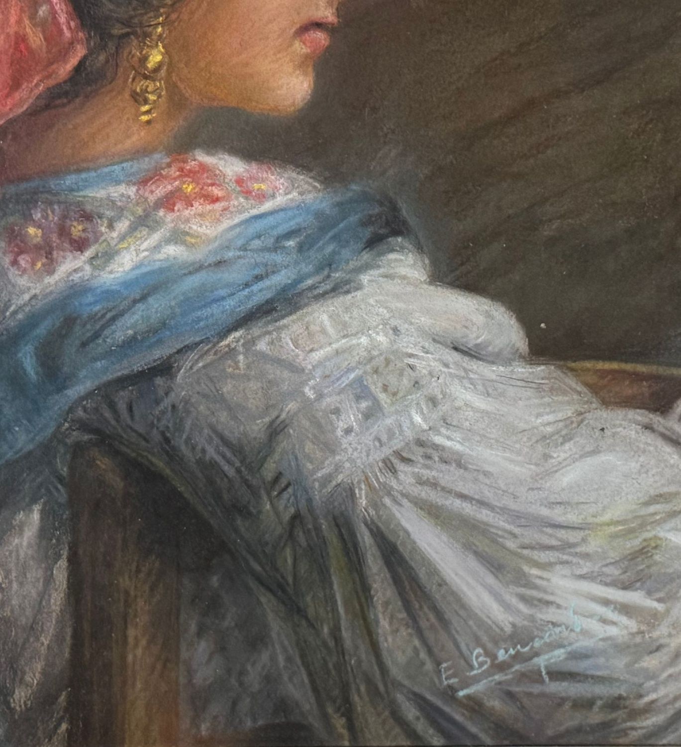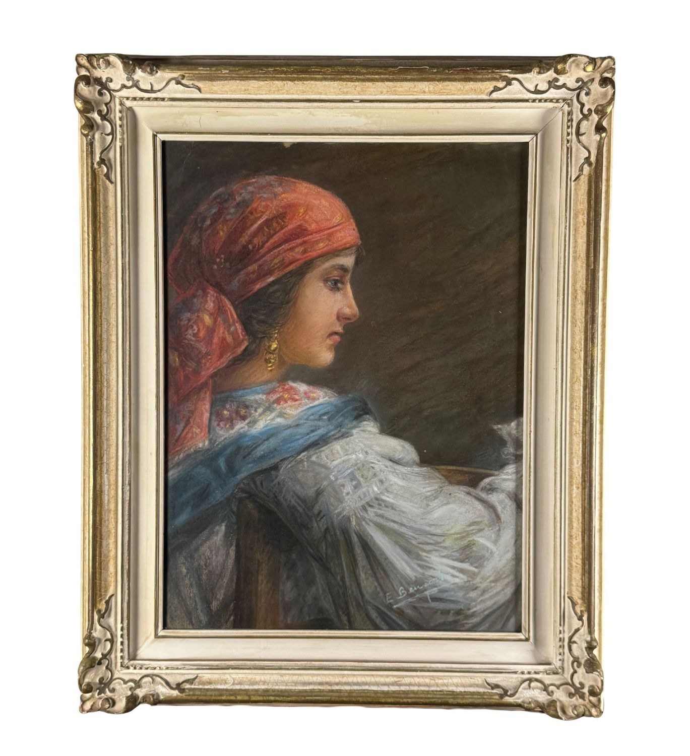 Mixed media painting on cardboard, 20th century period, Italian school, depicting a profile of a woman with a turban. Dimensions including frame: 64 × 79 cm. Inner frame dimensions: 60 × 45 cm. Bears signature at lower right, unidentified artist. Artwork in good condition.
