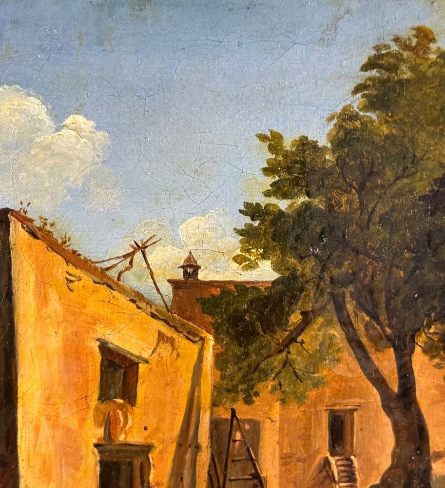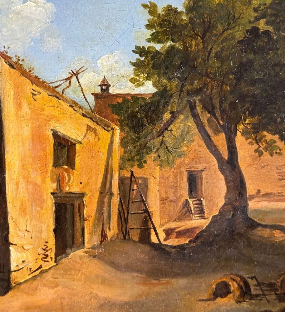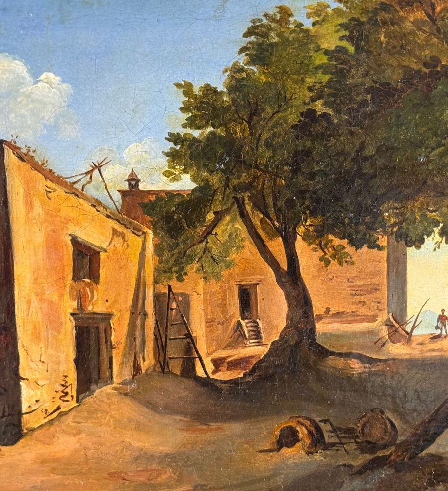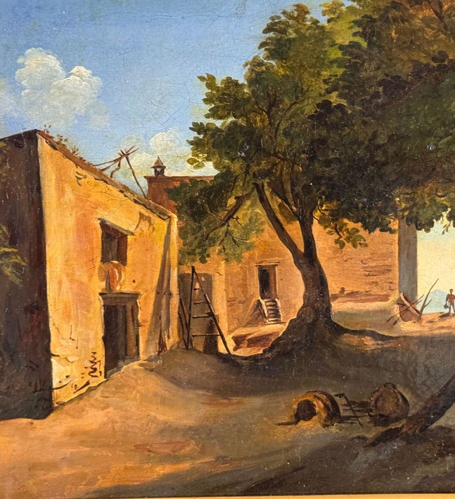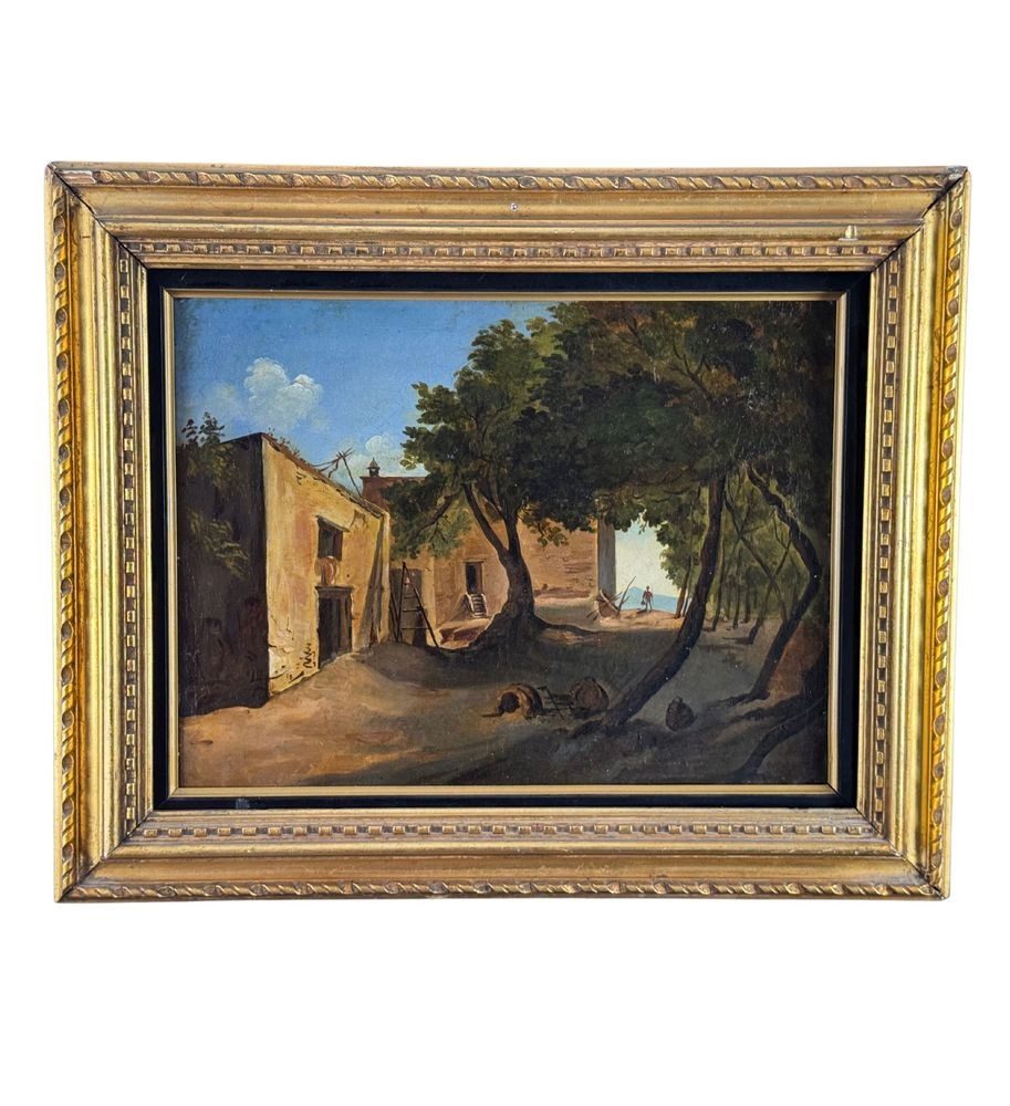 Oil painting on canvas, 19th century, Neapolitan school, depicting Old Farmhouses. Dimensions including frame: 55x45 cm. Inner frame dimensions: 40x31 cm. Bears a signature lower right, attributable to Ercole Gigante. The artwork is in excellent condition.