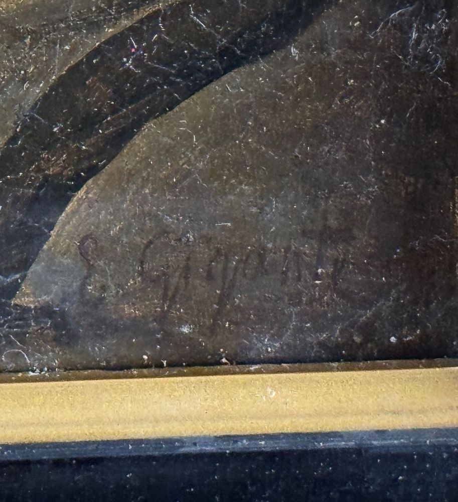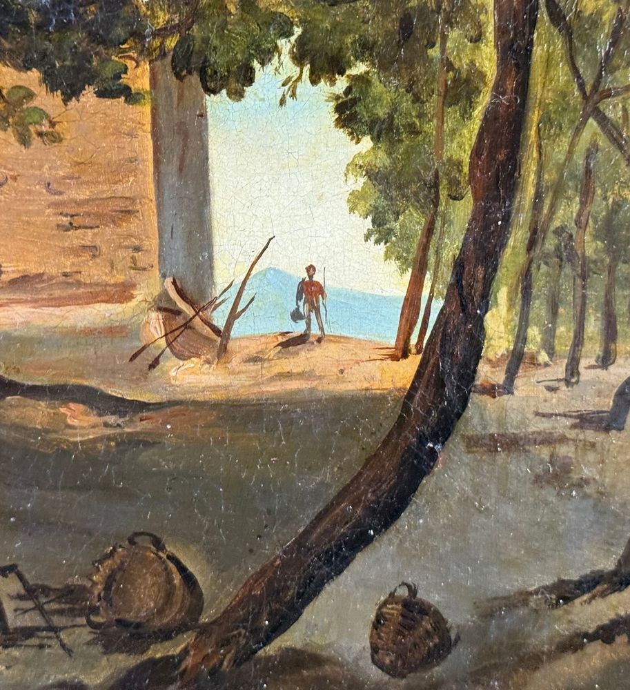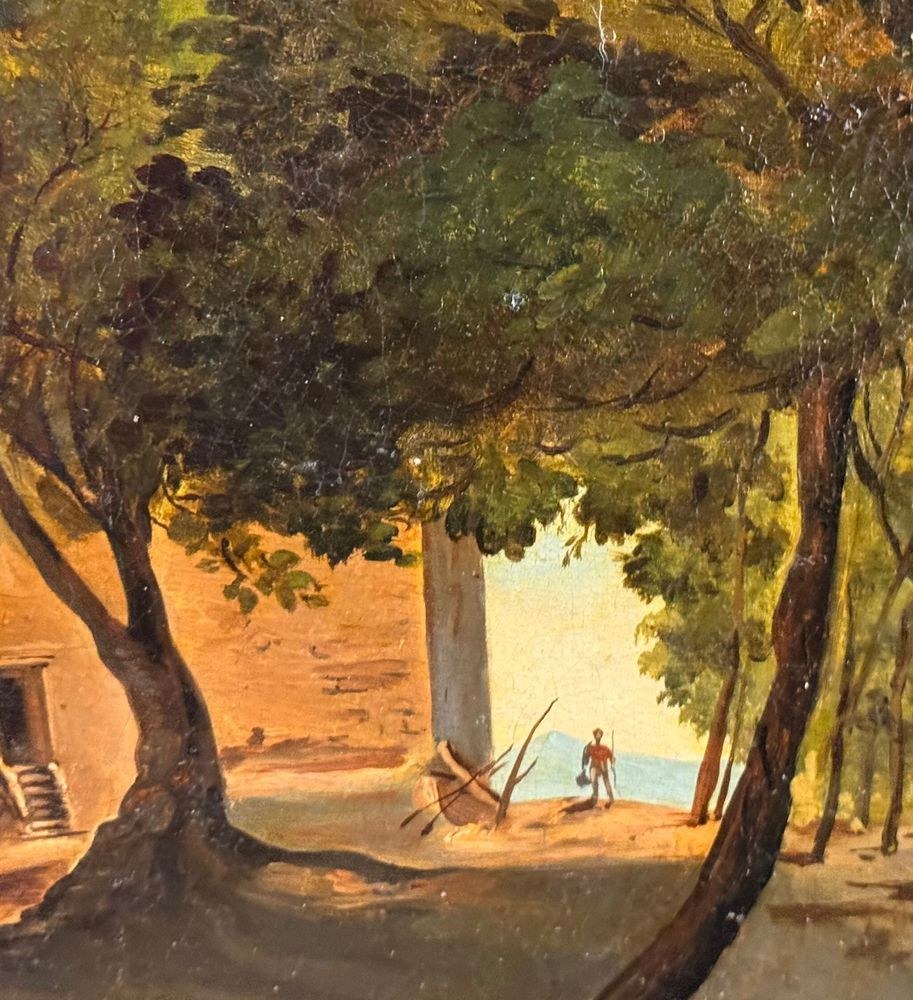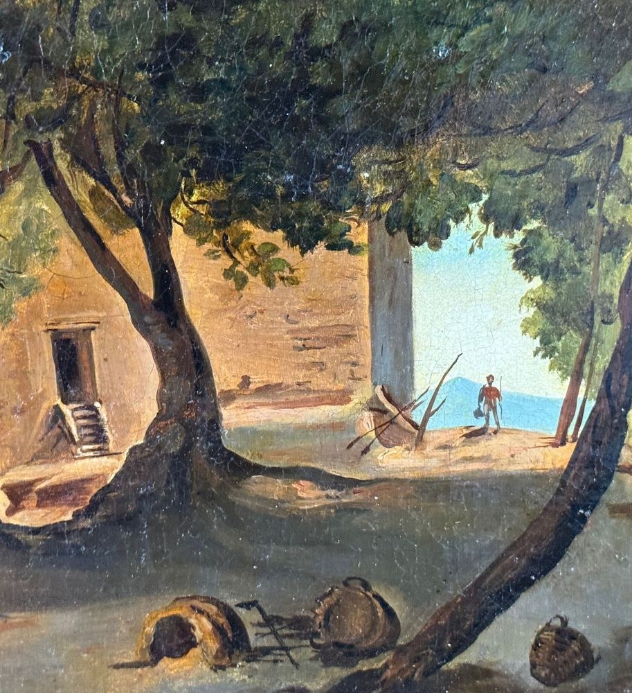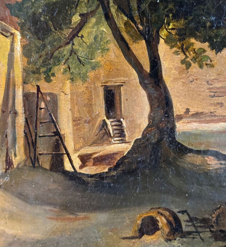 Oil painting on canvas, 19th century, Neapolitan school, depicting Old Farmhouses. Dimensions including frame: 55x45 cm. Inner frame dimensions: 40x31 cm. Bears a signature lower right, attributable to Ercole Gigante. The artwork is in excellent condition.