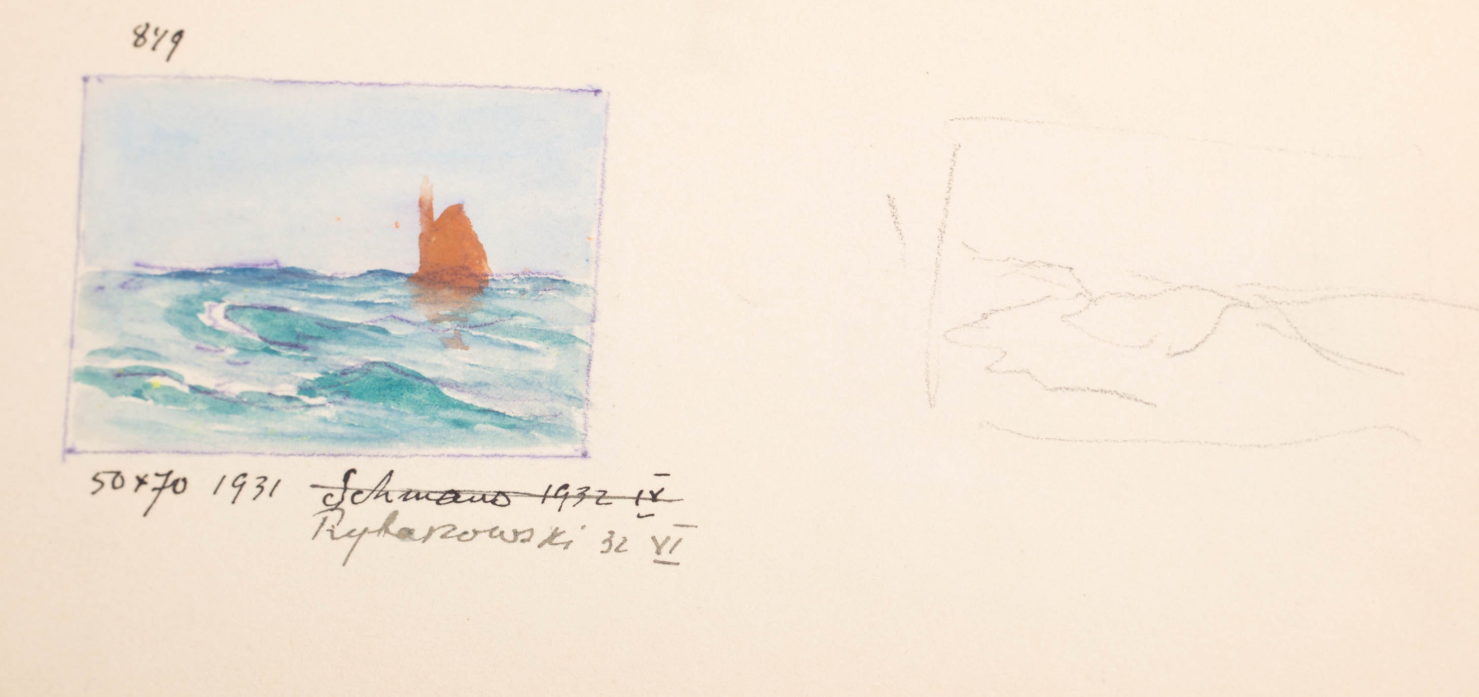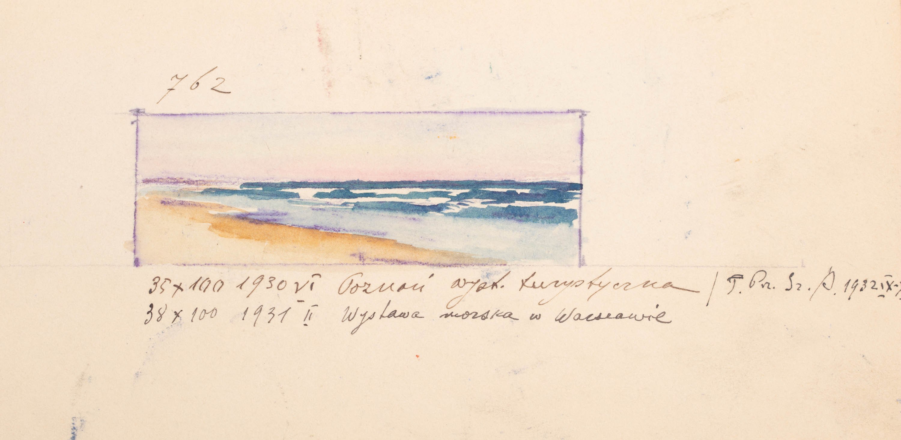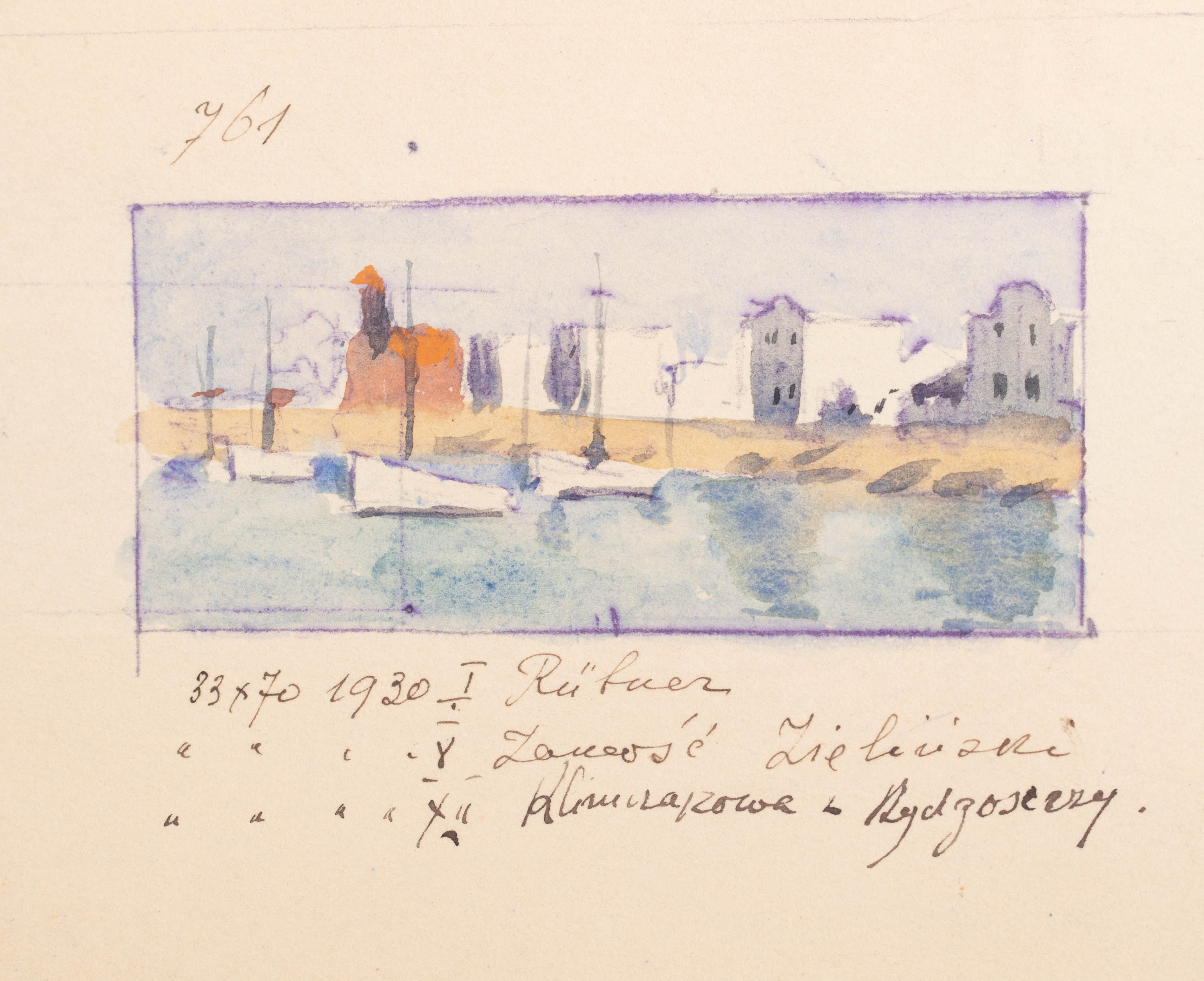 Każda akwarela ponumerowana i autorsko opisana od nr 751 do 934. Szkicownik malowany od czerwca 1930 do 27 czerwca 1939 roku. Każda miniatura akwarelowa opatrzona jest autorskim opisem: m.in. nazwą namalowanej miejscowości (np. Gdynia, Orłowo, Jastrzębia Góra, Hel), datą powstania oraz nazwiskami kolekcjonerów i wymiarami prac, które najprawdopodobniej zostały zrealizowane. Do szkicownika dołączone są luźne oraz wklejone strony z gazet, omawiających wystawy i twórczość Jaxy-Małachowskiego – m.in.: „Czas” z 1932 r i z 1938 r., „Ilustrowany Kuryer Codzienny” z 1932 r., „Niedziela” z 1932 r. W szkicowniku również jest autorski szablon do wykreślania pól akwarel. Dodatkowo umieszczono trzy fotografie obrazów z opisem (dwa portrety oraz obraz żaglowca).