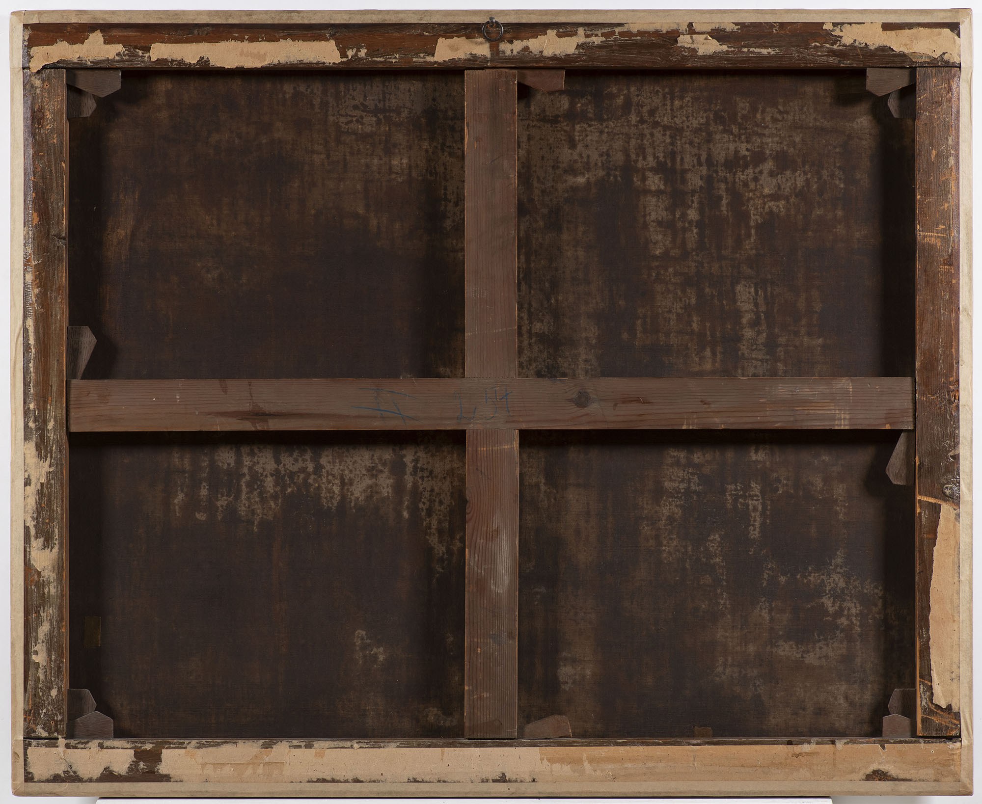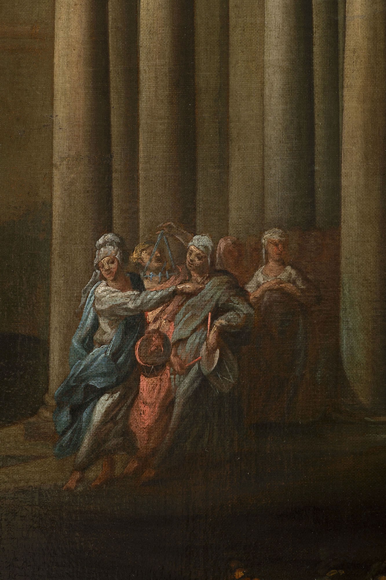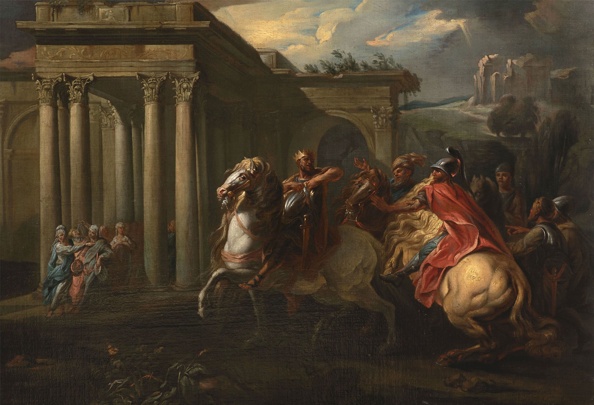 Against a landscape background and a large palatial building with columns, Jephta in armor riding on a magnificent gray horse, behind whom several soldiers on horseback can be seen. As the leader of the Israelite army, Jephthah had defeated the enemy Ammonites in a very great battle. Before the battle, however, he had sworn that he would dedicate to the Lord what would be the first thing that would come out of his house upon his return. Depicted is the moment when he returns and the first thing he sees is his daughter, his only child. He is deeply sad about this and in pain, as can be seen in the painting, he tears his clothes under the armor in anger and sadness. The soldiers following him look at him in shock. On the left in front of the entrance to the house his daughter in a white robe with a headgear, with three musicians leading the way. While the scenic background on the right side of the picture shows a sunny sky, dark, almost black clouds are already hanging over the tall, palatial building, heralding the impending doom. High-quality fine painting with skilful light and shadow staging