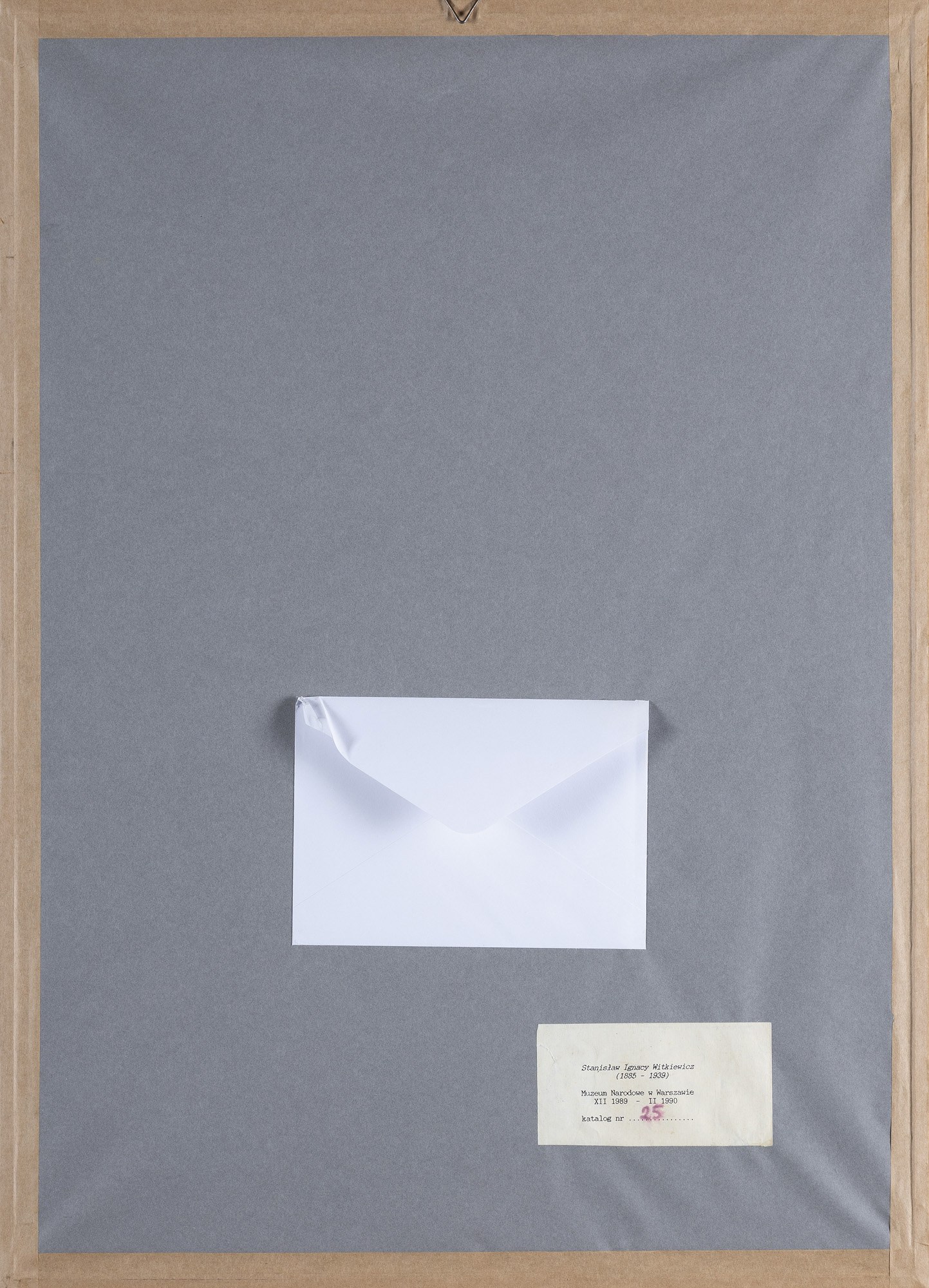 Na tzw. zaplecku u dołu po prawej papierowa nalepka (druk, czarny flamaster): Stanisław Ignacy Witkiewicz | (1885-1939) | Muzeum Narodowe w Warszawie | XII 1989 – II 1990 | katalog nr 25; pośrodku przyklejona koperta z protokołem zwrotu obrazu z wystawy w MNW