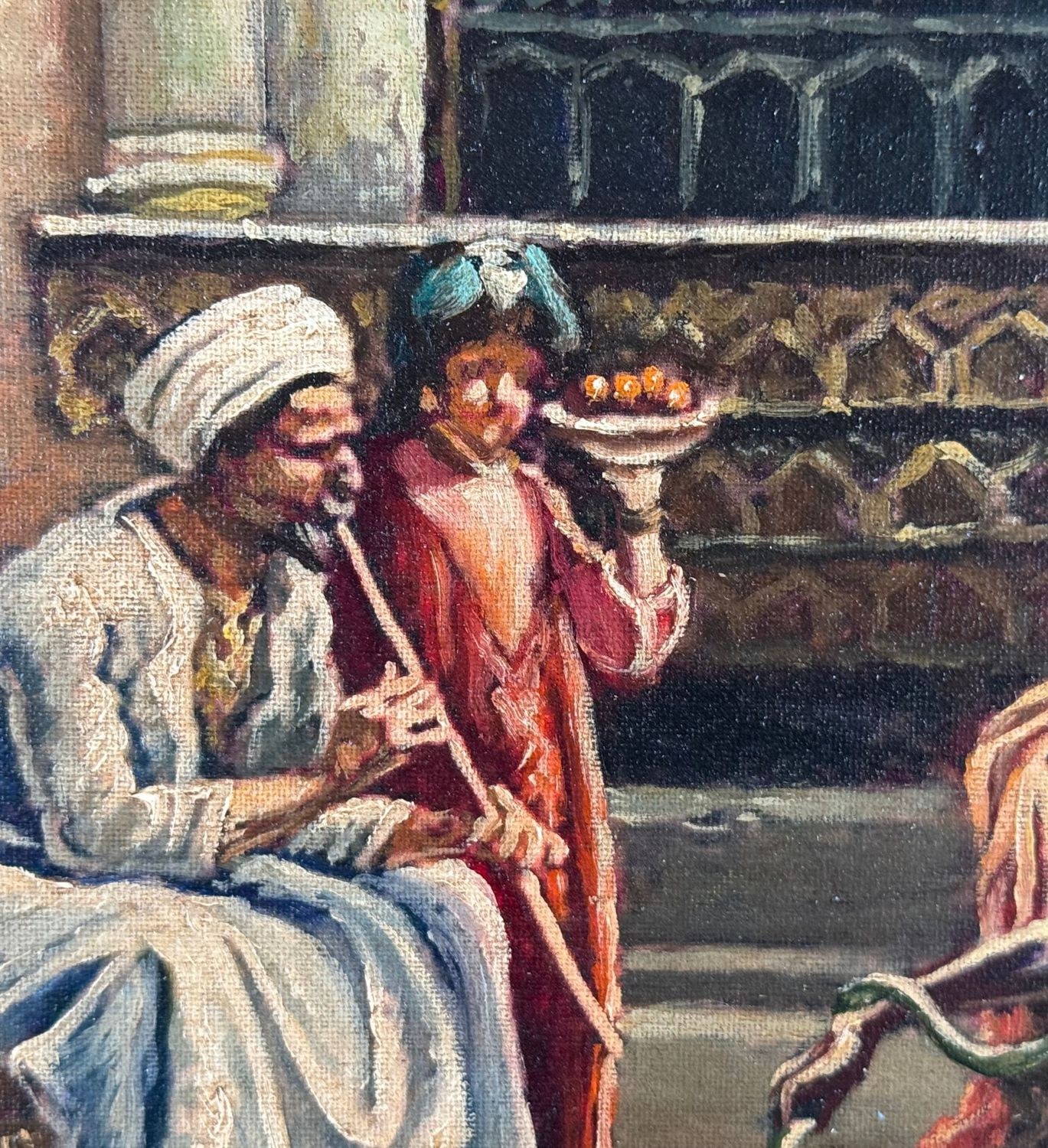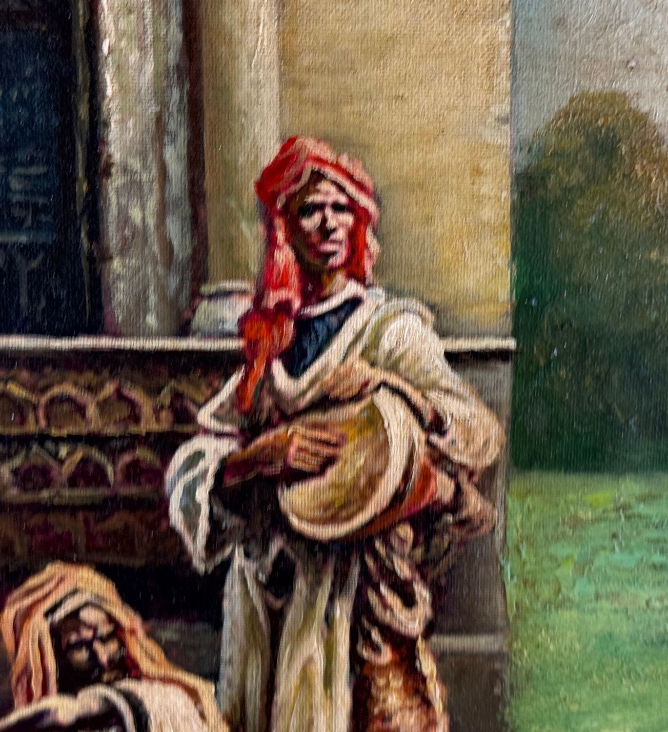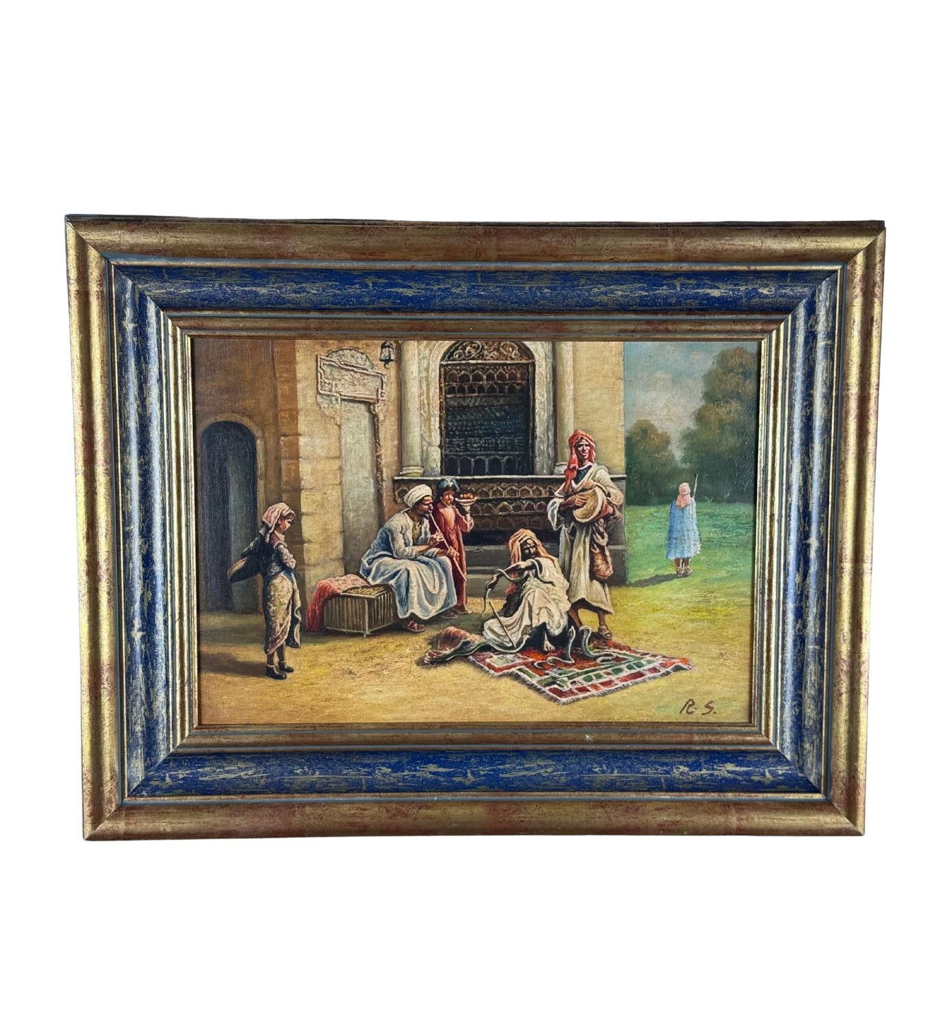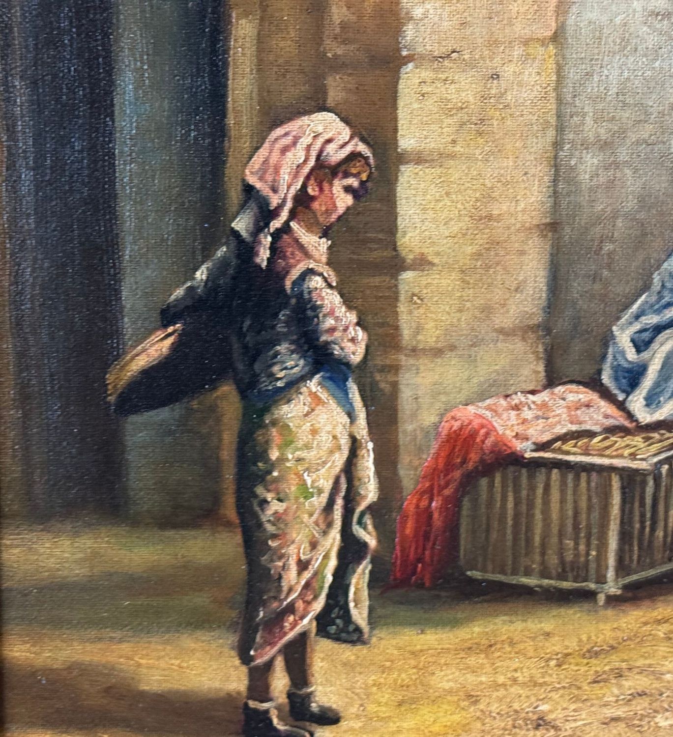 Oil painting on panel, 20th-century period, Italian school, depicting a scene with Oriental figures. Dimensions including frame: 68x53 cm. Inner frame dimensions: 35x50 cm. Bears initials at the lower right by an unidentified artist. The artwork is in good condition.