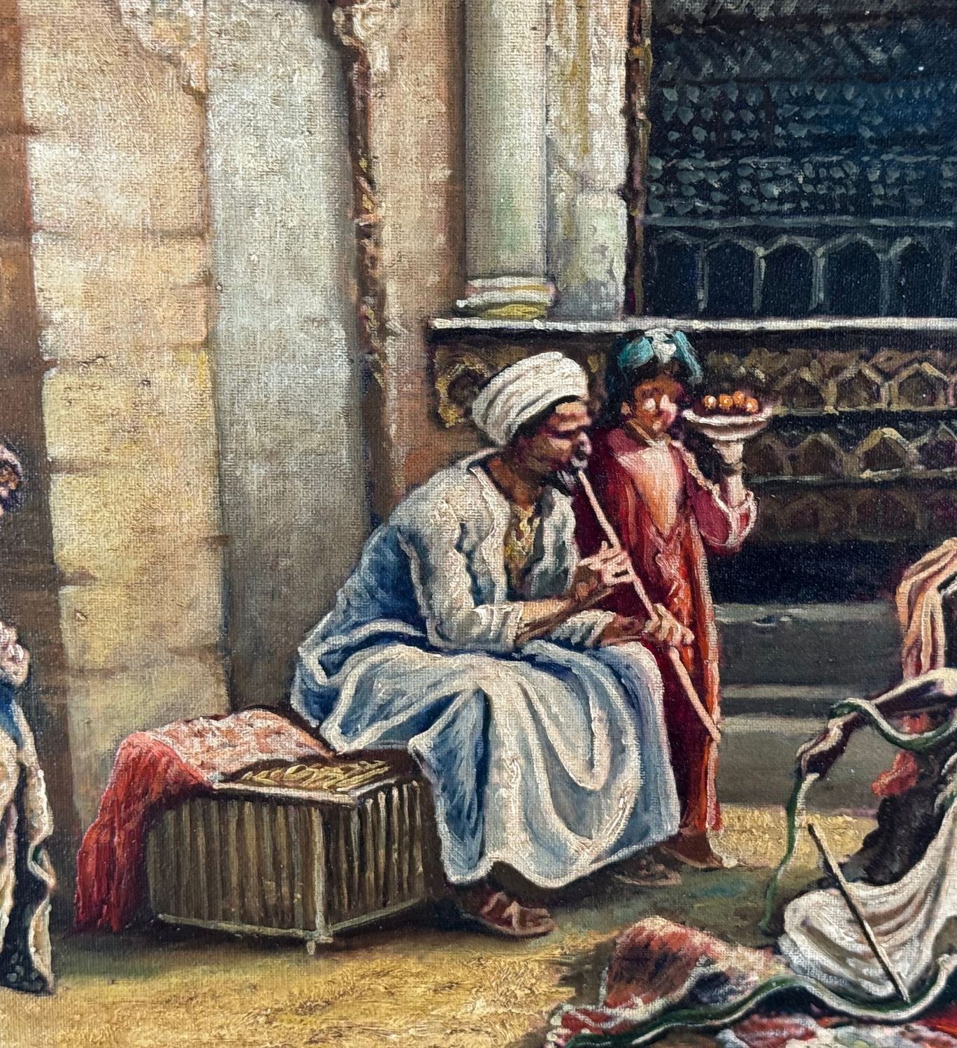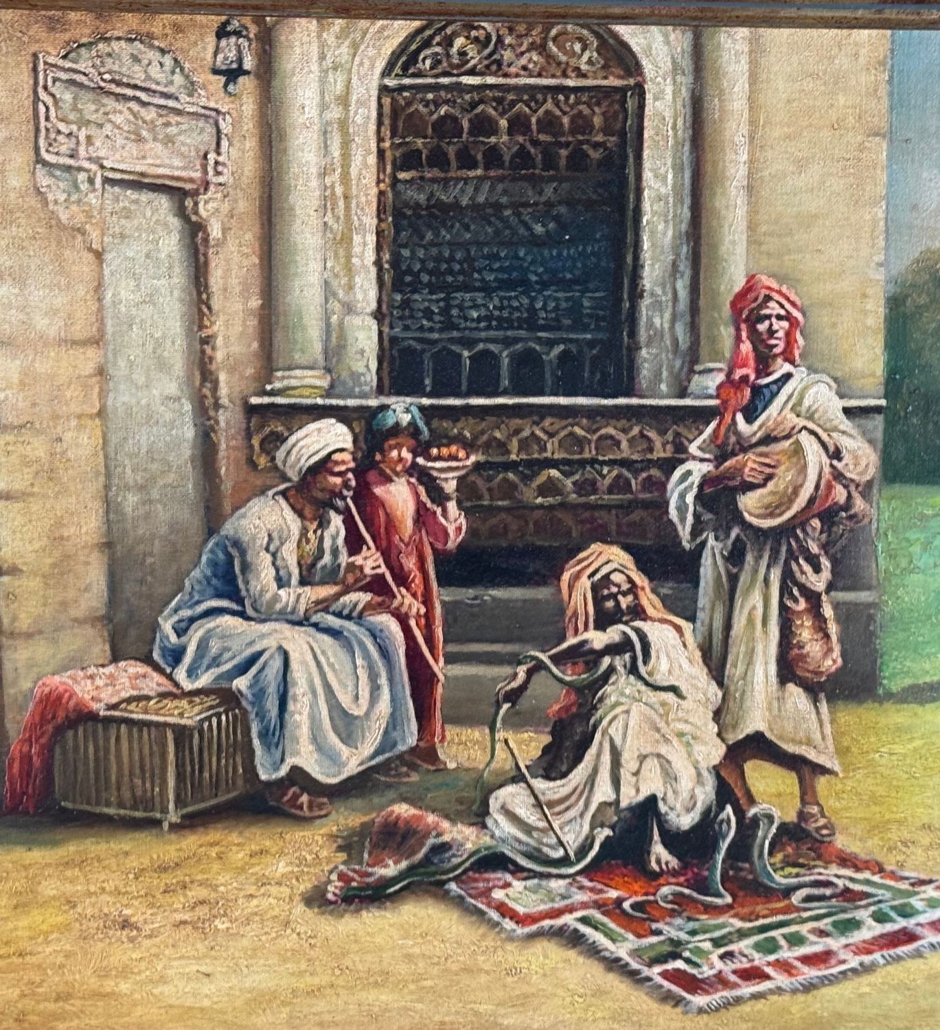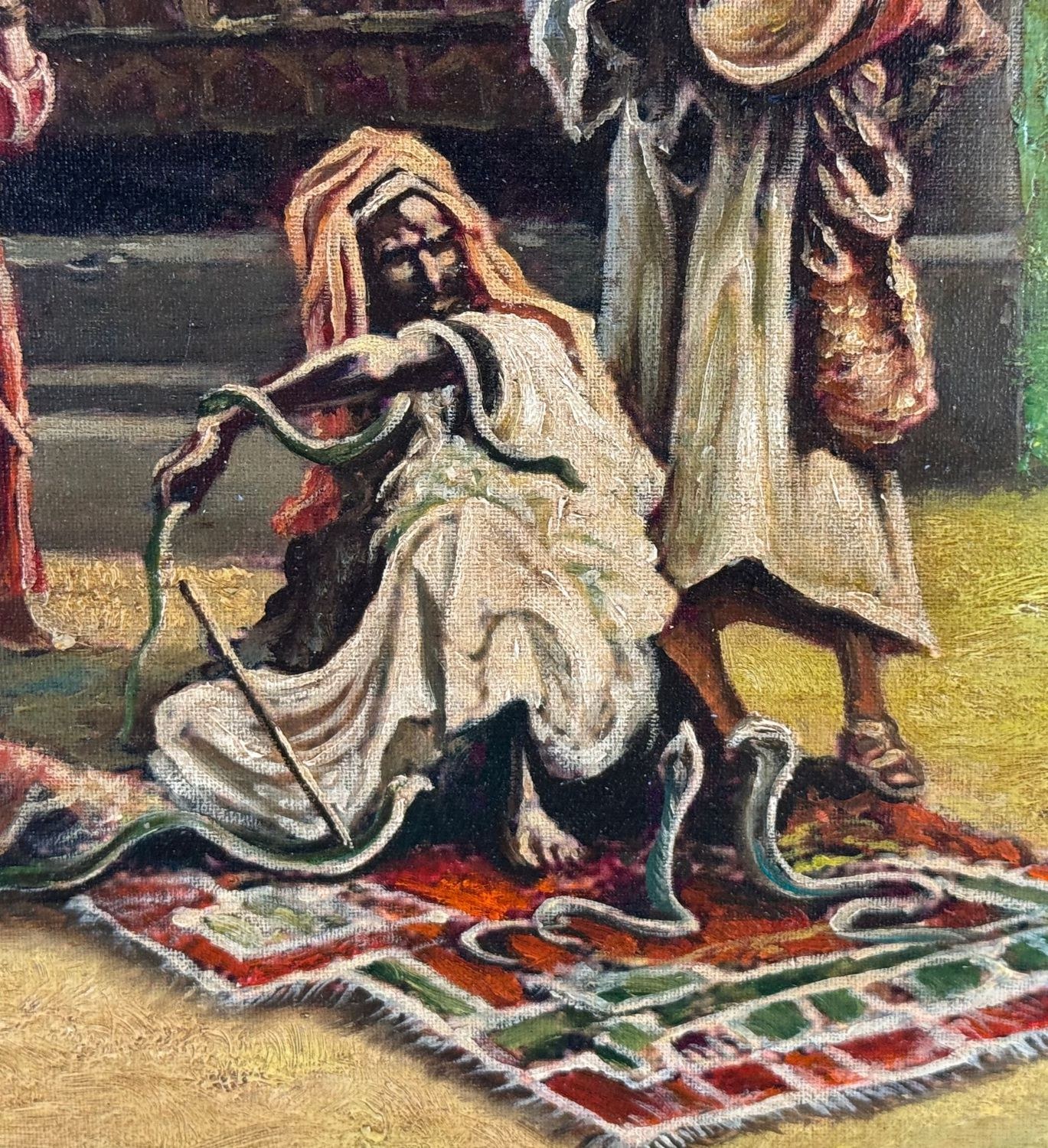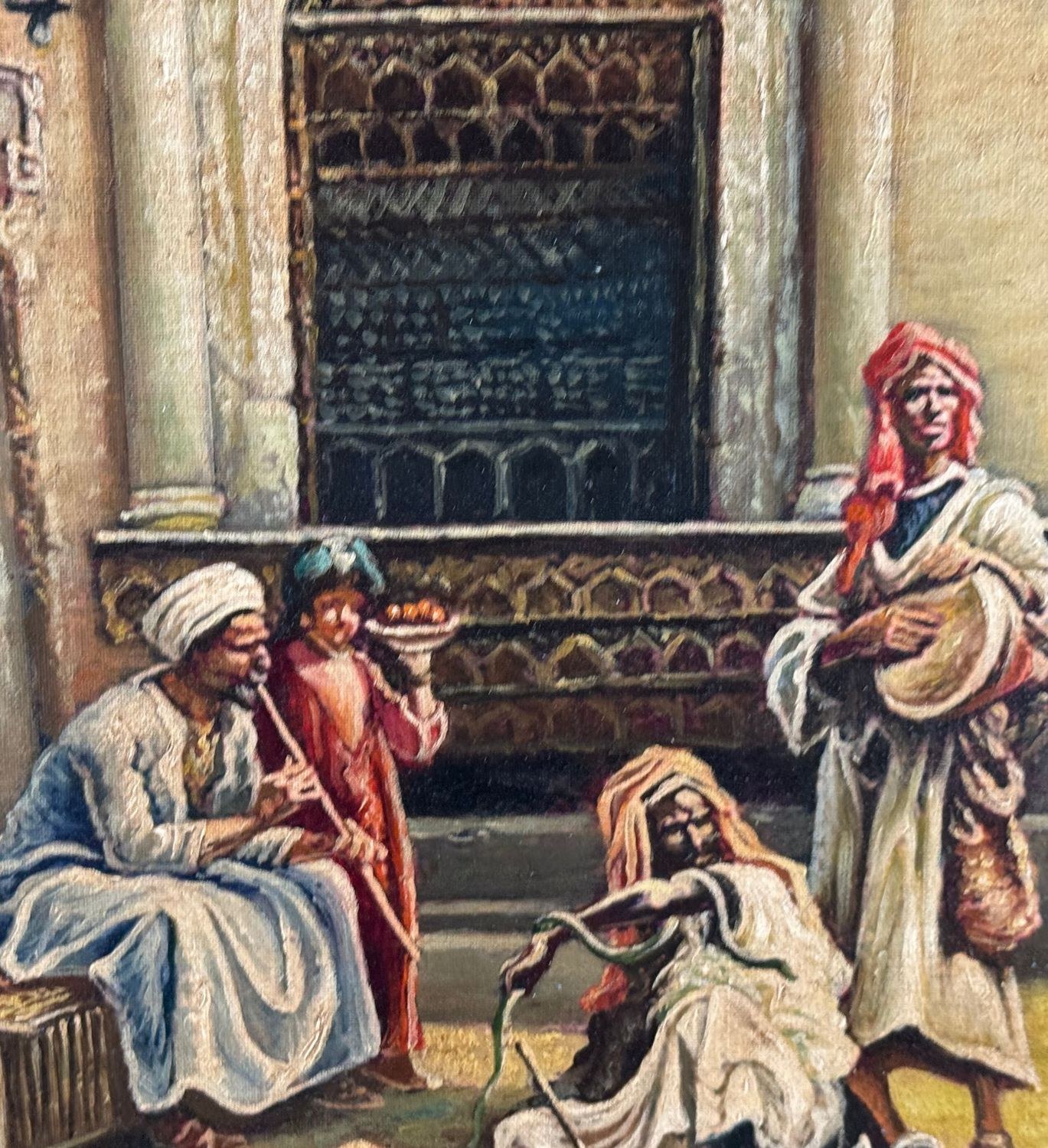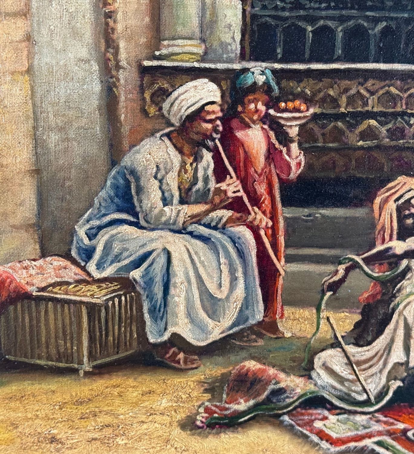 Oil painting on panel, 20th-century period, Italian school, depicting a scene with Oriental figures. Dimensions including frame: 68x53 cm. Inner frame dimensions: 35x50 cm. Bears initials at the lower right by an unidentified artist. The artwork is in good condition.