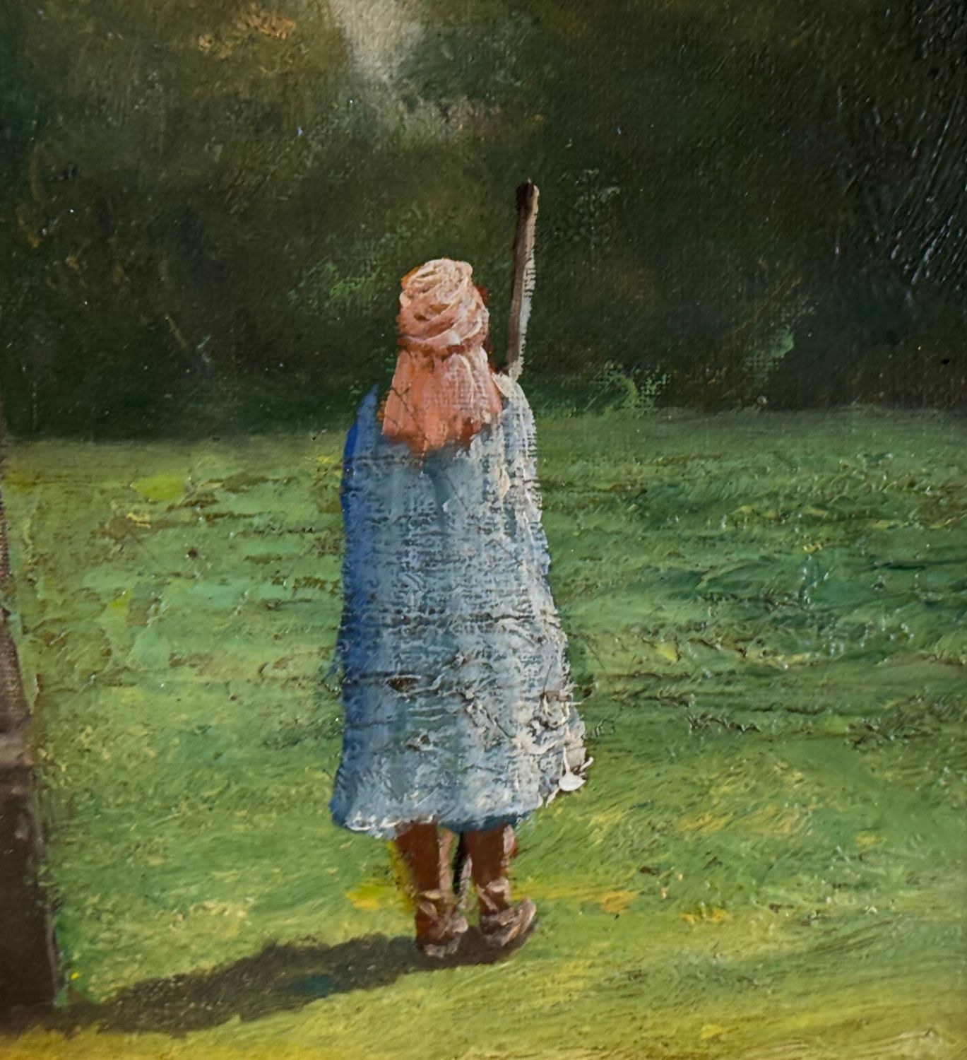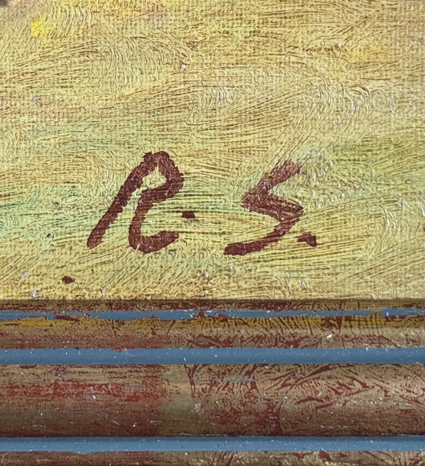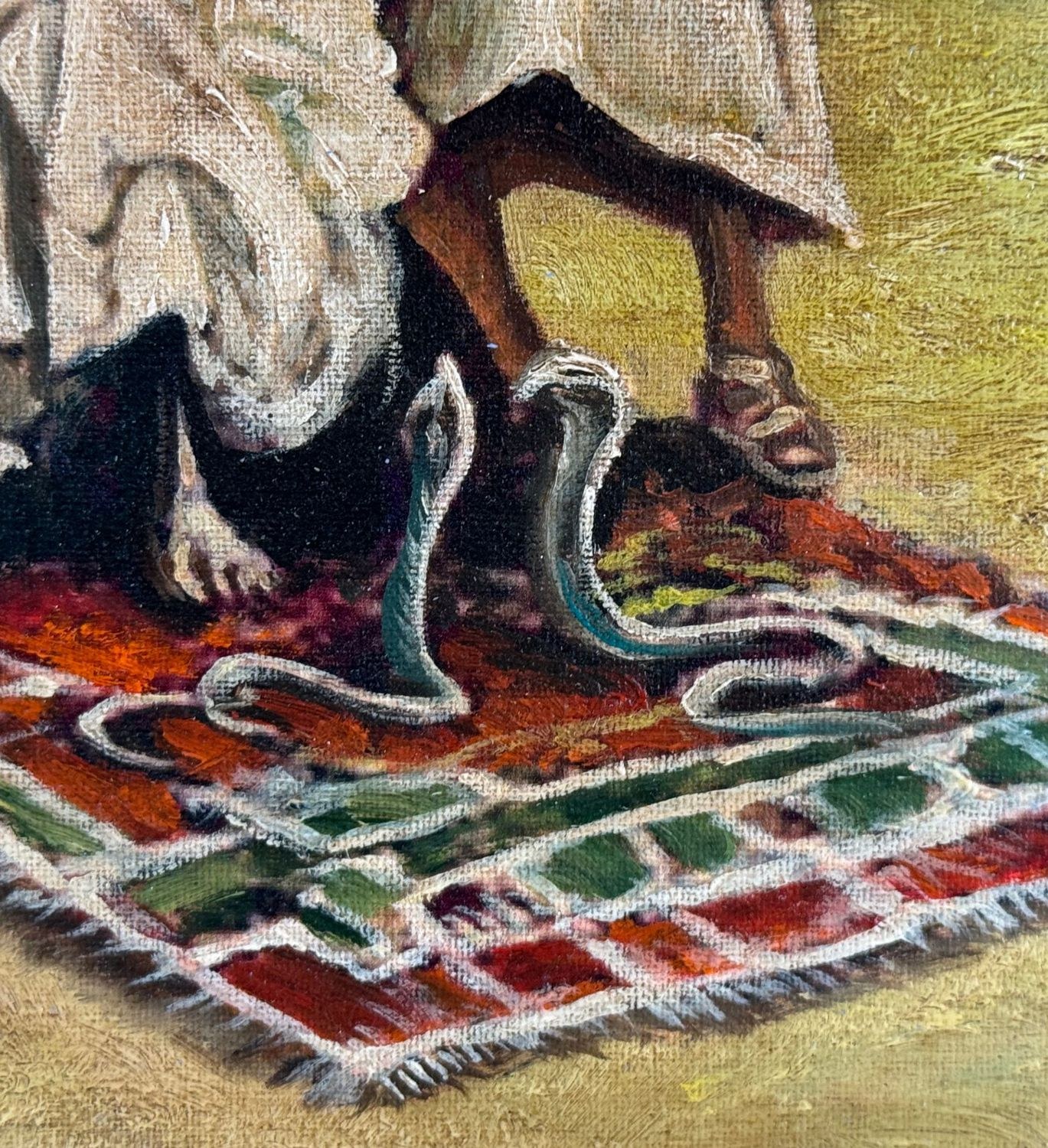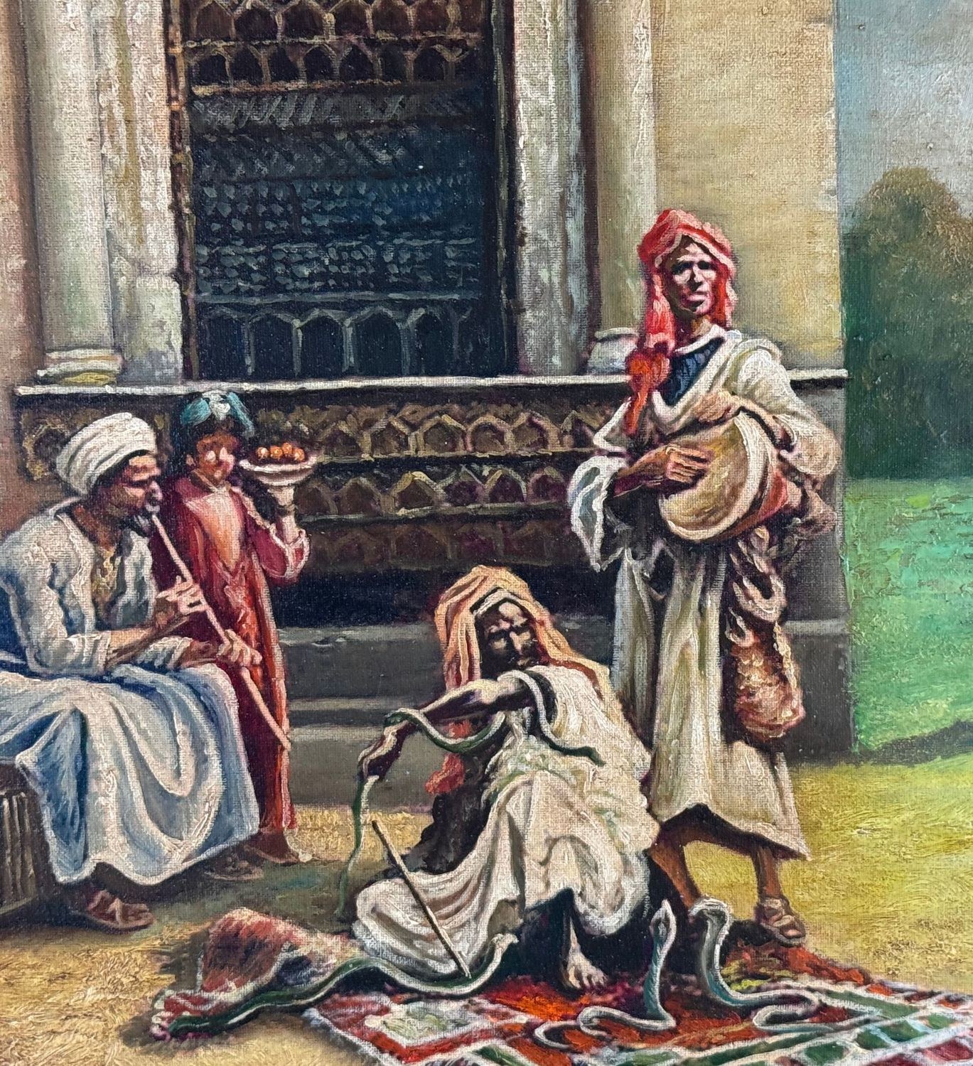 Oil painting on panel, 20th-century period, Italian school, depicting a scene with Oriental figures. Dimensions including frame: 68x53 cm. Inner frame dimensions: 35x50 cm. Bears initials at the lower right by an unidentified artist. The artwork is in good condition.