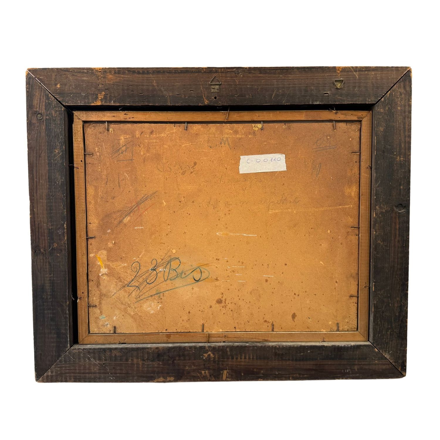 Oil painting on canvas applied to cardboard, from the 20th century, depicting Characters with a vintage building and car.