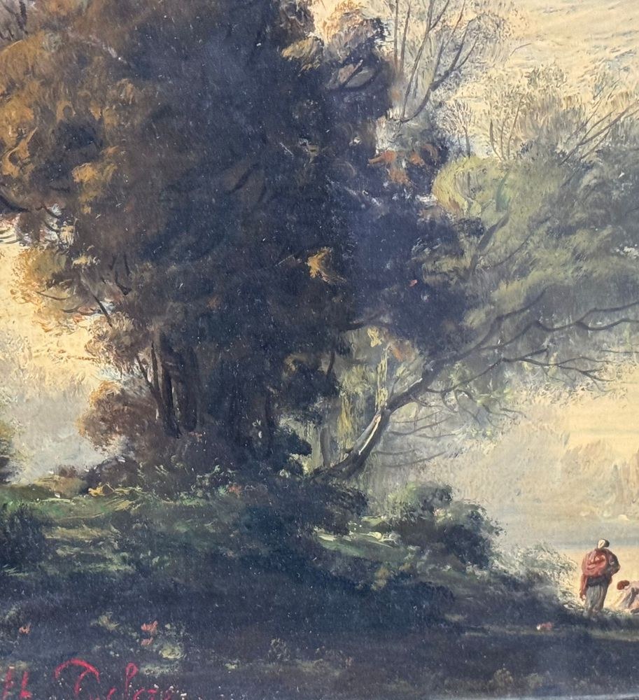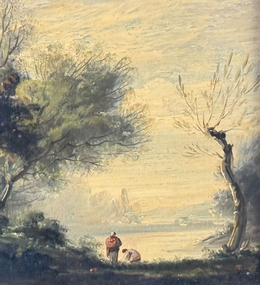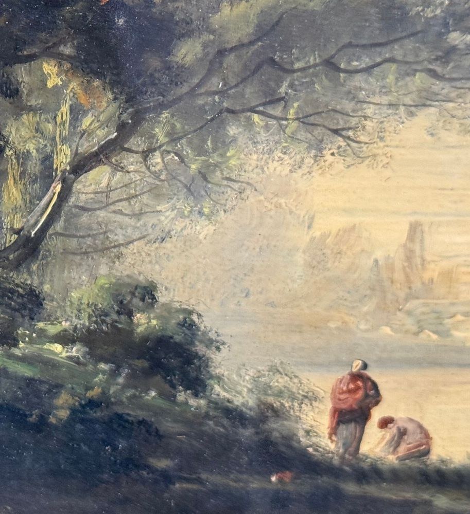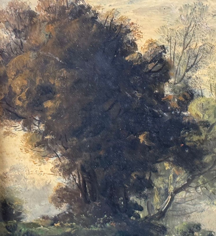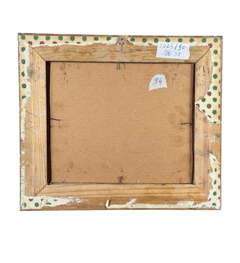 Oil on canvas laid on panel painting, 19th/20th century, Italian school, depicting a landscape. Dimensions including frame: 31 x 27 cm. Inner frame dimensions: 22 x 19 cm. Trace of a signature lower left by an unidentified artist. The artwork is in good condition.