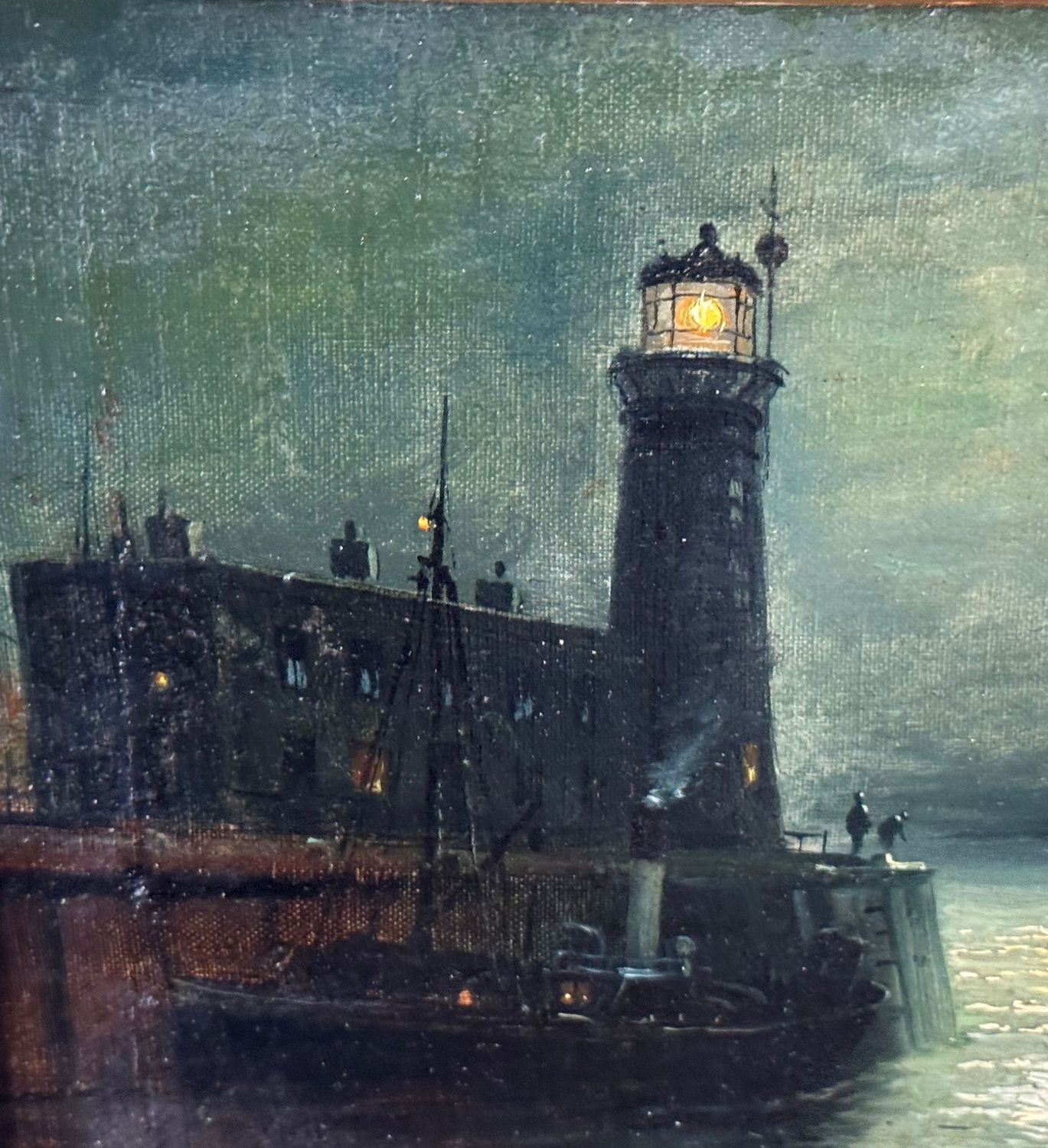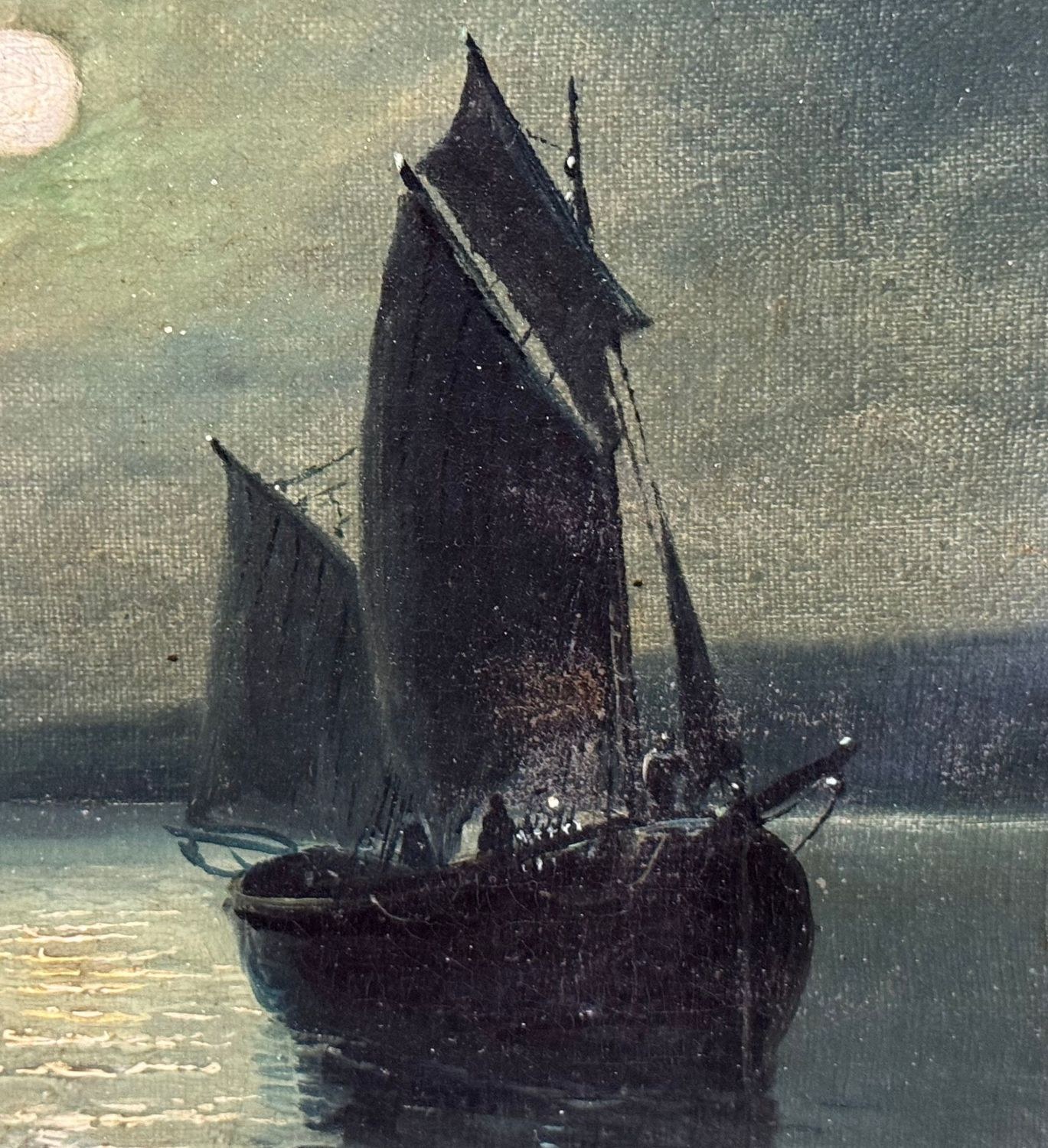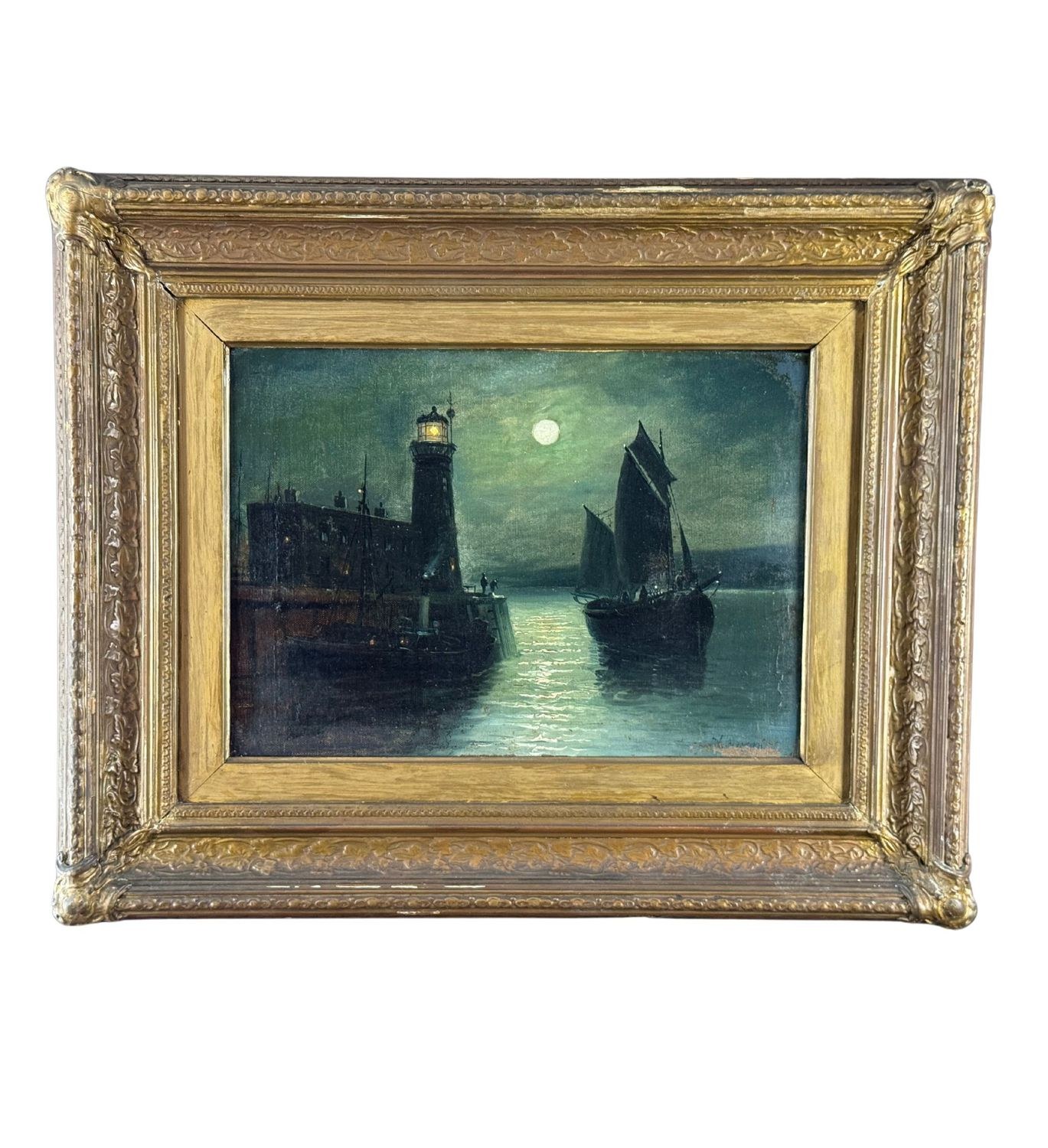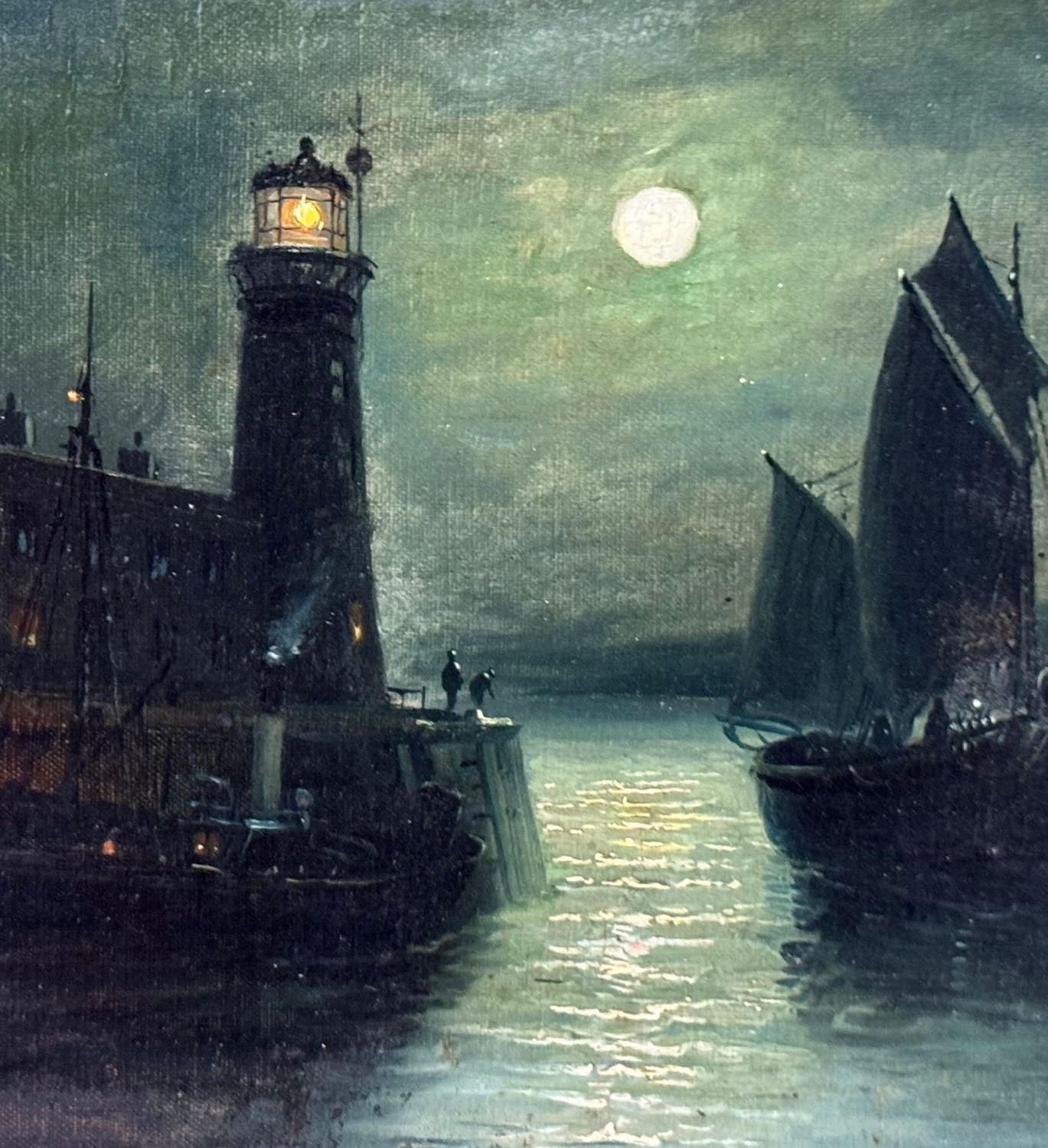Oil painting on canvas, 19th century, Italian school, depicting a nighttime scene with an illuminated lighthouse, a full moon reflecting on the water, and two boats, creating an evocative and serene atmosphere on the sea's surface. Dimensions including frame: 55x45 cm. Inner frame dimensions: 36x26 cm. The work is likely by the artist Walter Meegan. The artwork is in good condition with minor signs of aging, as shown in the attached photos. Noteworthy details include an old relining and a small area of paint loss in the lower right corner, near the signature.