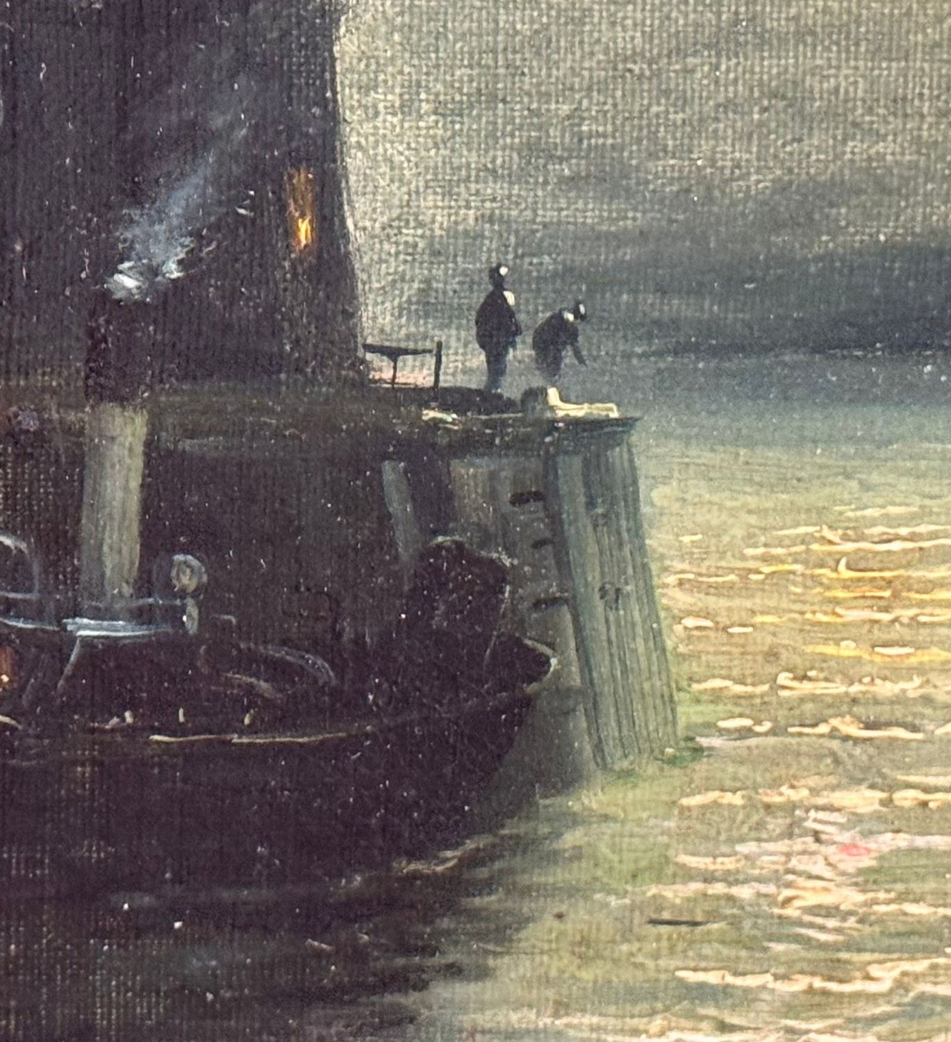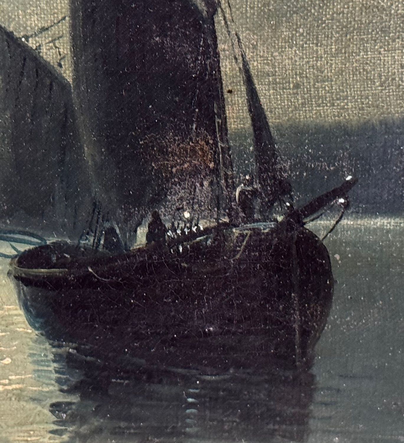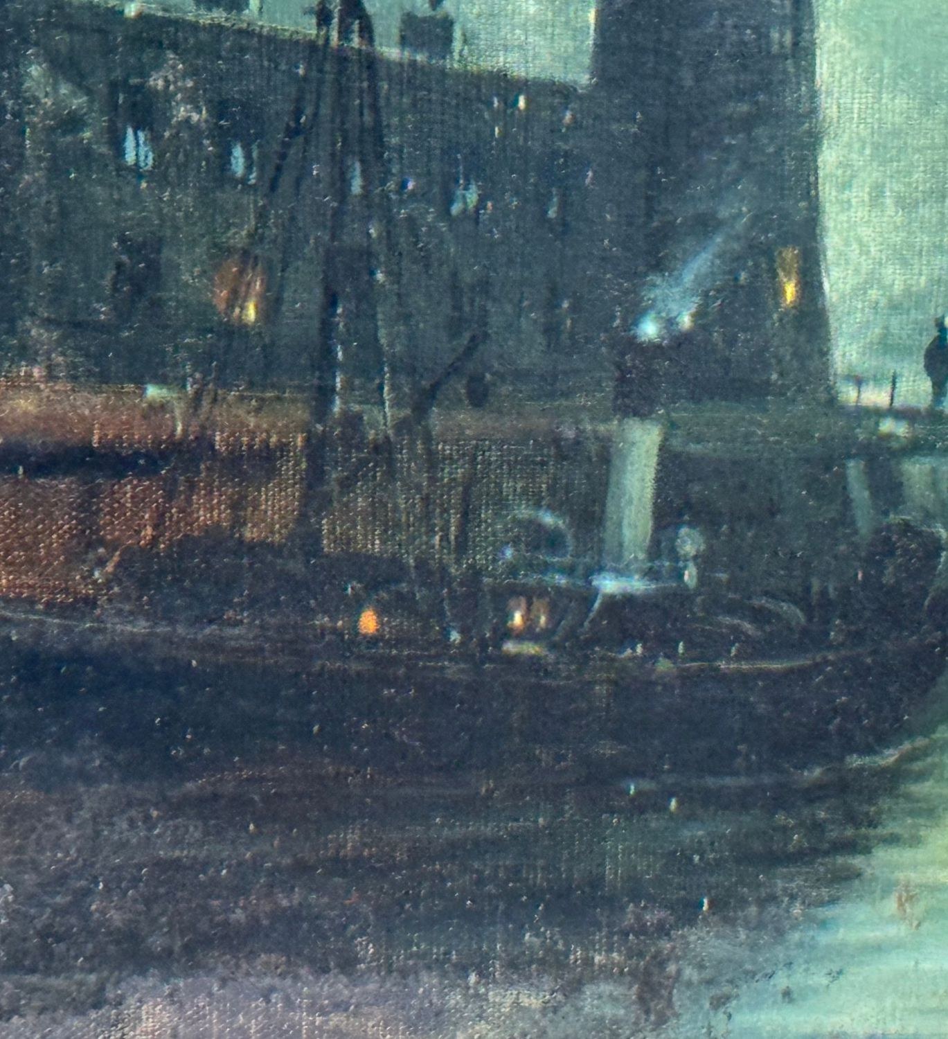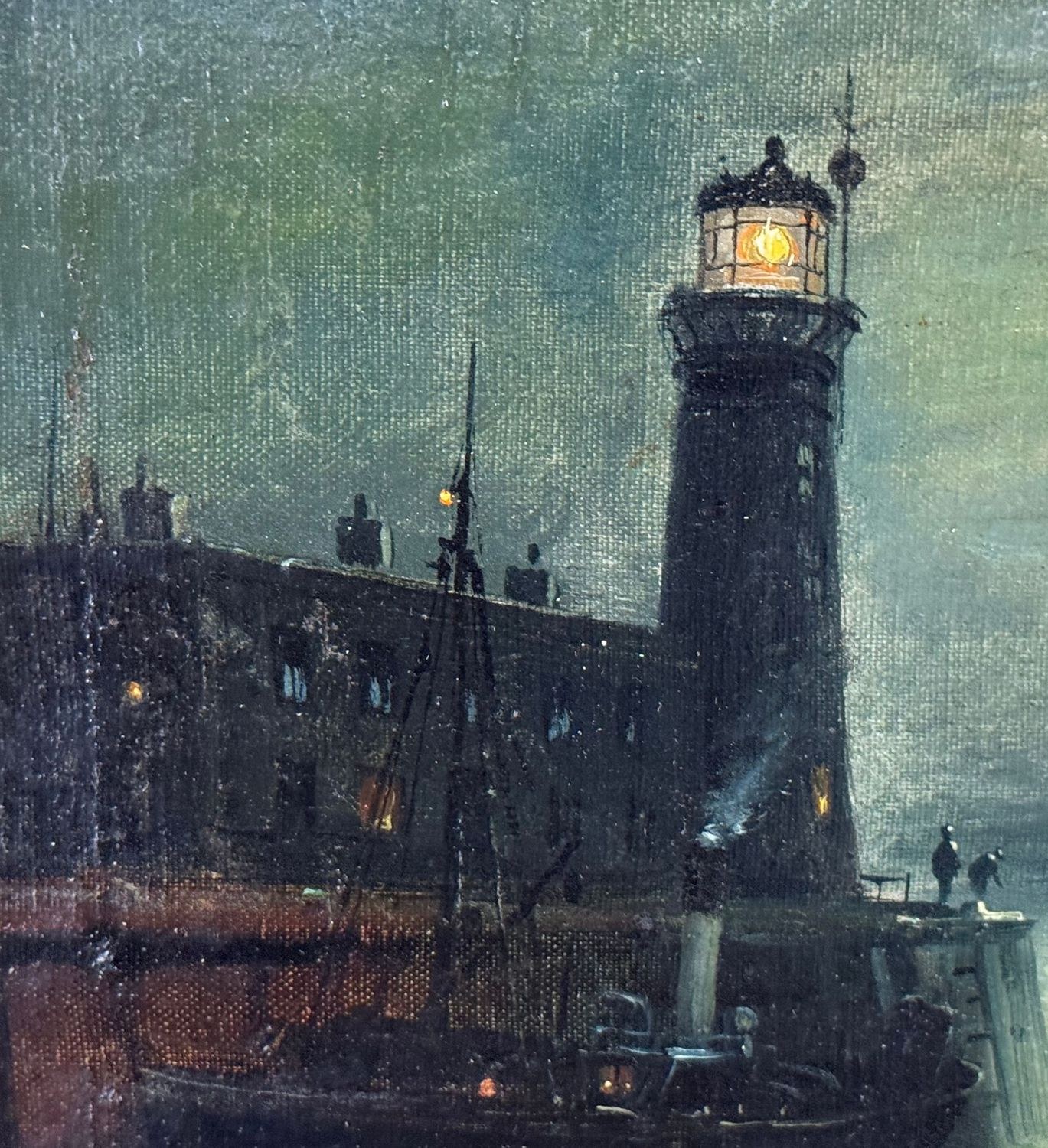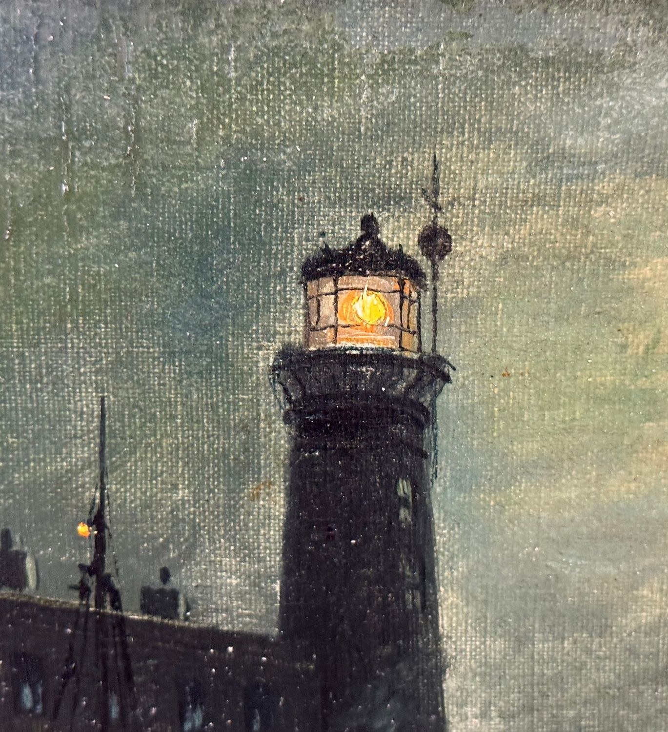 Oil painting on canvas, 19th century, Italian school, depicting a nighttime scene with an illuminated lighthouse, a full moon reflecting on the water, and two boats, creating an evocative and serene atmosphere on the sea's surface. Dimensions including frame: 55x45 cm. Inner frame dimensions: 36x26 cm. The work is likely by the artist Walter Meegan. The artwork is in good condition with minor signs of aging, as shown in the attached photos. Noteworthy details include an old relining and a small area of paint loss in the lower right corner, near the signature.