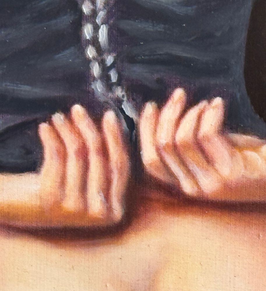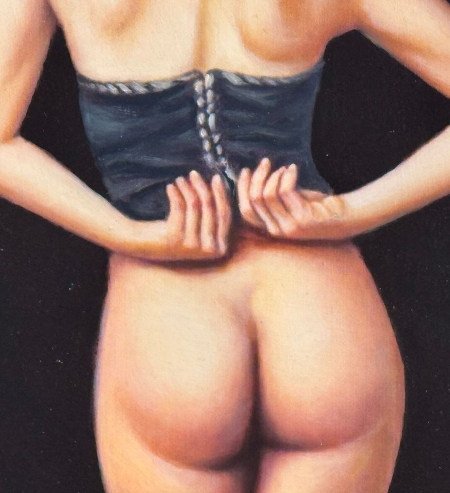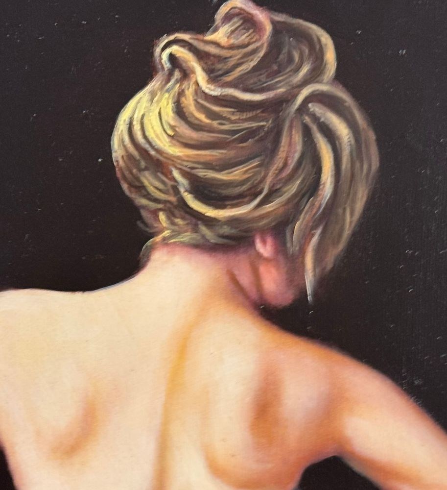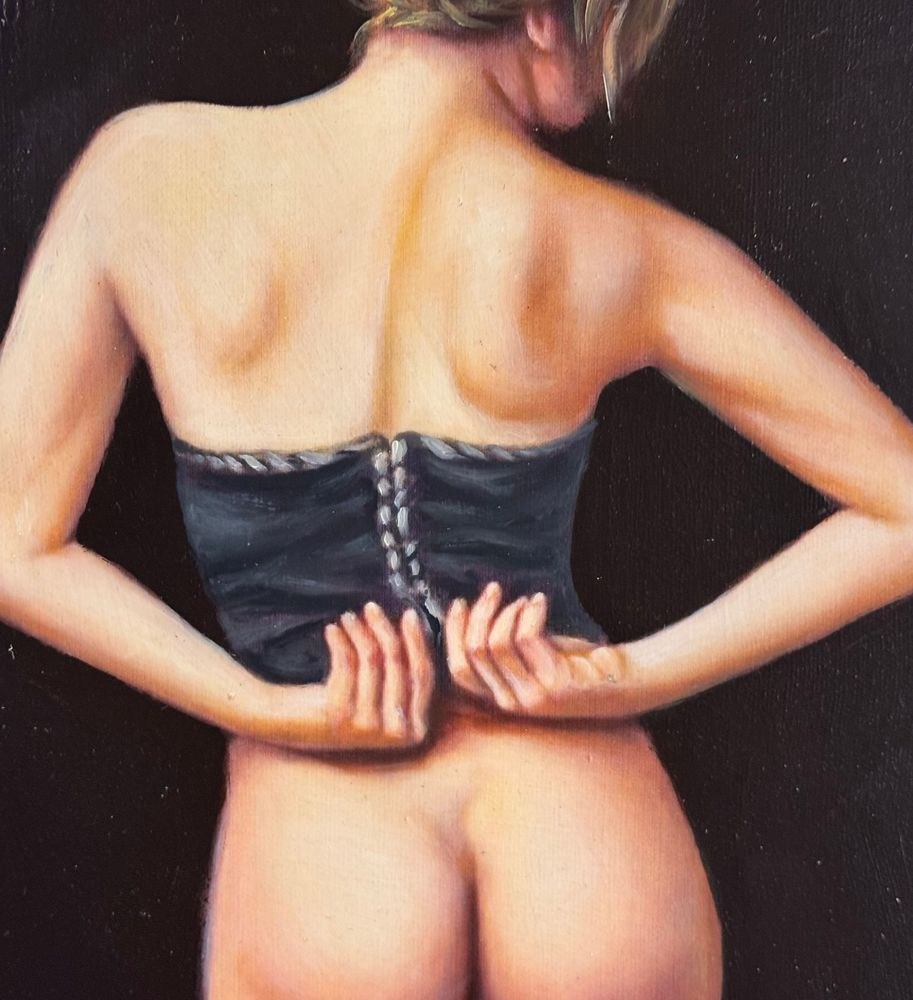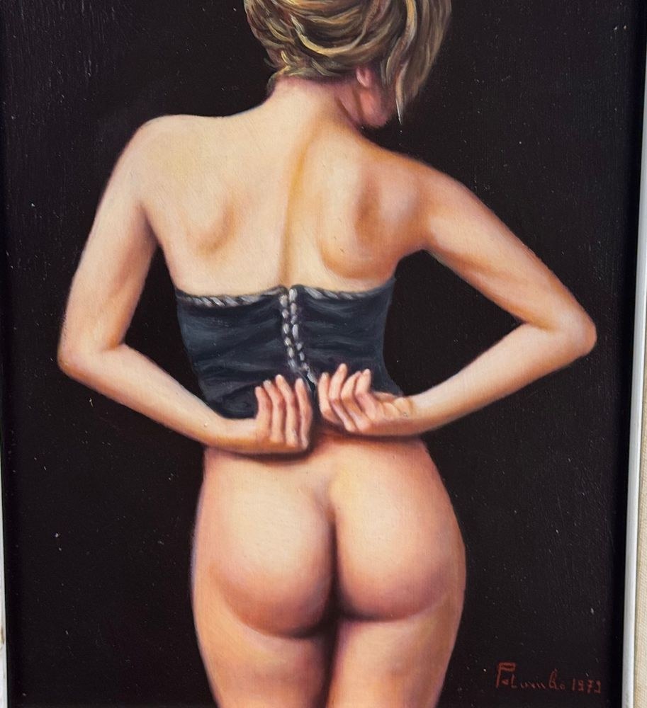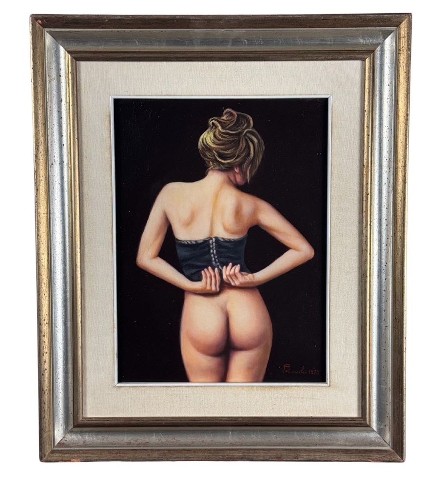 Oil painting on canvas, 20th century period, Italian school, depicting a Nude Woman seen from the back. Dimensions including frame: 50x60 cm. Inner frame dimensions: 30x40 cm. Signed at the bottom right and with an authenticity stamp on the back by an unidentified artist. The artwork is in good condition.