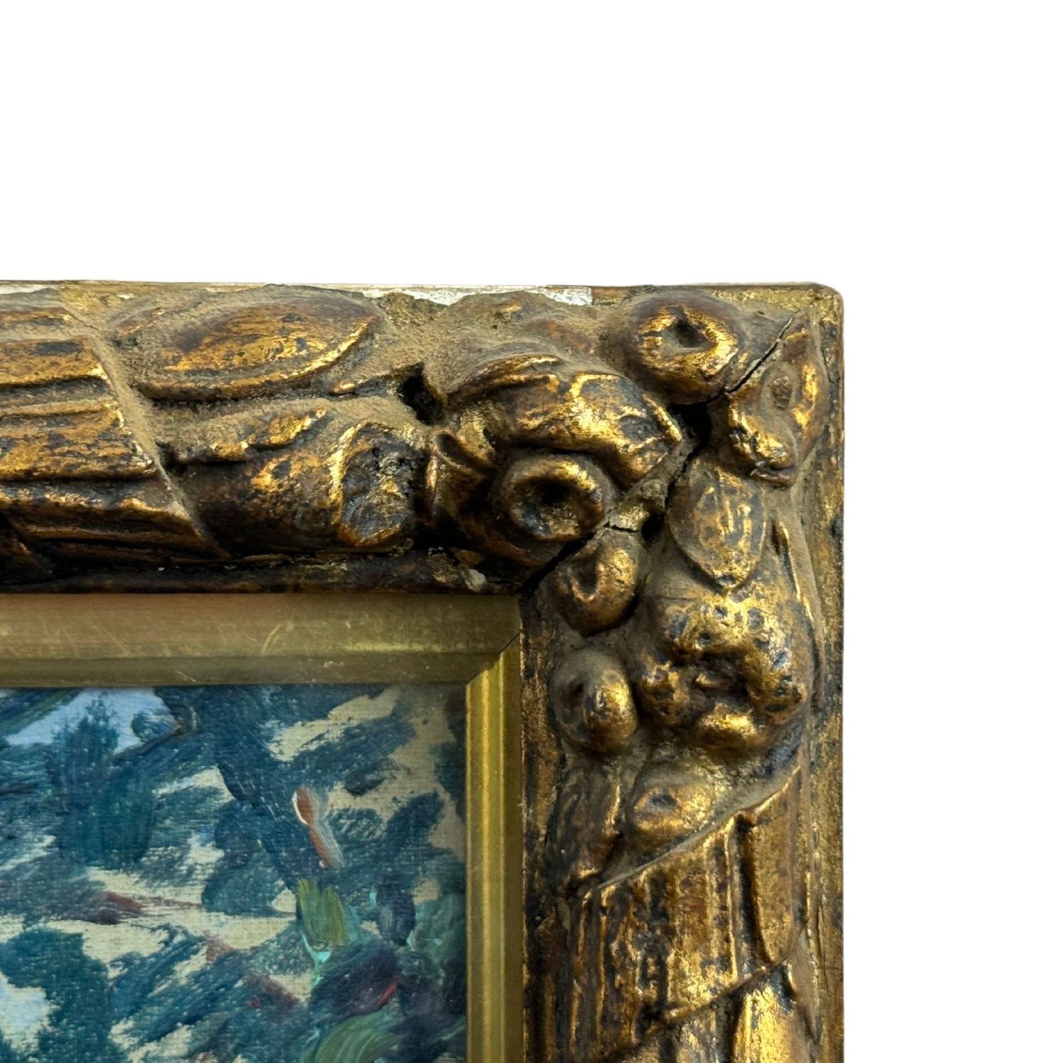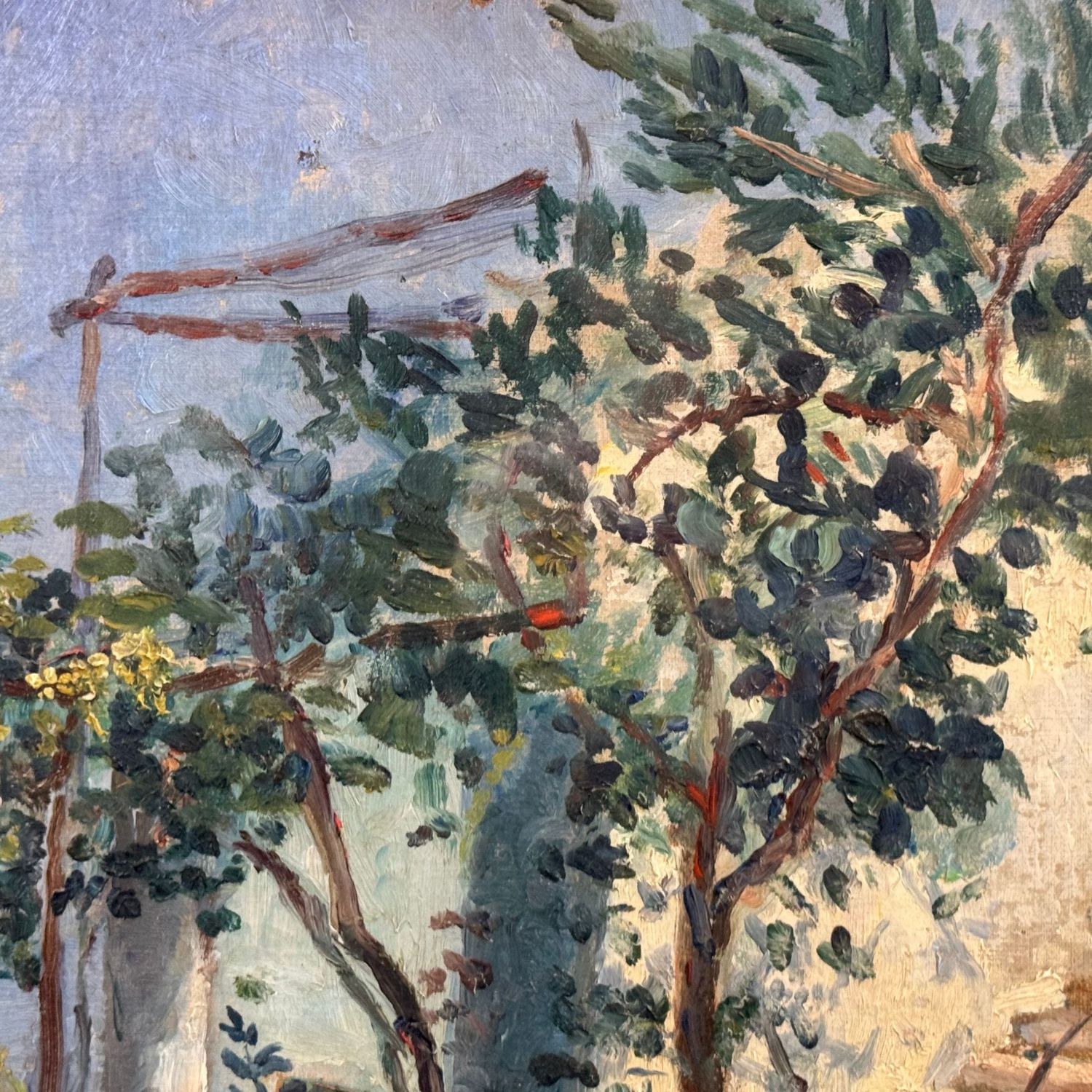 Oil painting on cardboard, 19th/20th century, depicting a pergola on a terrace overlooking a gulf.